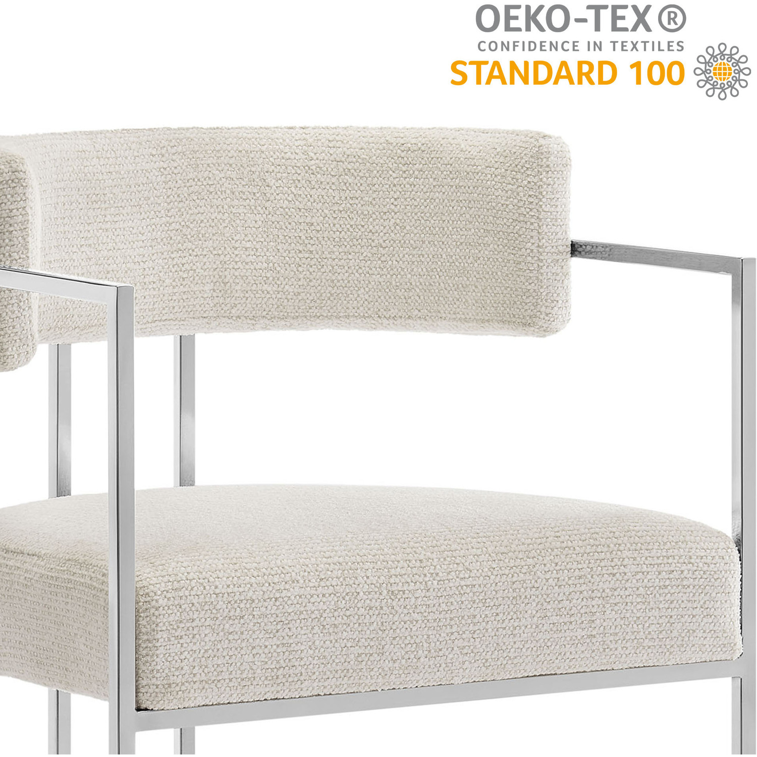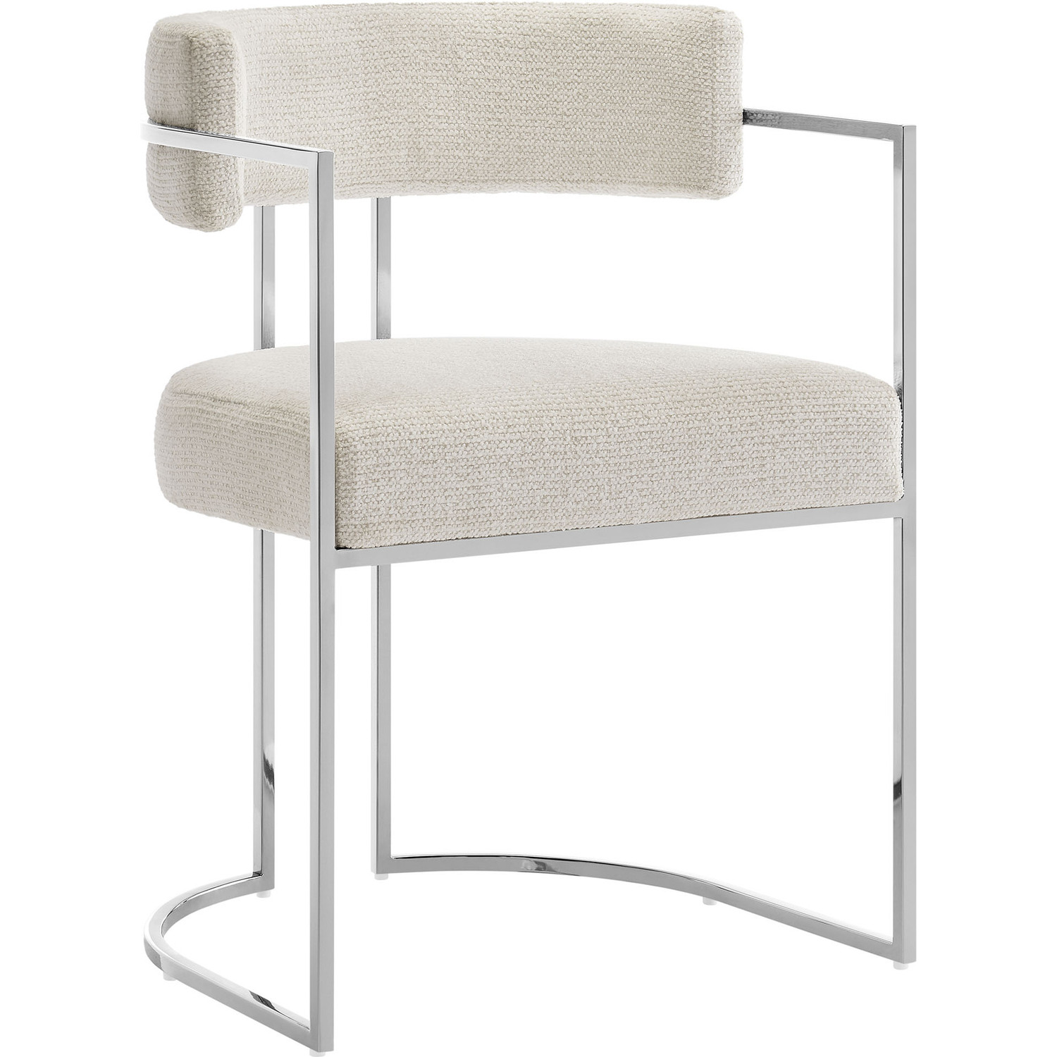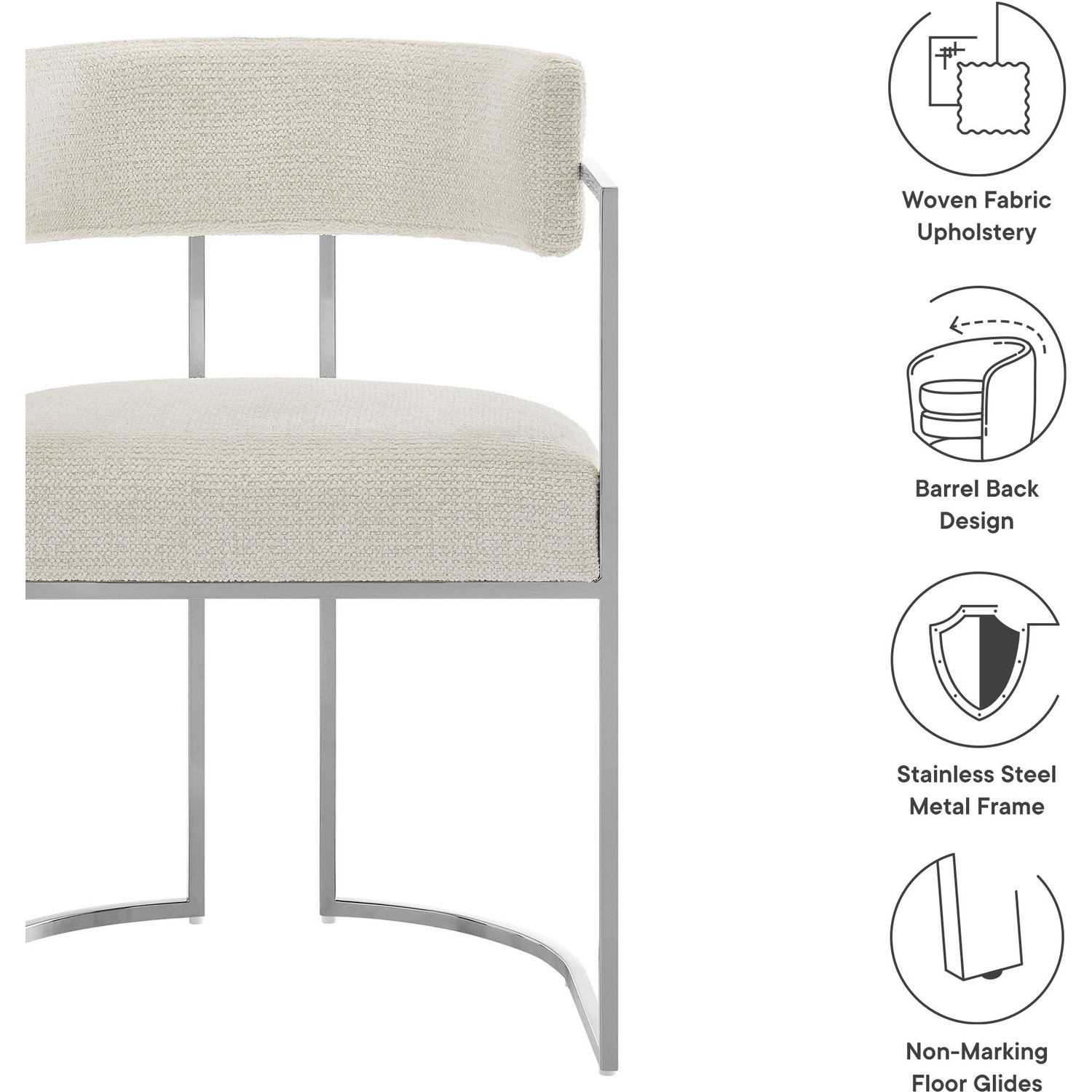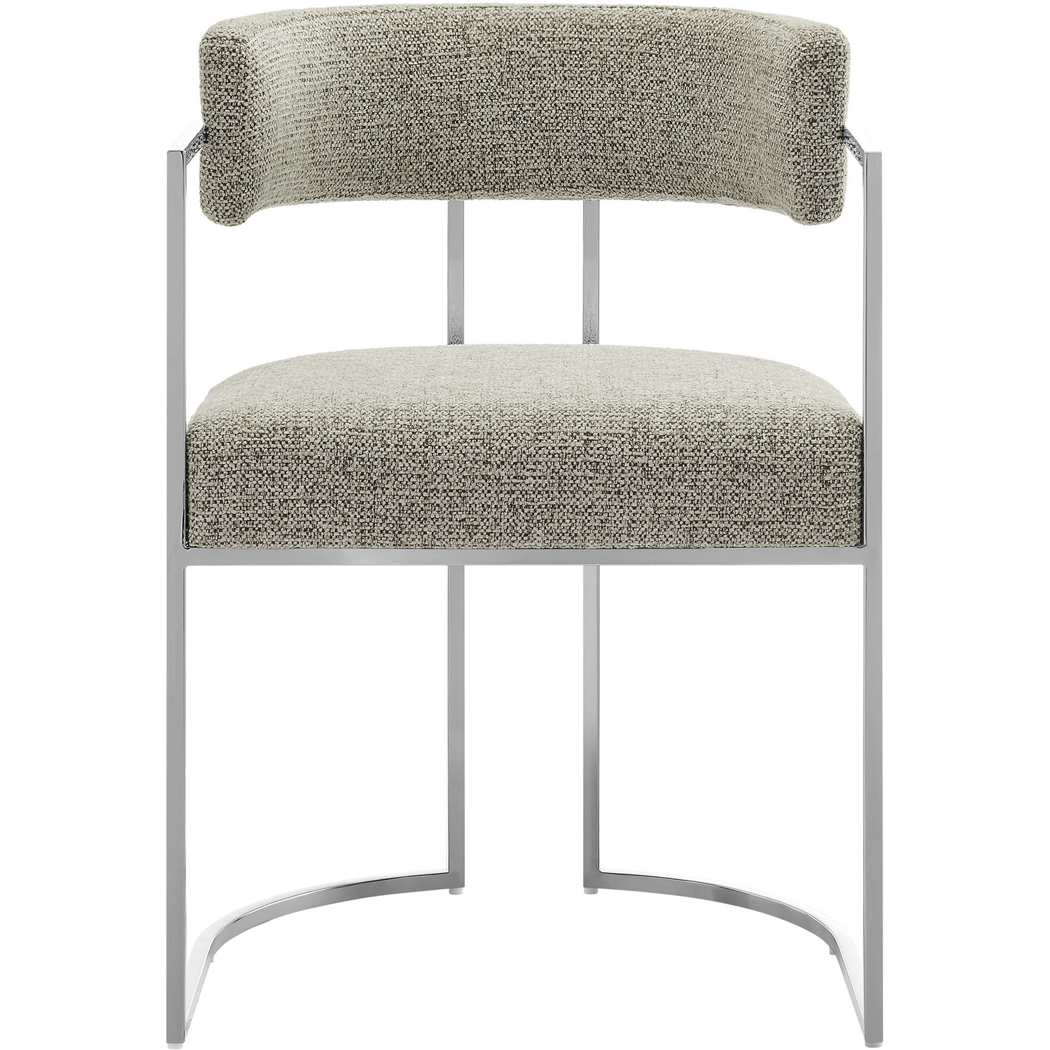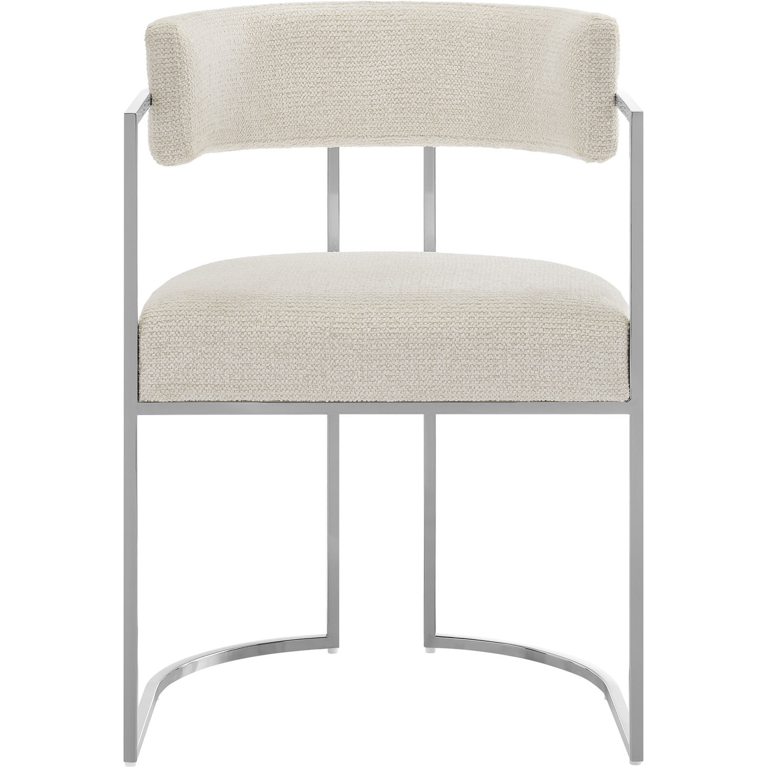 Elevate your dining room, living space, or workspace with the Huron Curved Back Dining Chair, a true fusion of artful design and functional comfort. Featuring a bold barrel silhouette with a curved metal frame and unique sled base, this modern dining chair offers a sleek, architectural profile that enhances contemporary interiors. Upholstered in soft woven fabric with a textured depth, the padded seat and backrest ensure luxurious comfort for dining, working, or relaxing. Better for you and the environment, the upholstery fabric is also OEKO-TEX® STANDARD 100 Certified. Perfect as a dining chair, accent chair, vanity chair, or desk chair, Huron's sculptural shape and supportive arms add sophistication and retro style to any room. Designed for effortless living with 70's flair, this upholstered chair with metal frame includes adjustable non-marking floor glides to protect surfaces and arrives fully assembled for immediate use. Weight Capacity: 300 lbs.Modern Barrel Dining Chair