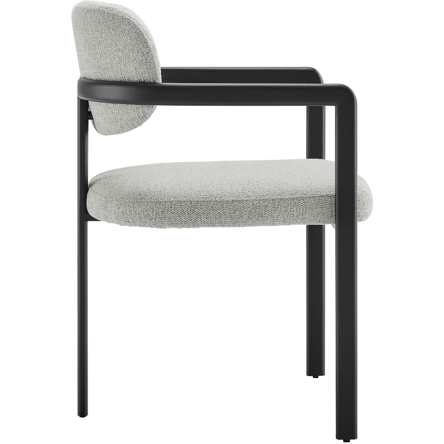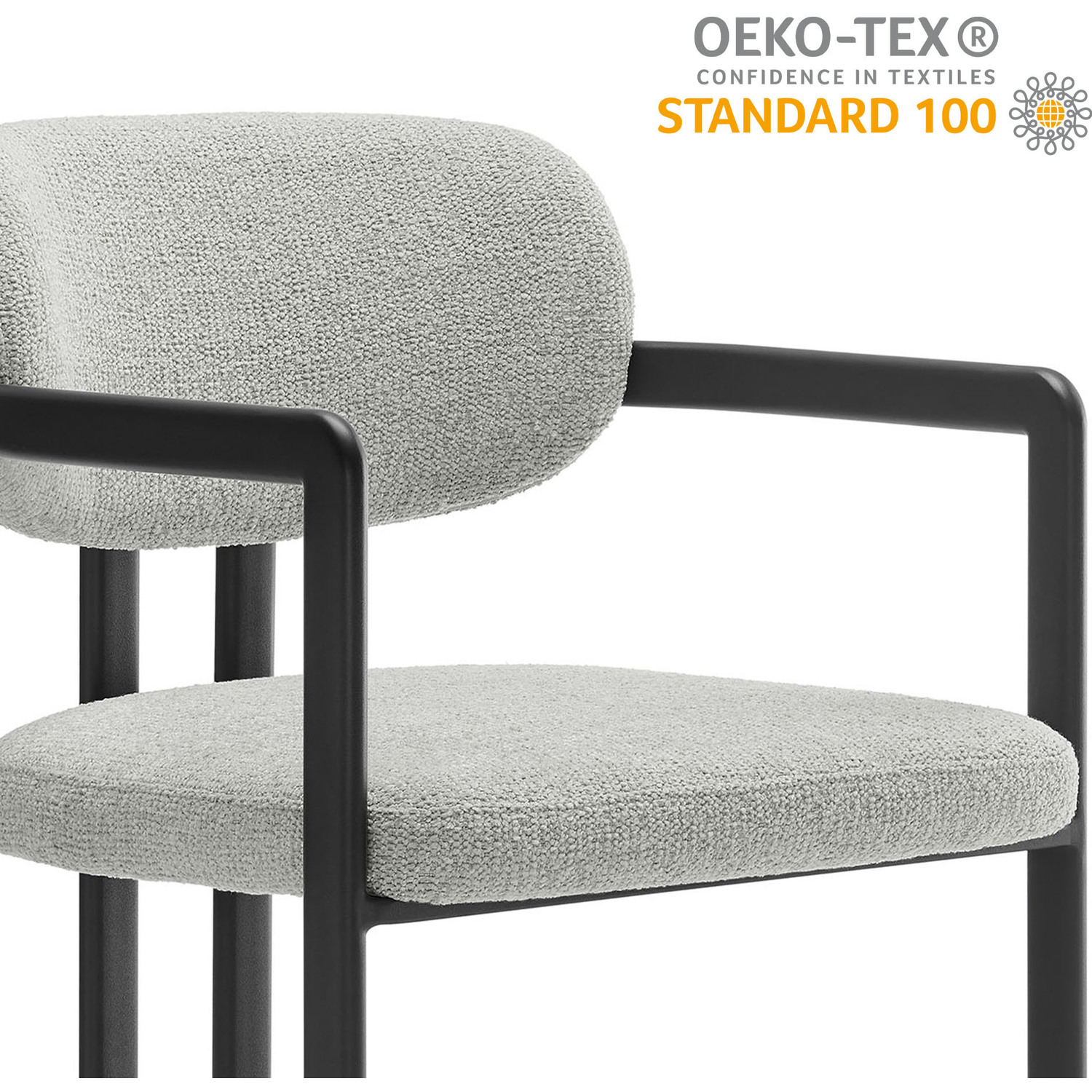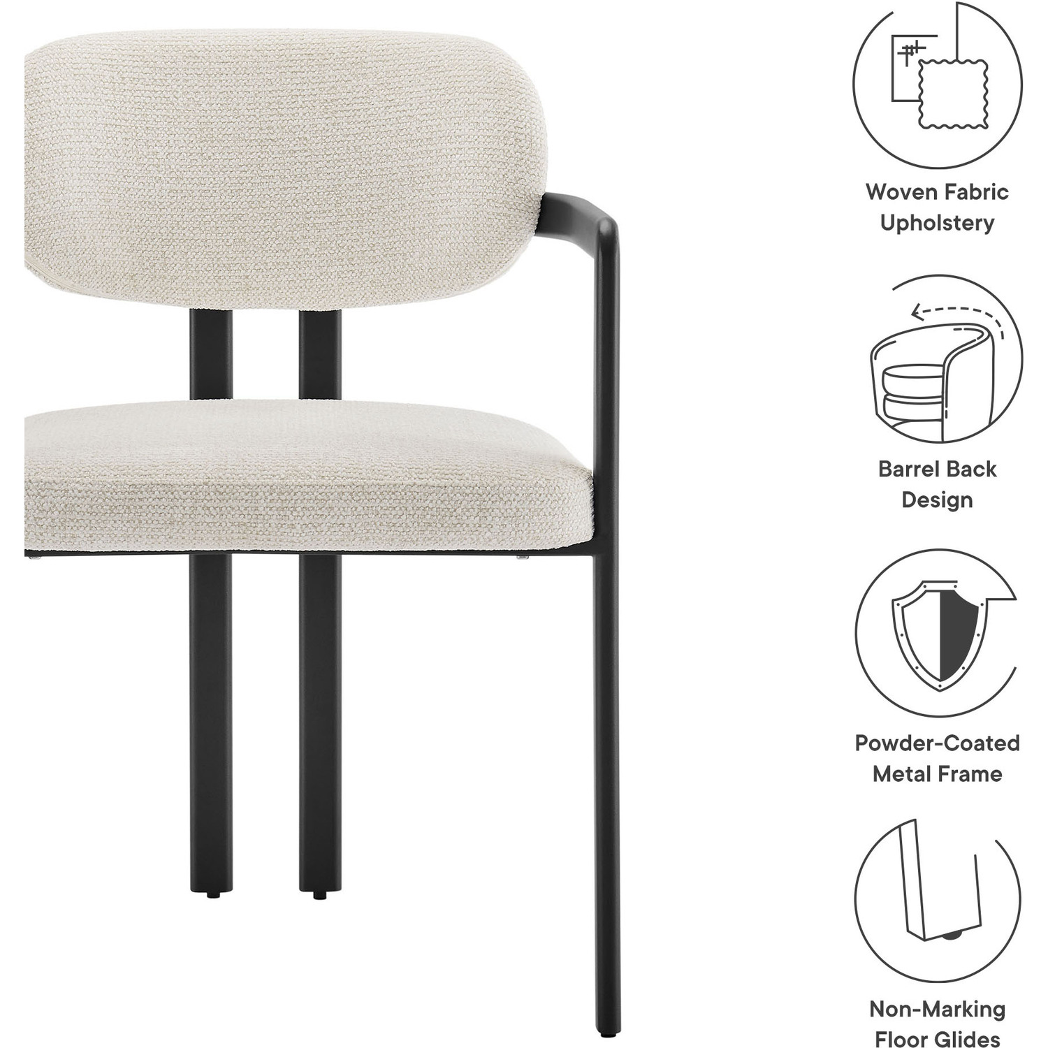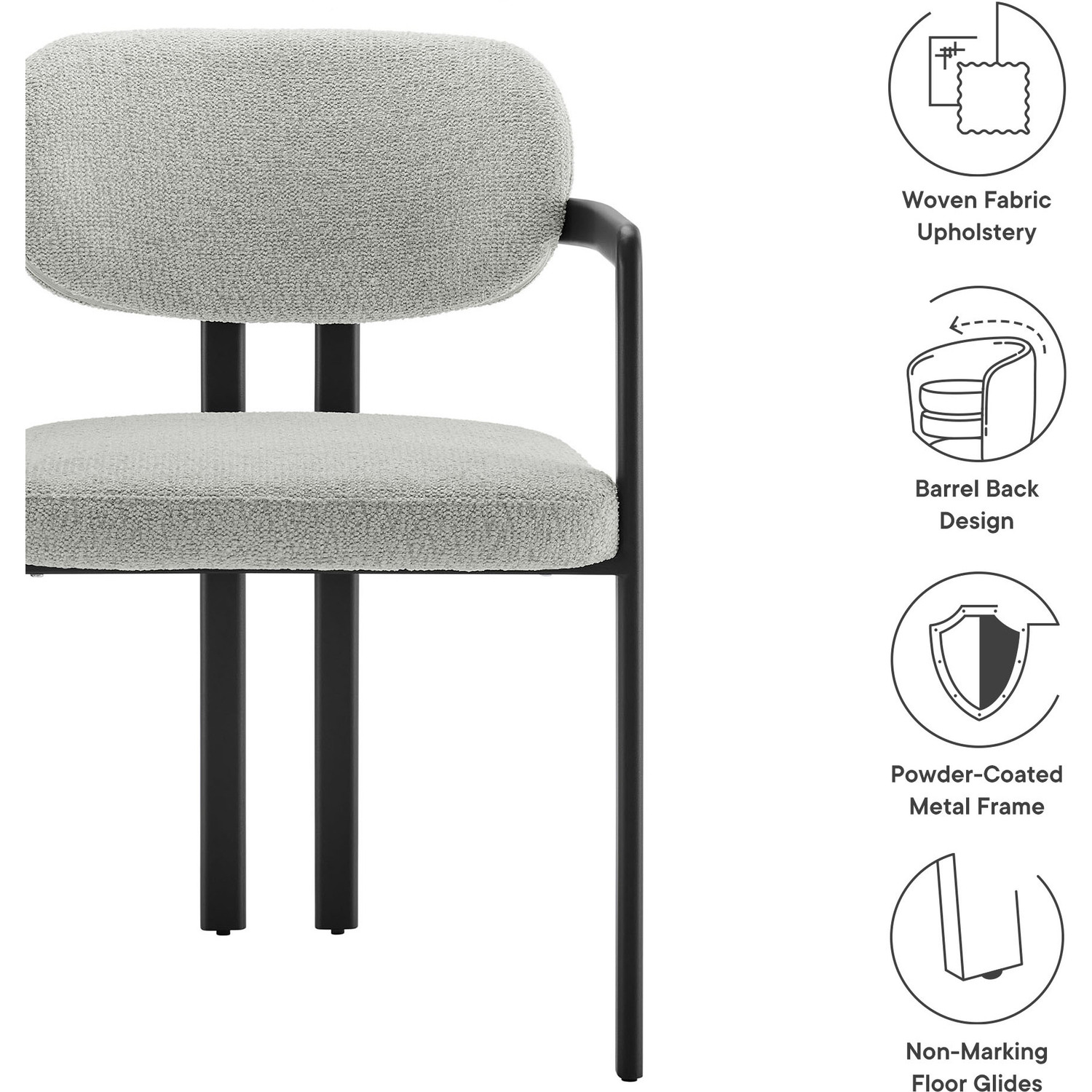 Infuse your dining or living space with the modern sophistication of the Elio Dining Chair. Combining angular metal framing with a rounded barrel chair design, this open back dining chair is a harmonious balance of geometry and softness. Its powder-coated metal frame features clean lines and a sculptural silhouette, while the padded seat and backrest of this upholstered chair are covered in a richly textured woven fabric for a tactile, cozy feel. Better for you and the environment, the upholstery fabric is also OEKO-TEX® STANDARD 100 certified. The open-back design adds an airy elegance, making Elio equally suited as a dining chair, accent chair, or office chair. Fully assembled and equipped with adjustable non-marking floor glides, this modern barrel chair ensures hassle-free setup and floor protection. Whether placed in a contemporary dining room, a cozy breakfast nook, or a stylish workspace, the Elio Dining Chair makes a statement with its modern charm and versatile design. Weight Capacity: 300 lbs.Modern Barrel Dining Chair
