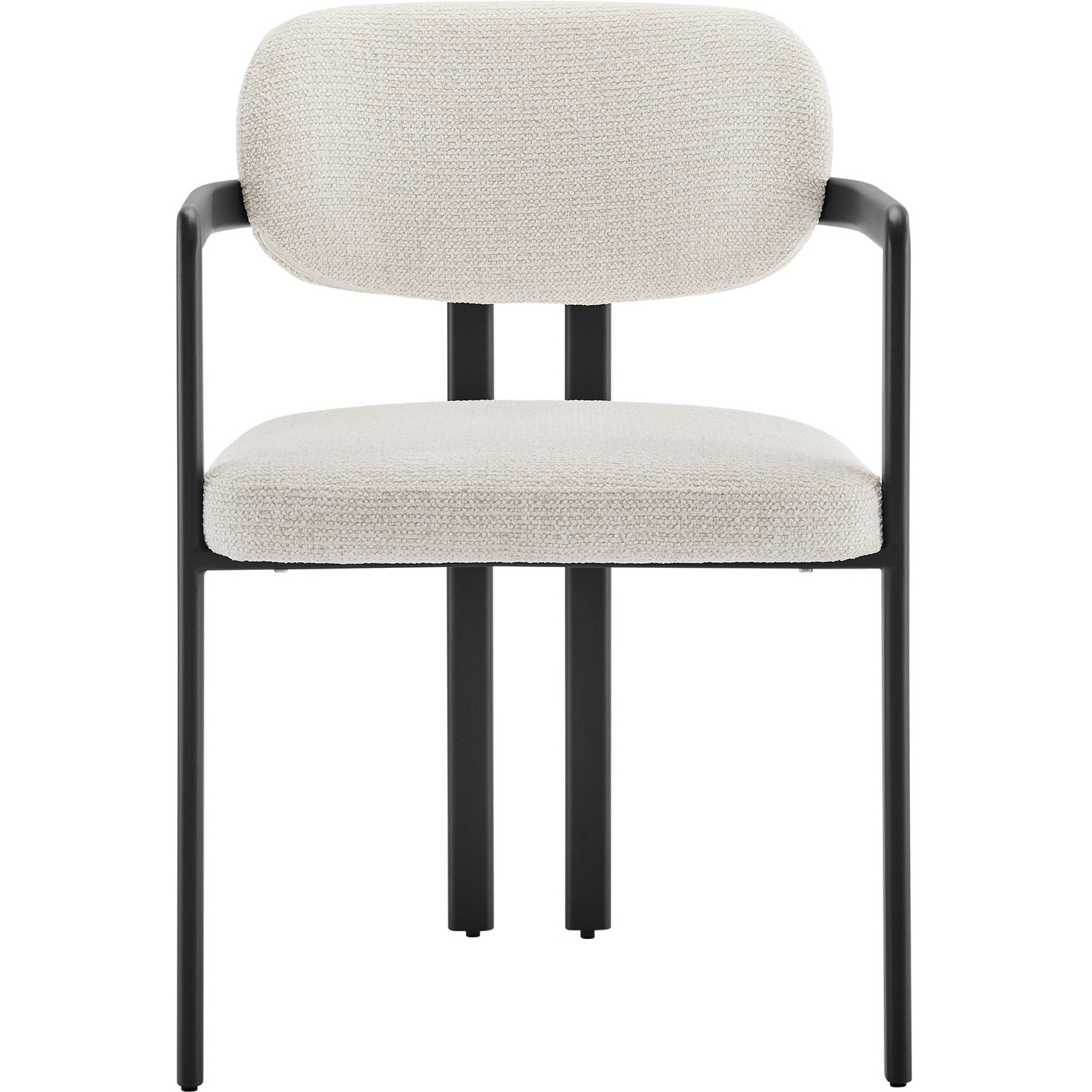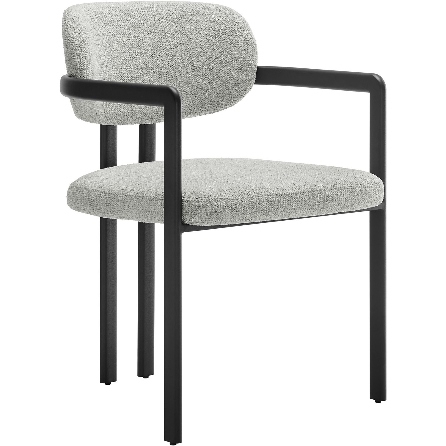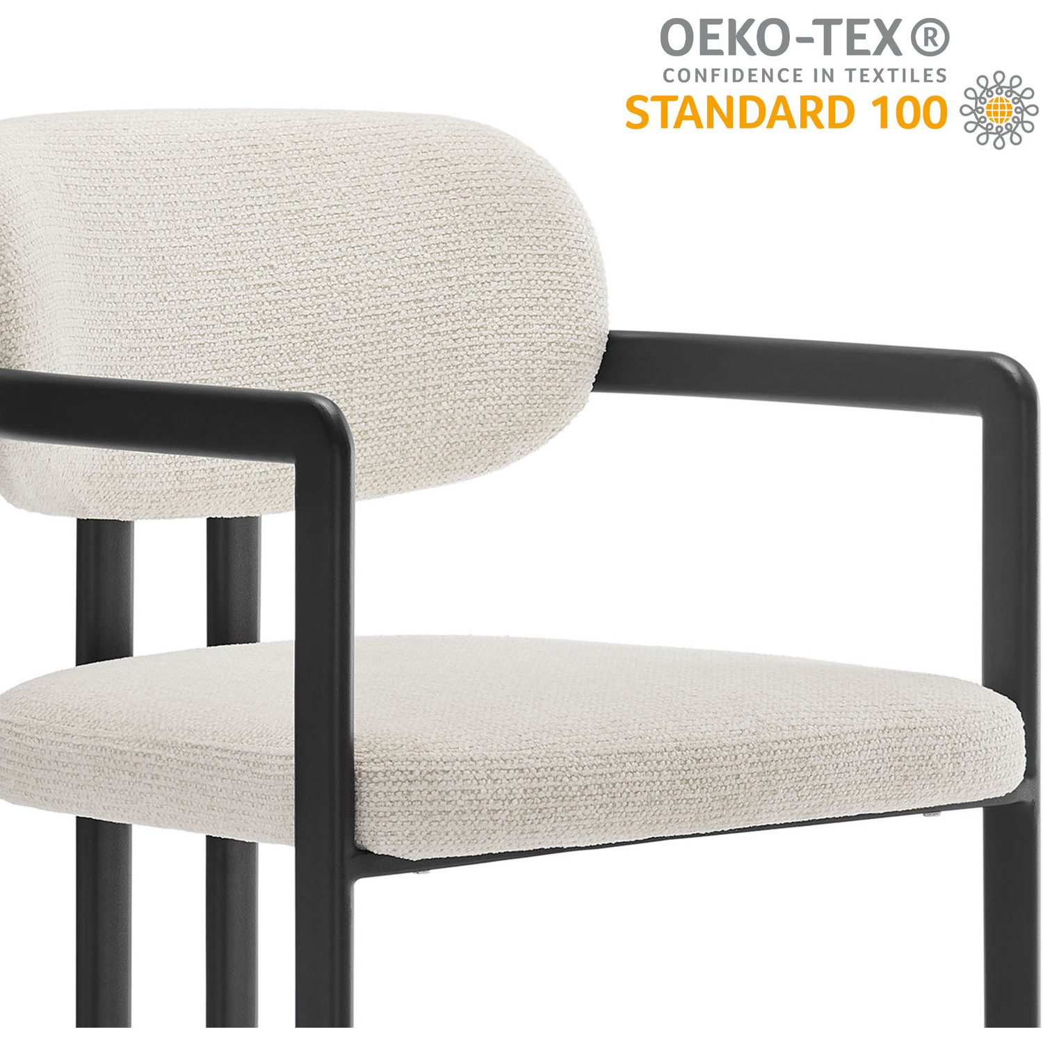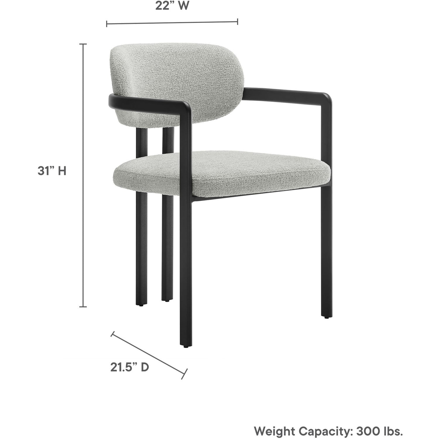 Infuse your dining or living space with the modern sophistication of the Elio Dining Chair. Combining angular metal framing with a rounded barrel chair design, this open back dining chair is a harmonious balance of geometry and softness. Its powder-coated metal frame features clean lines and a sculptural silhouette, while the padded seat and backrest of this upholstered chair are covered in a richly textured woven fabric for a tactile, cozy feel. Better for you and the environment, the upholstery fabric is also OEKO-TEX® STANDARD 100 certified. The open-back design adds an airy elegance, making Elio equally suited as a dining chair, accent chair, or office chair. Fully assembled and equipped with adjustable non-marking floor glides, this modern barrel chair ensures hassle-free setup and floor protection. Whether placed in a contemporary dining room, a cozy breakfast nook, or a stylish workspace, the Elio Dining Chair makes a statement with its modern charm and versatile design. Weight Capacity: 300 lbs.Modern Barrel Dining Chair