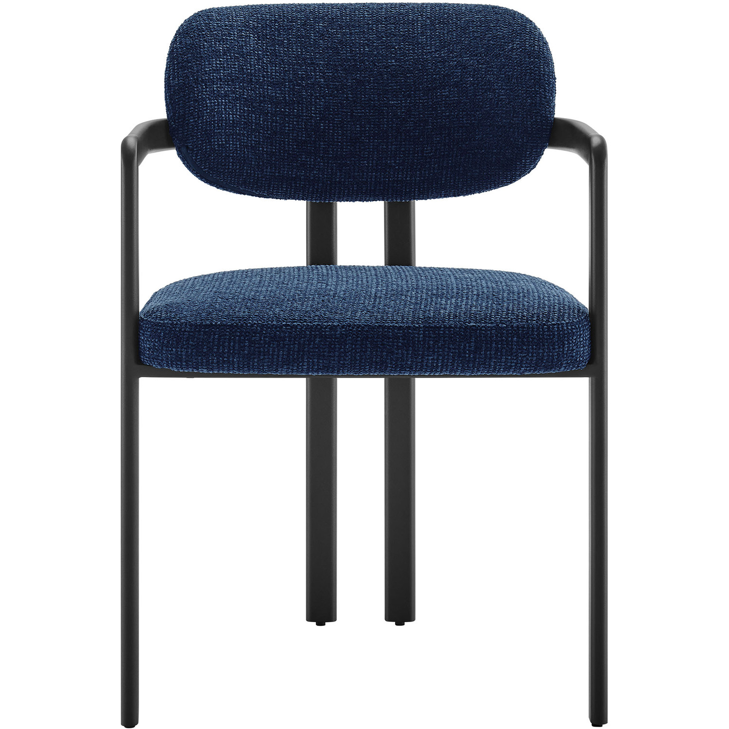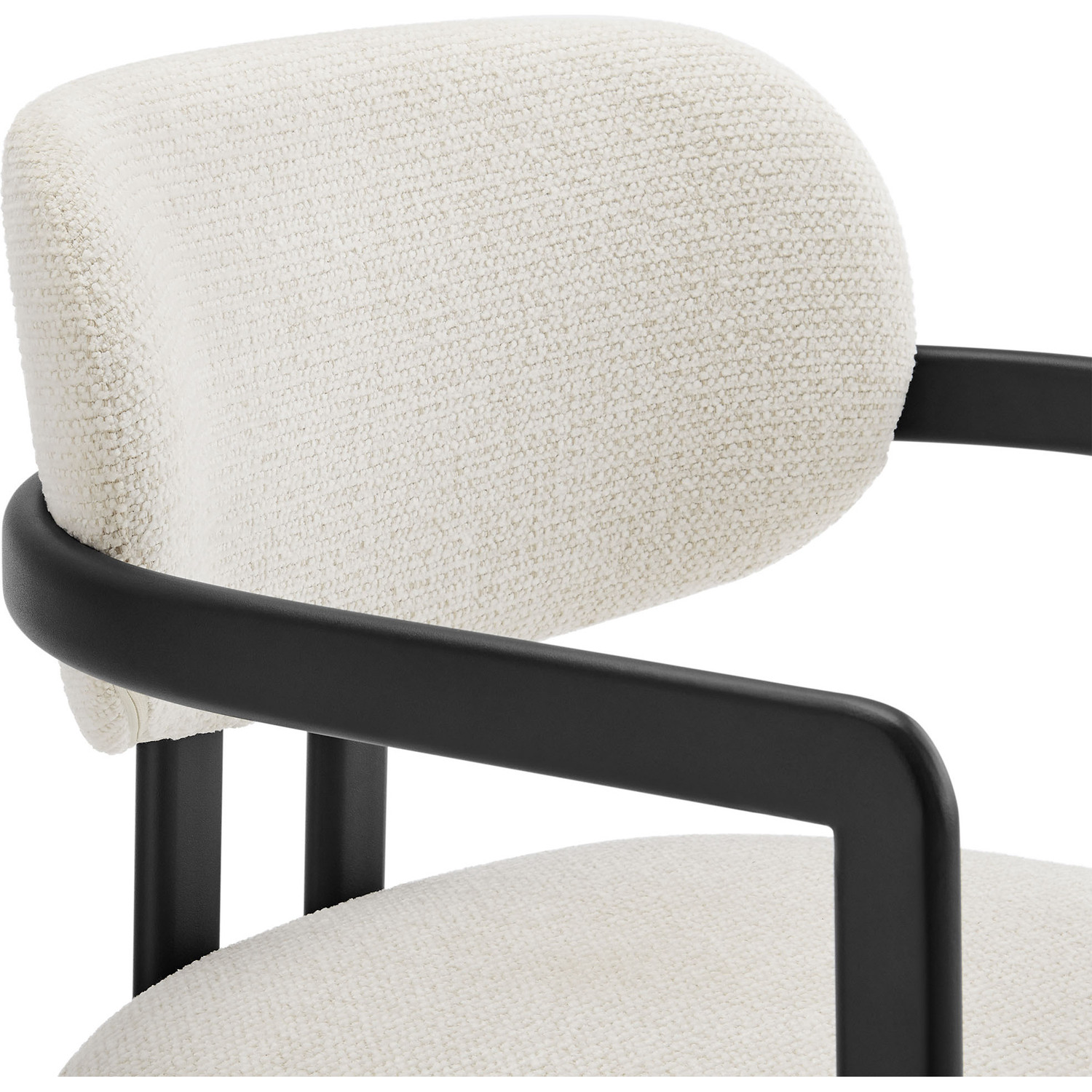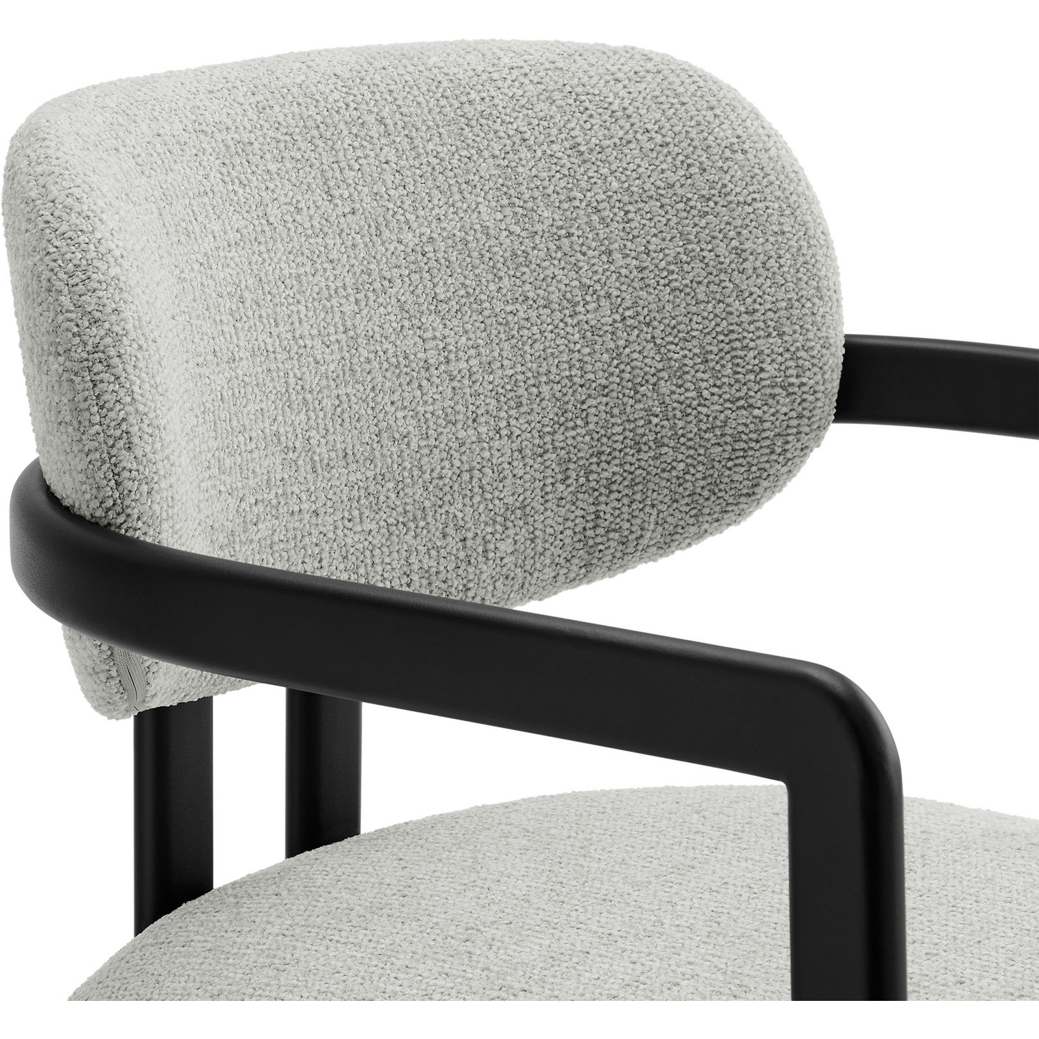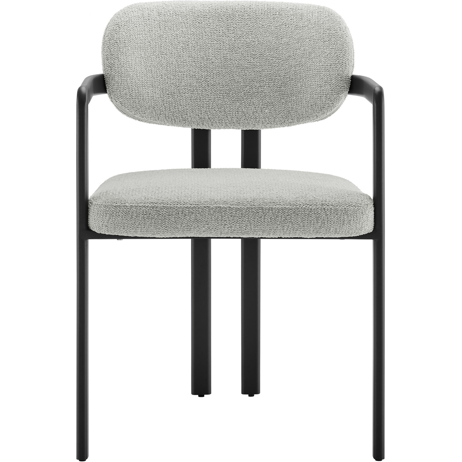 Infuse your dining or living space with the modern sophistication of the Elio Dining Chair. Combining angular metal framing with a rounded barrel chair design, this open back dining chair is a harmonious balance of geometry and softness. Its powder-coated metal frame features clean lines and a sculptural silhouette, while the padded seat and backrest of this upholstered chair are covered in a richly textured woven fabric for a tactile, cozy feel. Better for you and the environment, the upholstery fabric is also OEKO-TEX® STANDARD 100 certified. The open-back design adds an airy elegance, making Elio equally suited as a dining chair, accent chair, or office chair. Fully assembled and equipped with adjustable non-marking floor glides, this modern barrel chair ensures hassle-free setup and floor protection. Whether placed in a contemporary dining room, a cozy breakfast nook, or a stylish workspace, the Elio Dining Chair makes a statement with its modern charm and versatile design. Weight Capacity: 300 lbs.Modern Barrel Dining Chair