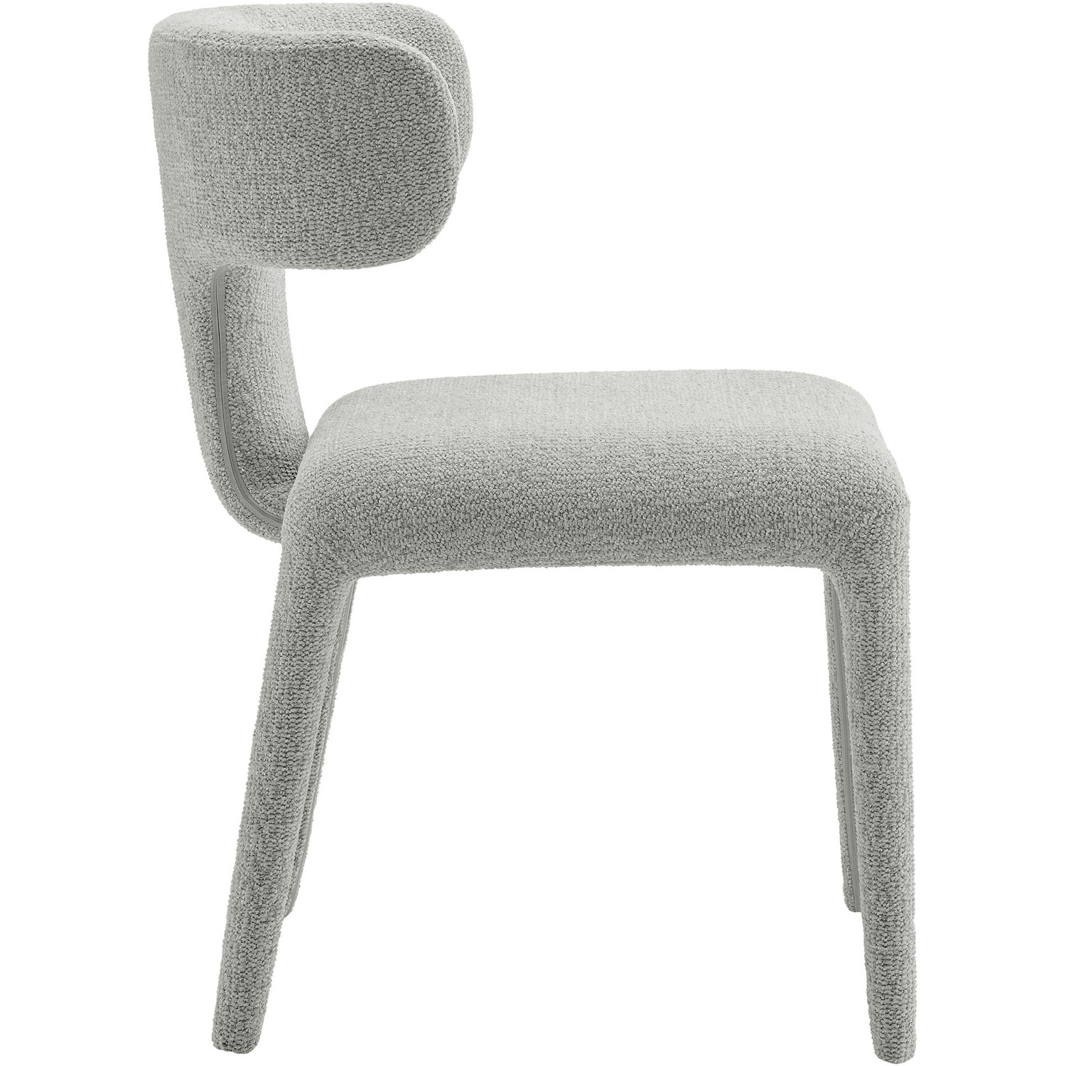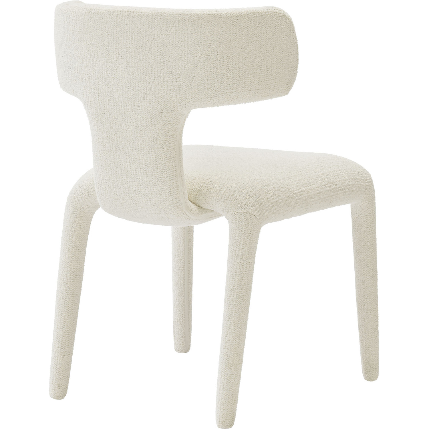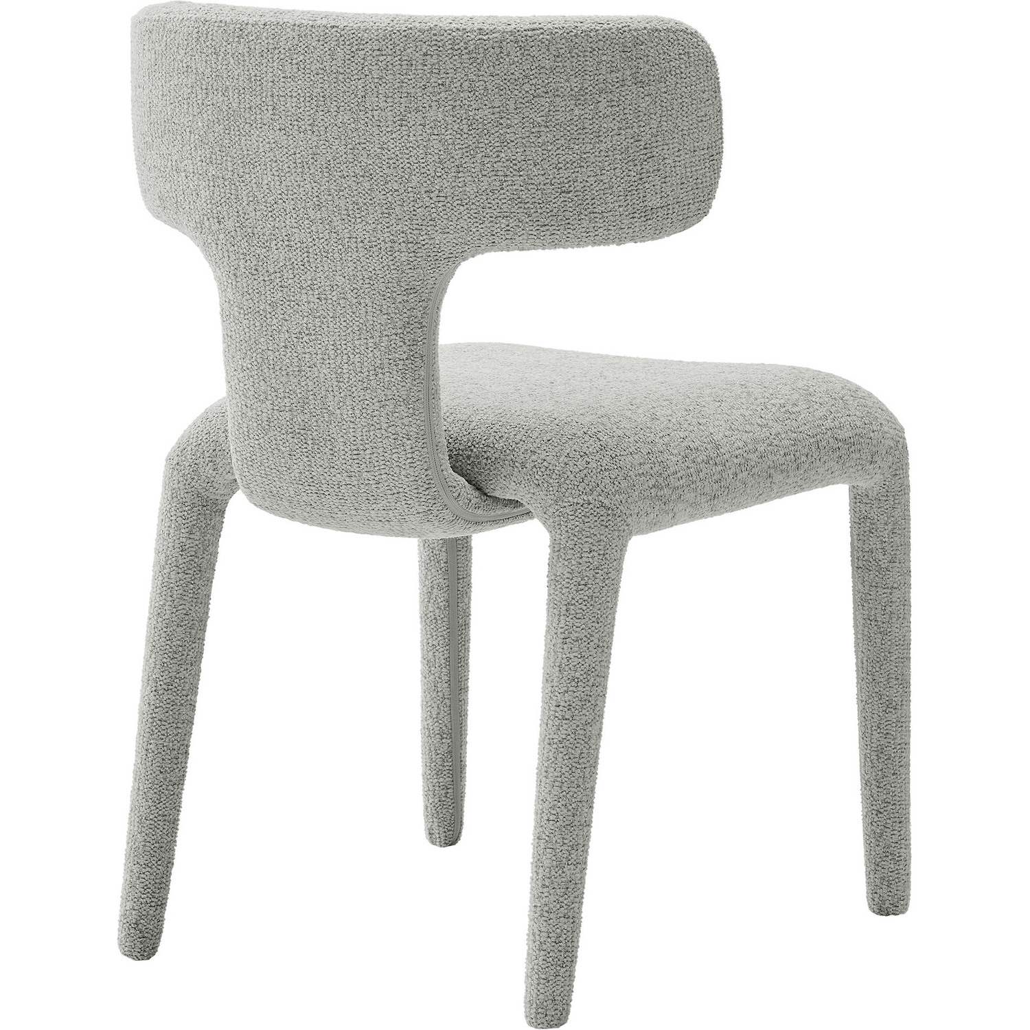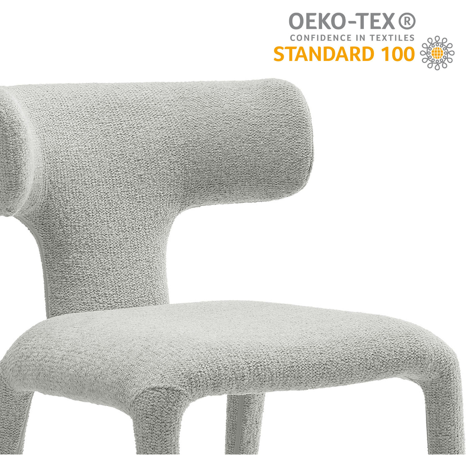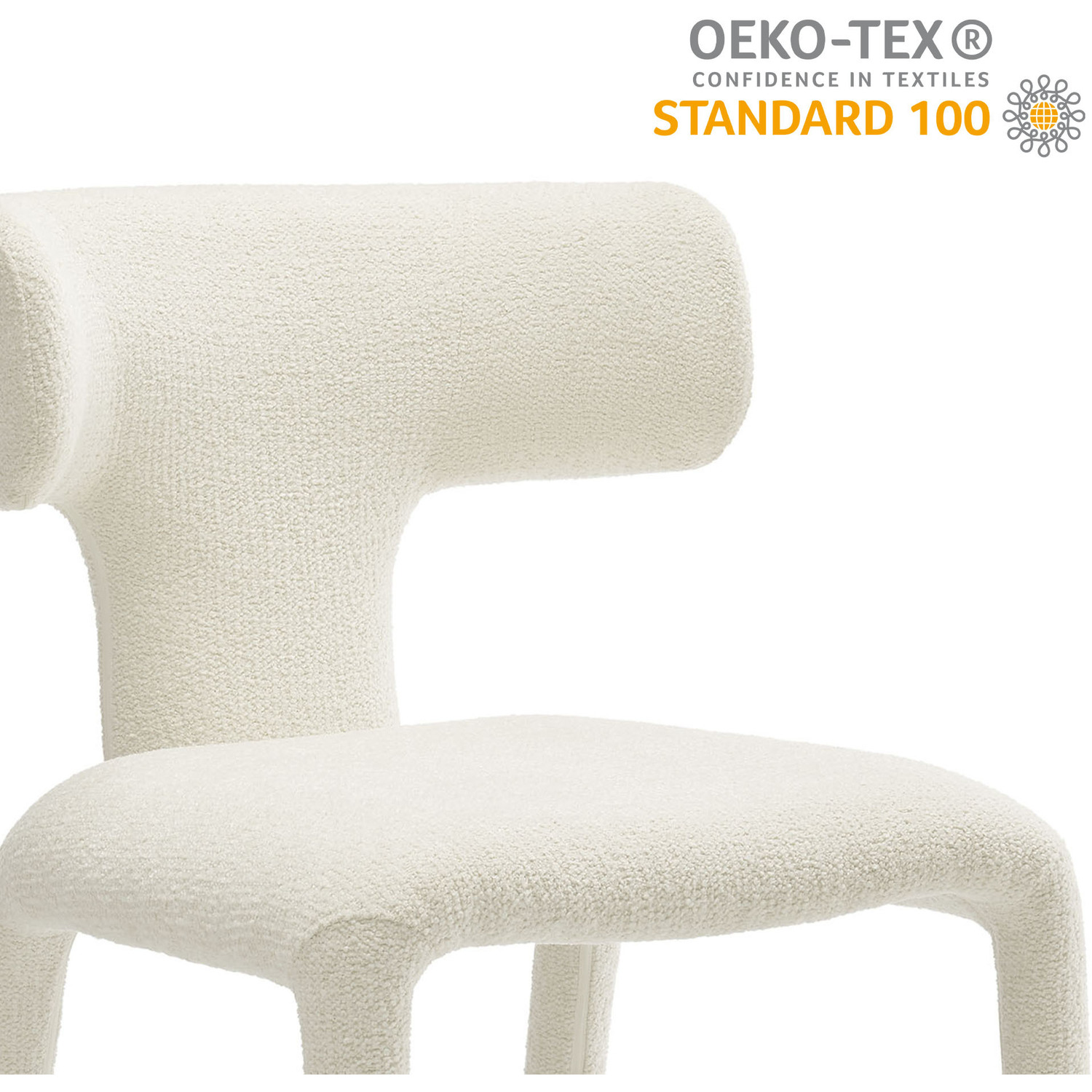Introduce a sophisticated yet inviting charm to your dining or living area with the set of 2 Stellan Boucle Dining Chair. Fully covered in luxurious boucle fabric, this upholstered chair exudes cozy elegance with its textured depth and tactile appeal. Made from recycled plastic bottles, the upholstery fabric is also OEKO-TEX® STANDARD 100 certified. The curved back dining chair’s sculptural silhouette is defined with rounded edges and splayed back legs, creating a modern yet timeless profile. Built on a sturdy metal frame hidden beneath the plush padding, this boucle side chair balances form and function beautifully. Non-marking floor glides protect your floors. Perfect as an armless dining chair, accent chair, or even a stylish guest or desk chair, Stellan is a versatile addition to any contemporary or modern space. Weight Capacity: 300 lbs.Fully Upholstered Dining Chair