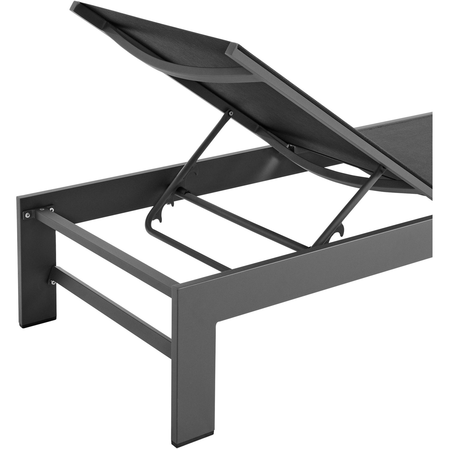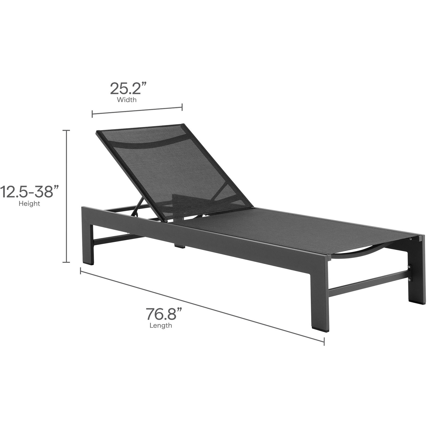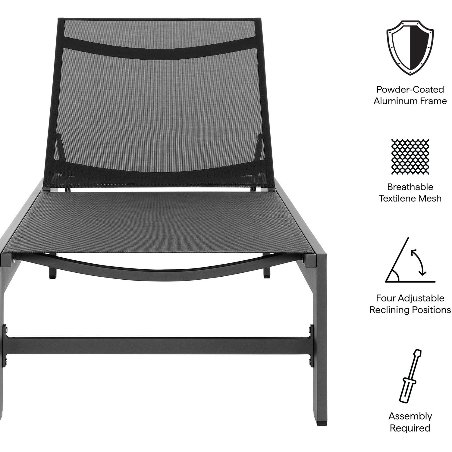 Enliven your outdoor retreat with the Tahoe Aluminum and Mesh Outdoor Chaise Lounge. This modern patio chaise combines contemporary elegance with durable functionality, perfect for any outdoor space. Built with a sturdy aluminum frame and finished with a smooth powder-coated surface, this chaise lounge offers both strength and style. The breathable, weather-resistant Textilene mesh seat and back provide comfort for hours of sunbathing or lounging by the pool. With four adjustable reclining positions, you can easily find your ideal angle, whether you prefer lounging flat or sitting up. The low-maintenance design ensures year-round use, while the non-marking foot glides protect your outdoor flooring. Easy to assemble, the Tahoe Chaise offers versatile and comfortable lounging, whether placed in your backyard, poolside, or patio. Weight Capacity: 300 lbs.Powder-coated Aluminum Frame