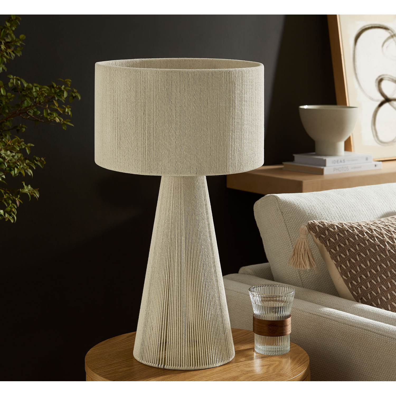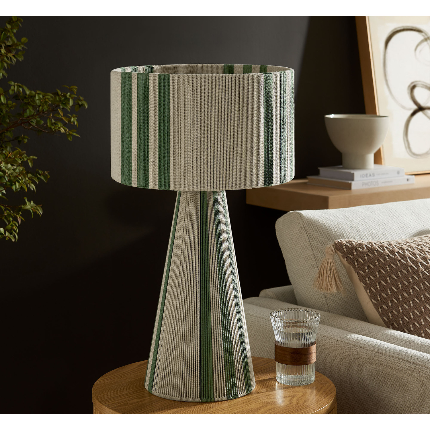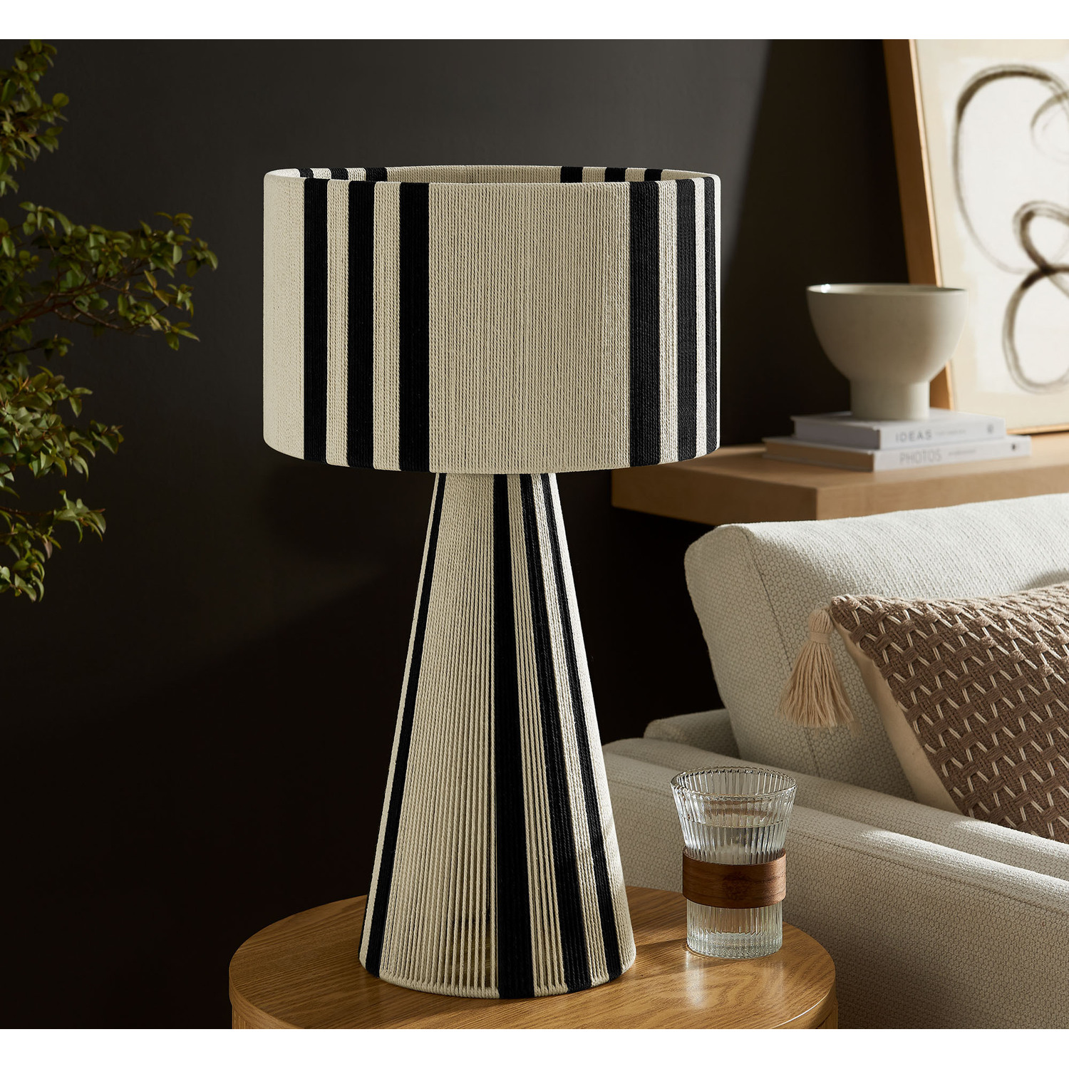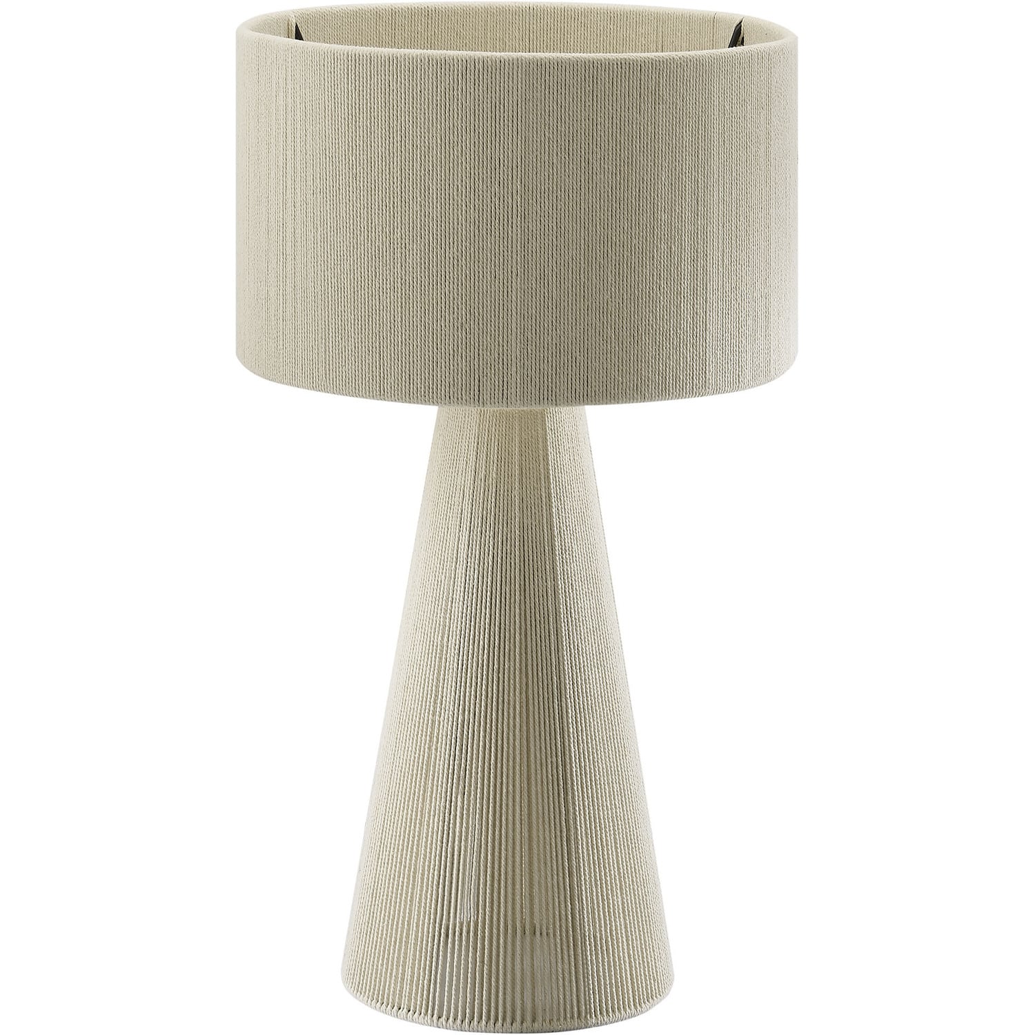 Add a stylish, modern touch to your space with the Gia Table Lamp. Featuring a bold striped design, or a plain natural rope design, this trendy lamp combines a powder-coated metal frame with a lamp shade and base made from hand-woven cotton thread, offering a chic, textured look. The repeating three-stripe pattern flows from the top of the shade to the pedestal bottom, creating a balanced, continuous pattern. Gia also comes in a plain, natural weave with no stripes for the minimalist design lover. This retro table lamp fits beautifully in contemporary European or boho style interiors, bringing an Iberian flair or Moroccan vibes to any room. UL listed, the Gia Cotton Table Lamp requires a single E26 20W bulb (not included) and features an 83" canvas color power cord, with the switch conveniently located on the inside of the lamp. Ideal as a cozy side table lamp or a unique entryway lamp, Gia arrives fully assembled and brings bohemian-inspired elegance to your home decor.Hand-Woven Cotton Thread