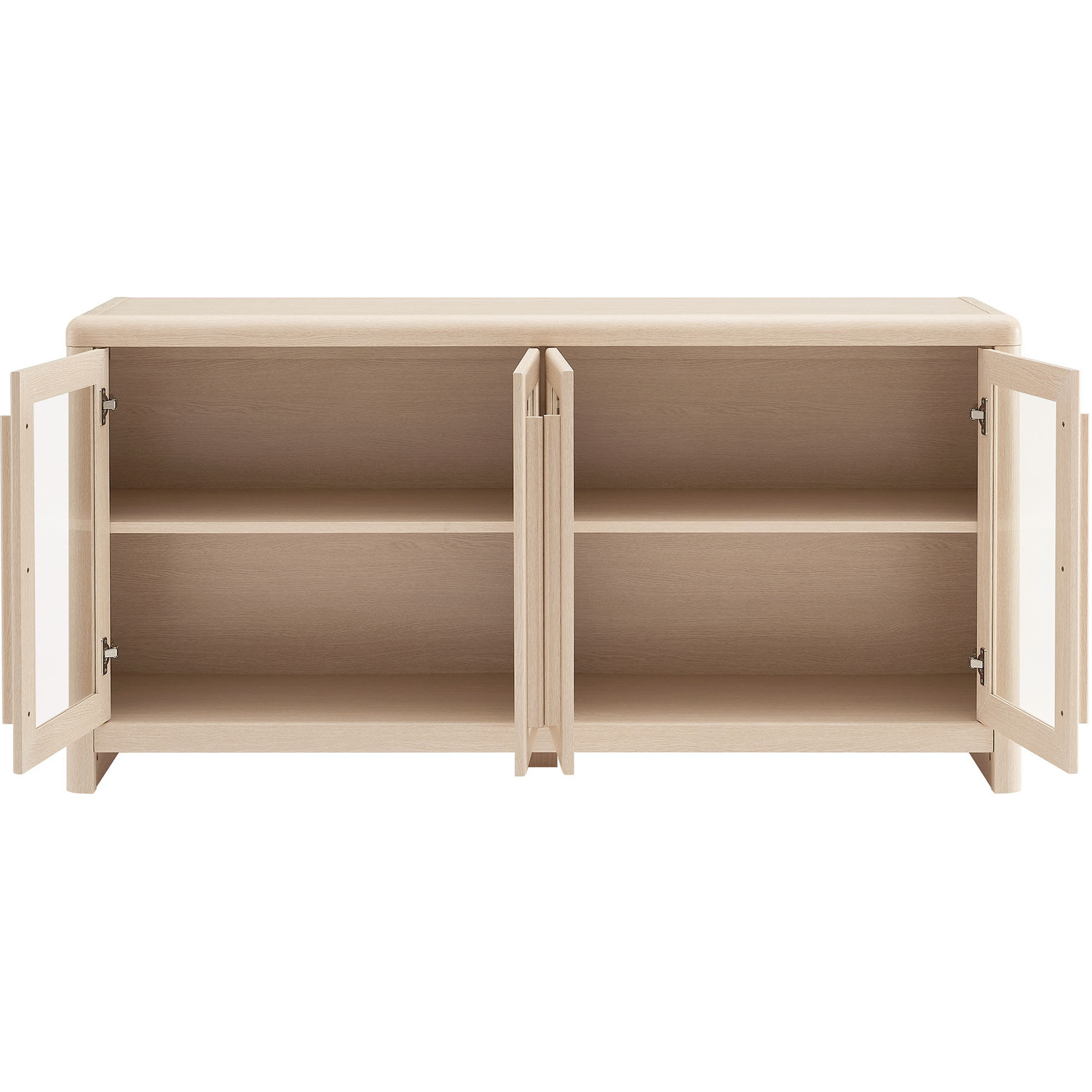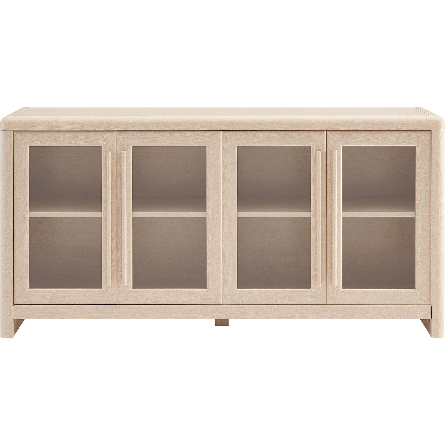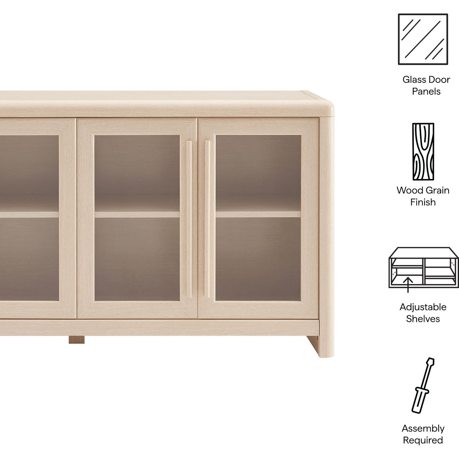 The Evren Sideboard Cabinet blends modern farmhouse charm with versatile functionality, making it a refined centerpiece for any space. Crafted with sturdy construction and a beautiful wood grain laminate, this buffet sideboard cabinet features four glass-paneled doors that add an elegant, airy feel while showcasing interior storage. The elongated vertical handles provide a sleek, contemporary touch, complementing the streamlined silhouette. Designed for flexible storage, the adjustable shelves offer ample space for dinnerware, bar essentials, or displaying your favorite items, while cable management holes with covers ensure effortless organization of electronics when used as an entertainment console. Soft-close hinges allow for smooth operation, and non-marking floor glides protect surfaces from scratches. Perfect for use as a dining room buffet, liquor cabinet bar for home, TV stand, or hallway storage cabinet, the Evren Sideboard is a sophisticated and practical addition to any living space. Assembly required.Glass-Paneled Doors