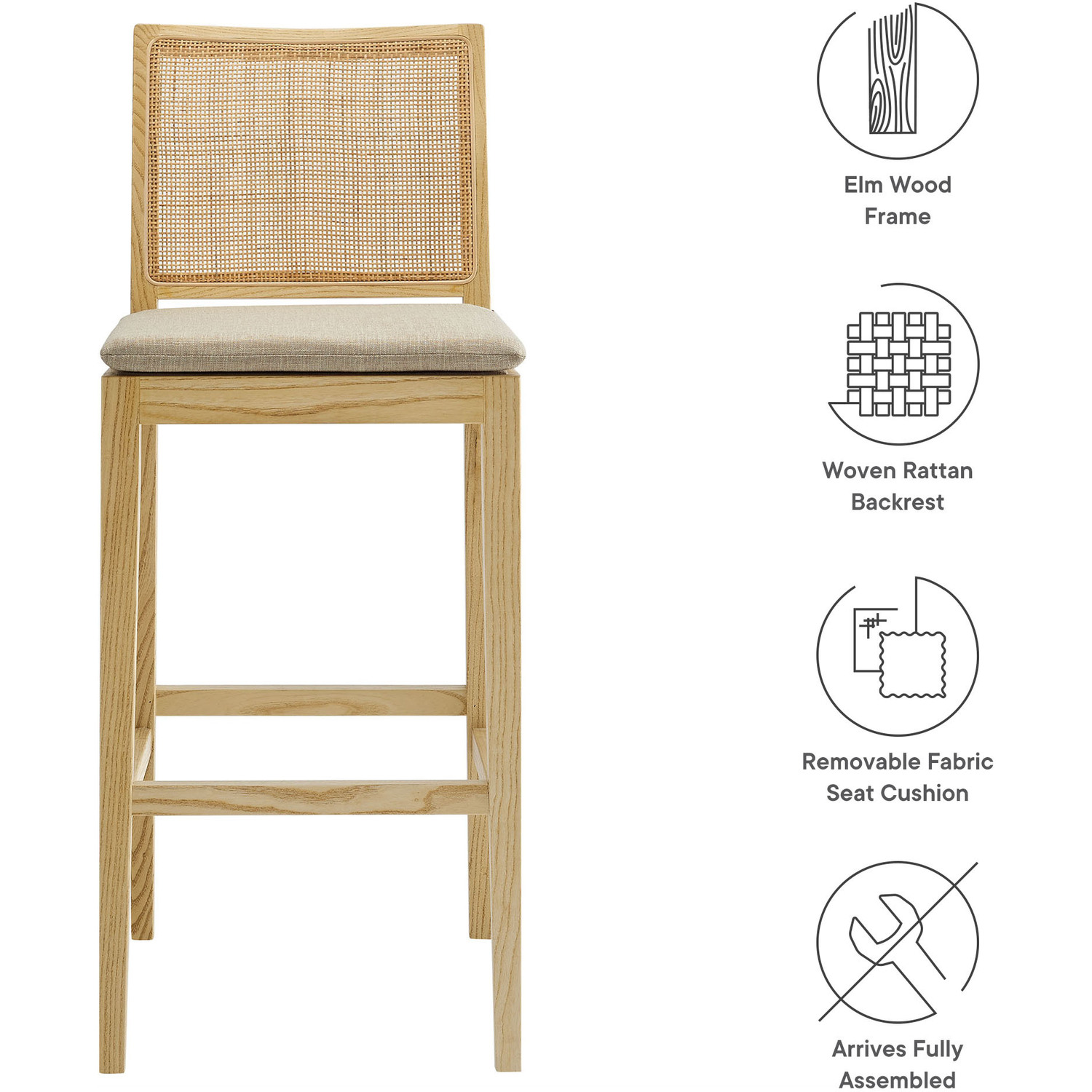 Bring a mix of farmhouse charm and modern design to your kitchen or bar area with the Ovard Rattan Bar Stool. This elegant stool features a solid elm wood frame paired with a natural rattan mesh backrest to bring modern farmhouse style and a coastal airy feel to your dining or bar space. The padded fabric seat cushion is both removable and secured with charming ties, offering comfort and flexibility. Its streamlined armless design and stretchers are ideal for bar tables, kitchen counters, or casual dining areas. Non-marking floor pins protect your floors, and the rattan bar stool arrives fully assembled for hassle-free setup. Weight Capacity: 300 lbs.Armless Bar Stool