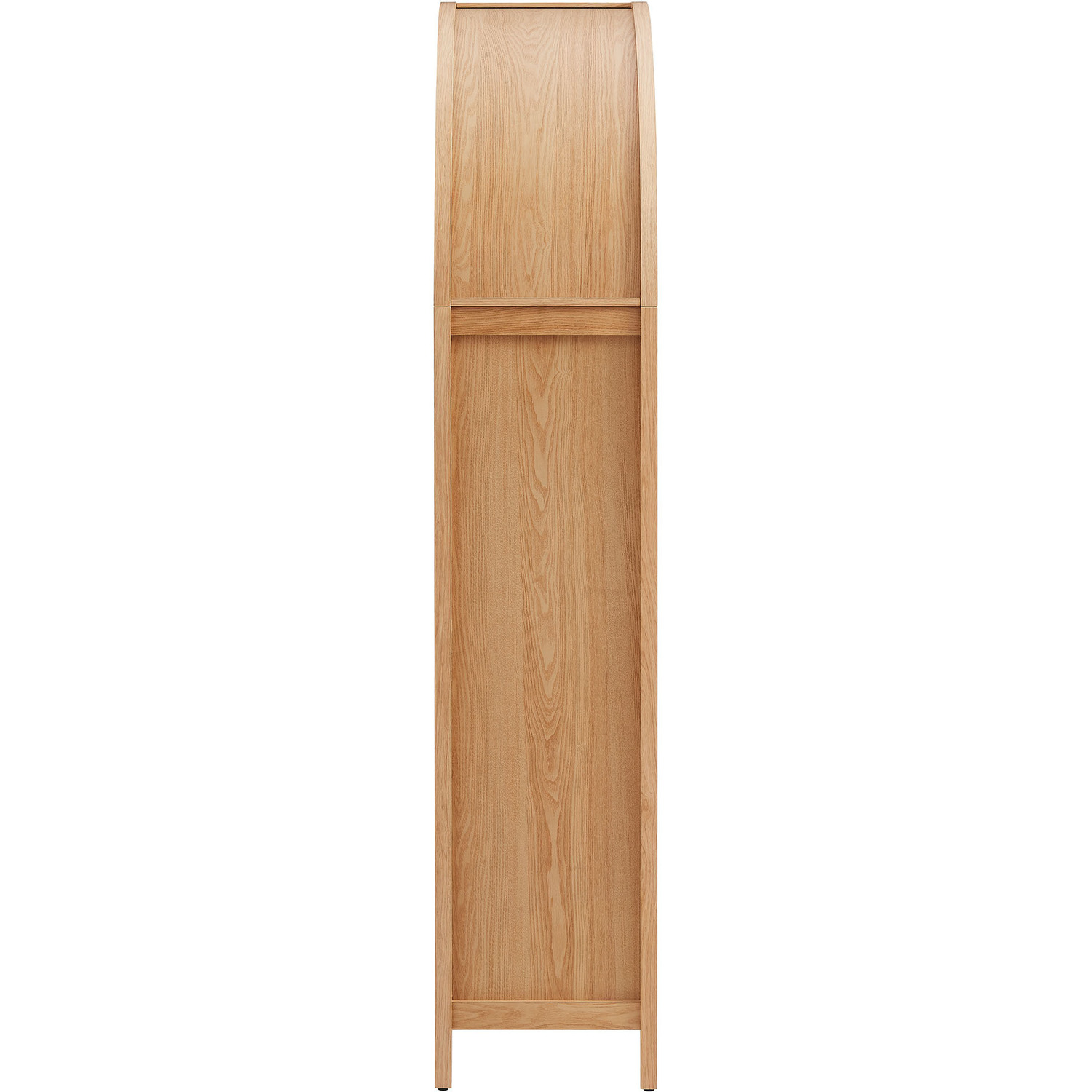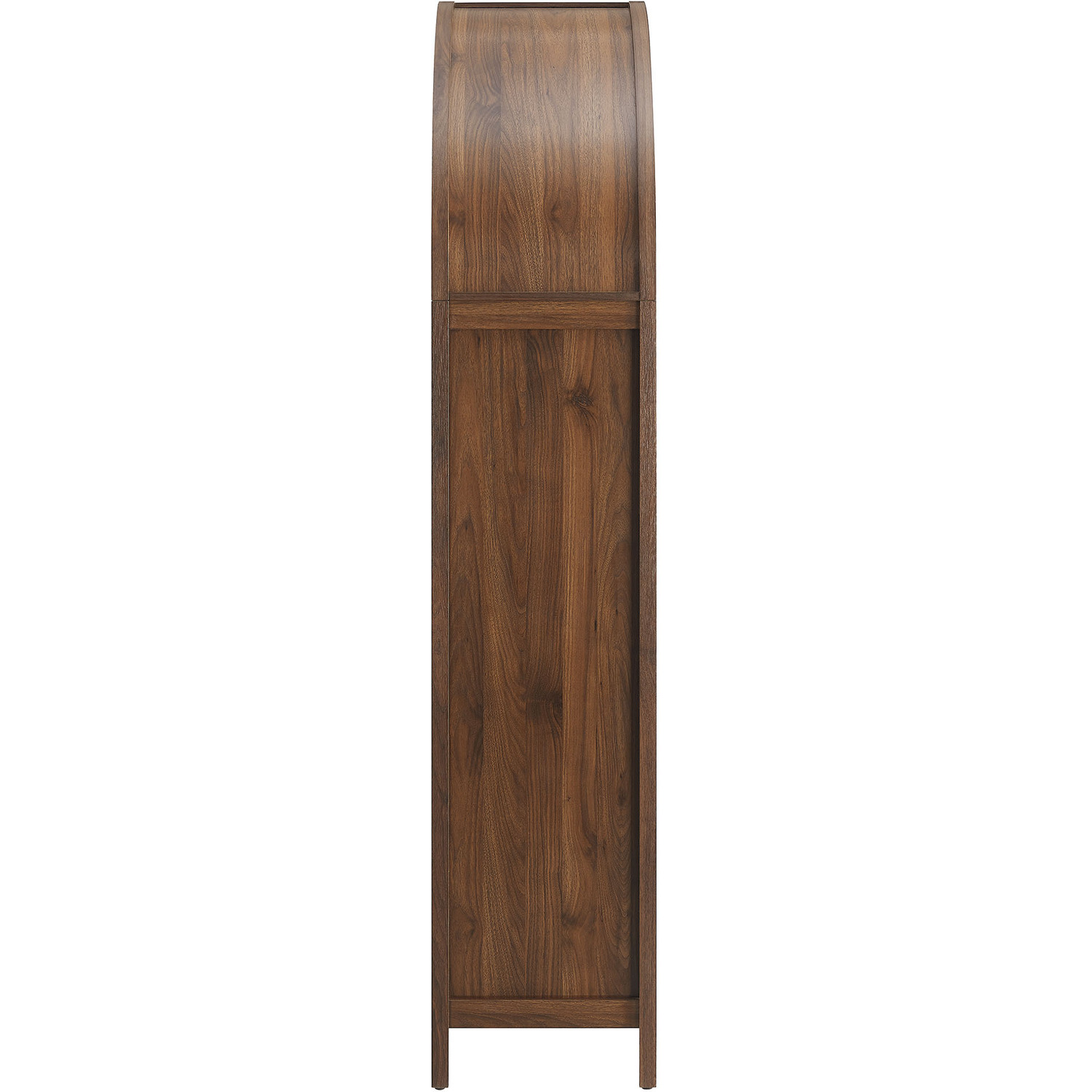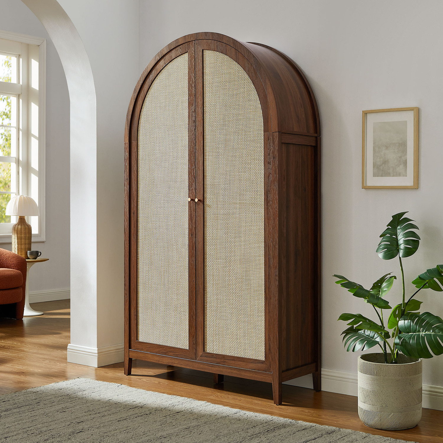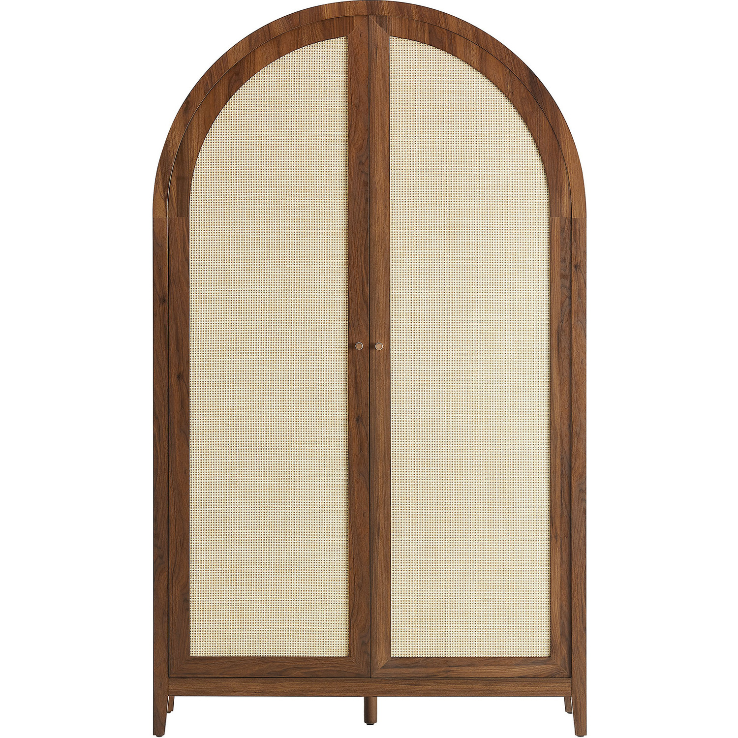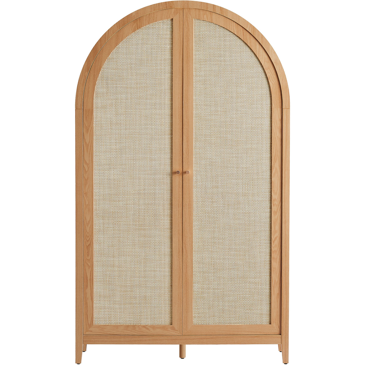 Infuse warmth and elegance into your home with the Calista Arched Storage Cabinet. Standing at 79"es tall, this spacious linen cabinet blends modern farmhouse charm with functional organization. The gracefully curved arched silhouette is complemented by synthetic rattan paneling on the wood grain laminate doors, offering a natural woven texture with enhanced durability. Perfect for storing linens, seasonal decor, or household essentials, Calista features two adjustable shelves, allowing you to customize the interior space to fit your needs. The soft-close hinges ensure smooth operation, while non-marking adjustable levelers provide stability on any surface. Whether placed in an office, hallway, or living room, this tall storage cabinet with doors and shelves serves as a stylish and practical solution for everyday organization. Assembly required.79” Tall Arched Cabinet