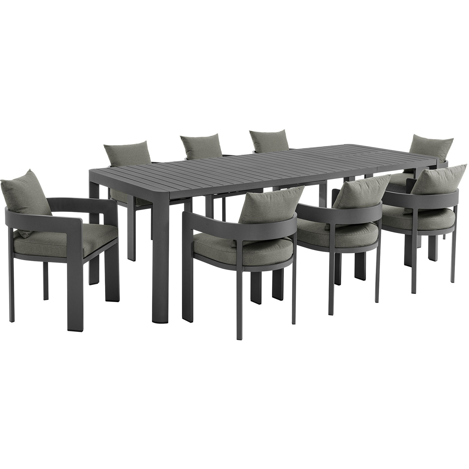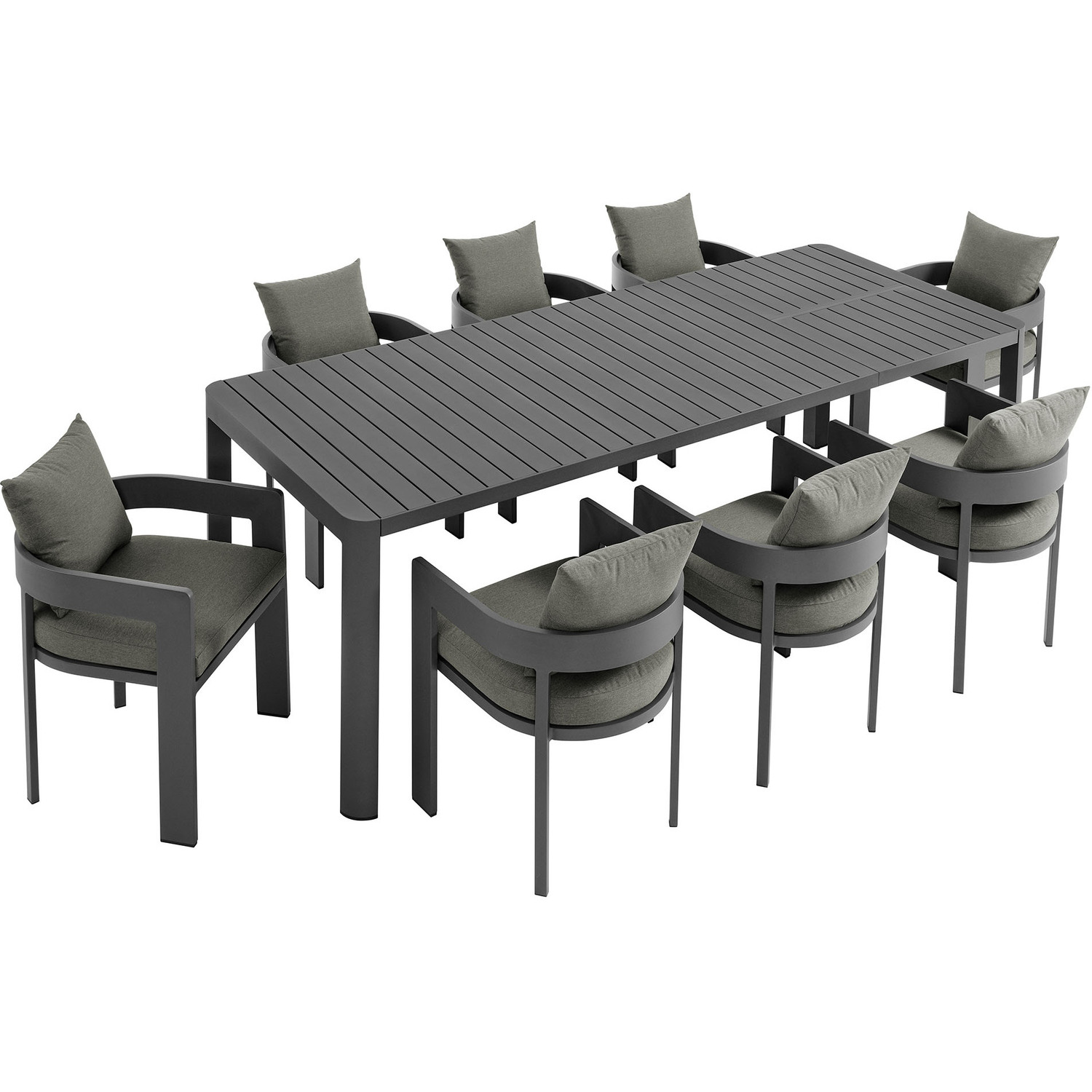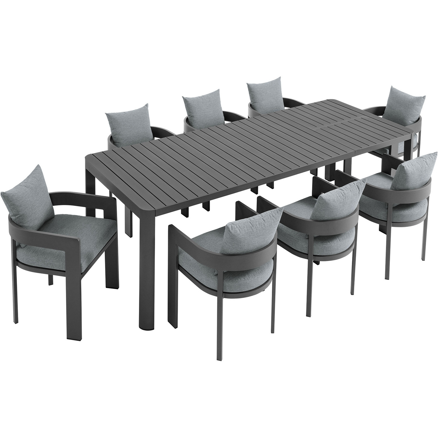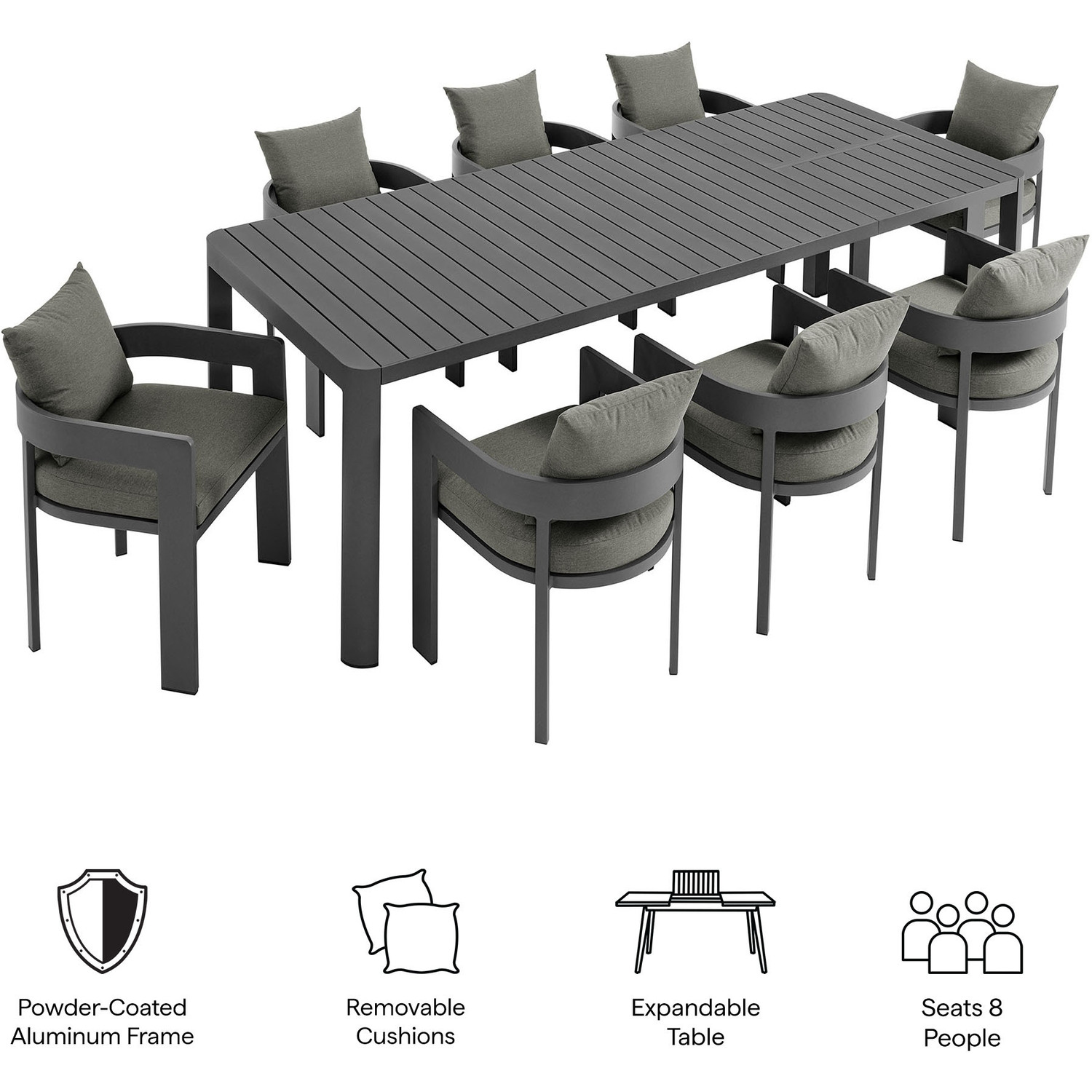 Enliven your alfresco spaces with the Tahoe Aluminum Outdoor Dining Set for 8. This modern 9-piece patio dining set includes an extendable rectangular dining table and eight aluminum dining armchairs, delivering contemporary elegance and durable functionality to outdoor spaces. The extendable dining table expands from 71"es to 94.5"es, providing ample space for gatherings. Crafted with a low-maintenance slatted tabletop, this outdoor dining set for 8 withstands the elements while maintaining a modern aesthetic. Each Tahoe Aluminum Patio Chair features a curved open back and armrests, designed for both comfort and style. The removable, stain-resistant cushions are filled with dense foam and covered in waterproof, sunproof fabric for all-season use. Pre-assembled chairs and an easy-to-assemble dining table ensure a seamless setup, while non-marking foot glides protect patio and deck flooring. Outdoor Armchair Weight Capacity: 300 lbs.Powder-Coated Aluminum