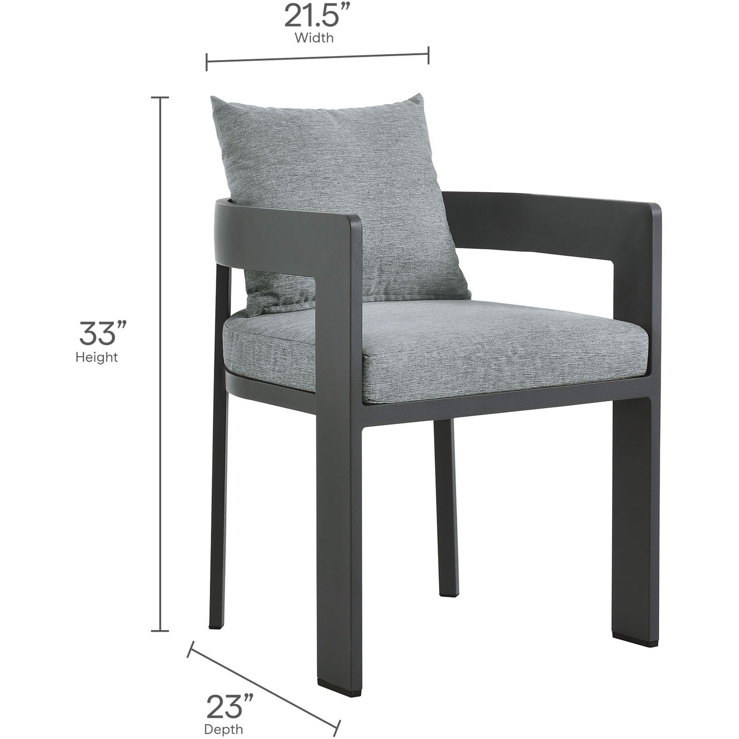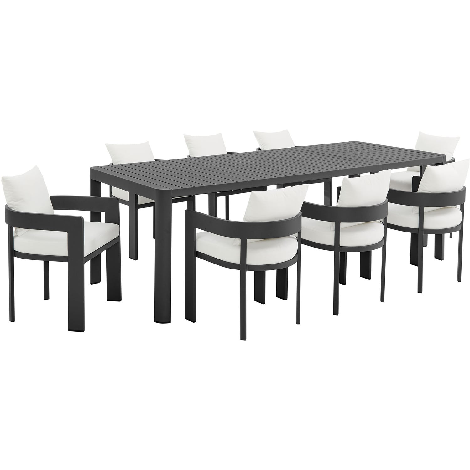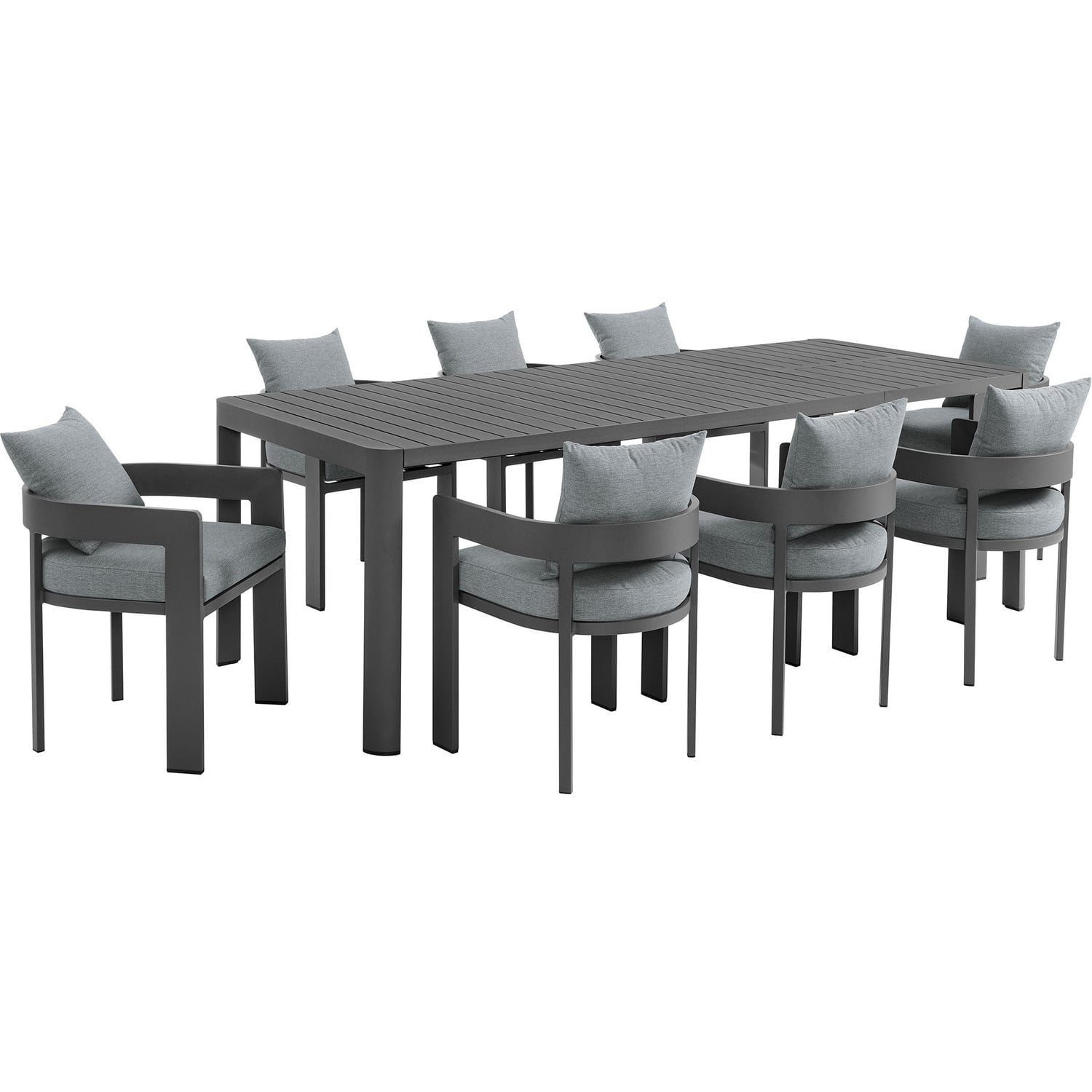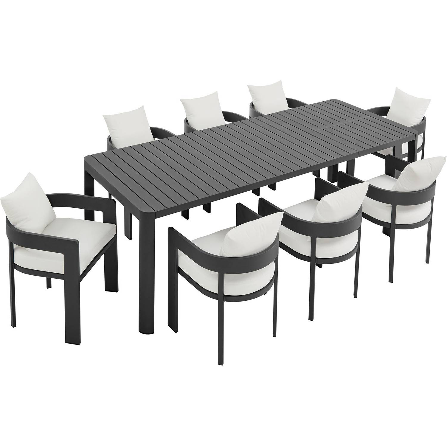 Enliven your alfresco spaces with the Tahoe Aluminum Outdoor Dining Set for 8. This modern 9-piece patio dining set includes an extendable rectangular dining table and eight aluminum dining armchairs, delivering contemporary elegance and durable functionality to outdoor spaces. The extendable dining table expands from 71"es to 94.5"es, providing ample space for gatherings. Crafted with a low-maintenance slatted tabletop, this outdoor dining set for 8 withstands the elements while maintaining a modern aesthetic. Each Tahoe Aluminum Patio Chair features a curved open back and armrests, designed for both comfort and style. The removable, stain-resistant cushions are filled with dense foam and covered in waterproof, sunproof fabric for all-season use. Pre-assembled chairs and an easy-to-assemble dining table ensure a seamless setup, while non-marking foot glides protect patio and deck flooring. Outdoor Armchair Weight Capacity: 300 lbs.Powder-Coated Aluminum