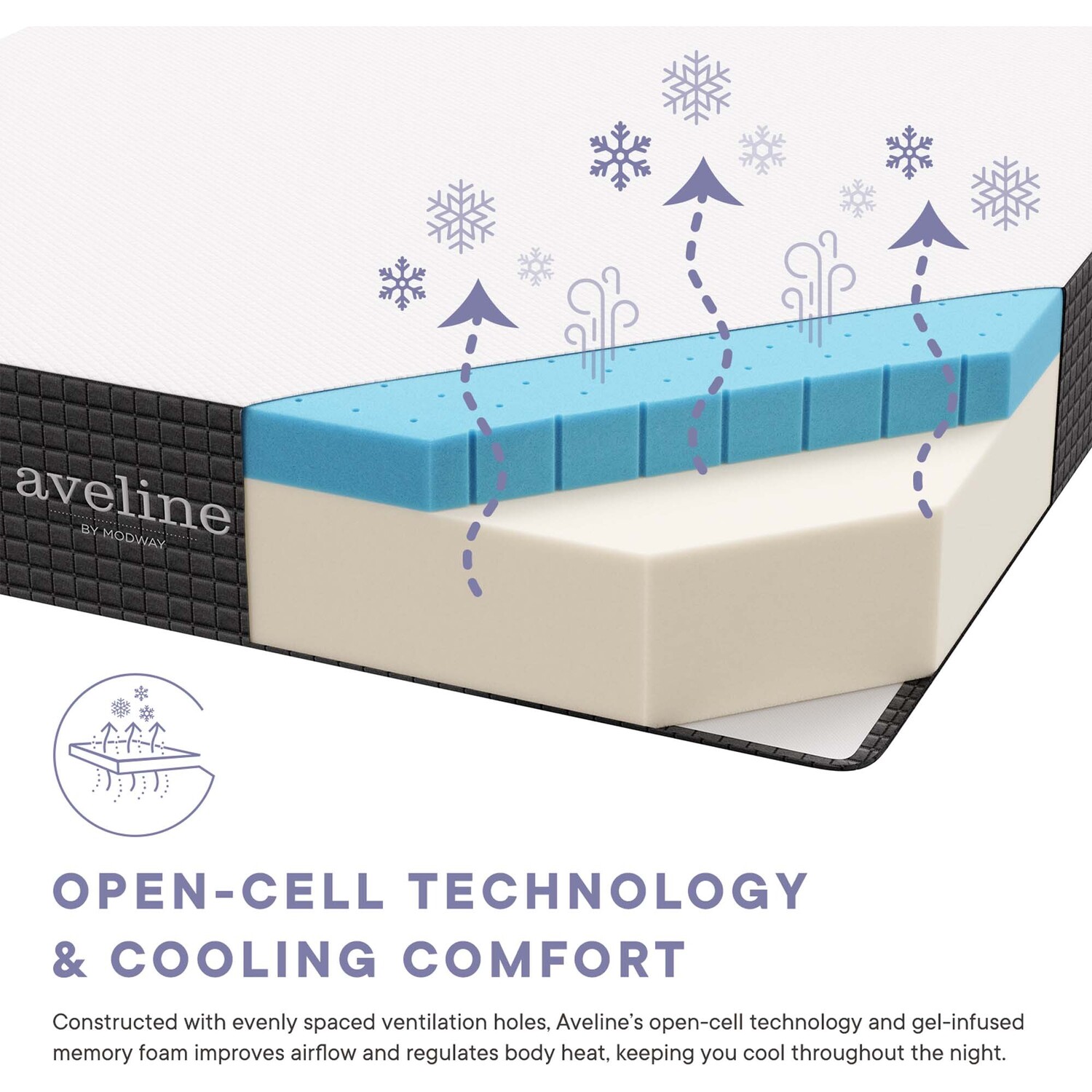 Indulge in deeper, more restorative sleep with the Aveline 10” King Mattress. Topped with breathable gel-infused memory foam to keep your body climate steady and cool, this mattress dissipates body heat with abundant ventilation while quickly conforming to your weight and position for ultimate comfort. Sleep peacefully with an open-cell memory foam mattress that relieves pressure points and delivers welcome relief from the aches and pains of traditional mattresses. Reducing bounce between two sleepers, this cooling memory foam mattress is an ideal mattress for couples. Aveline is CertiPUR-US® certified by accredited independent testing laboratories, so you can be confident that the memory foam is made without fiberglass, formaldehyde, ozone depleters, mercury, and other heavy metals including PBDEs, TDCPP or TCEP ("Tris") flame retardants, and is low on VOC. The mattress ships directly to your doorstep. It takes 2 to 4 hours for the mattress to expand most of the way and a day to expand fully. Includes a removable stretch knit diamond patterned cover. Box spring or foundation is optional. Slatted bases should be less than 3" apart.3” Gel-Infused Memory Foam