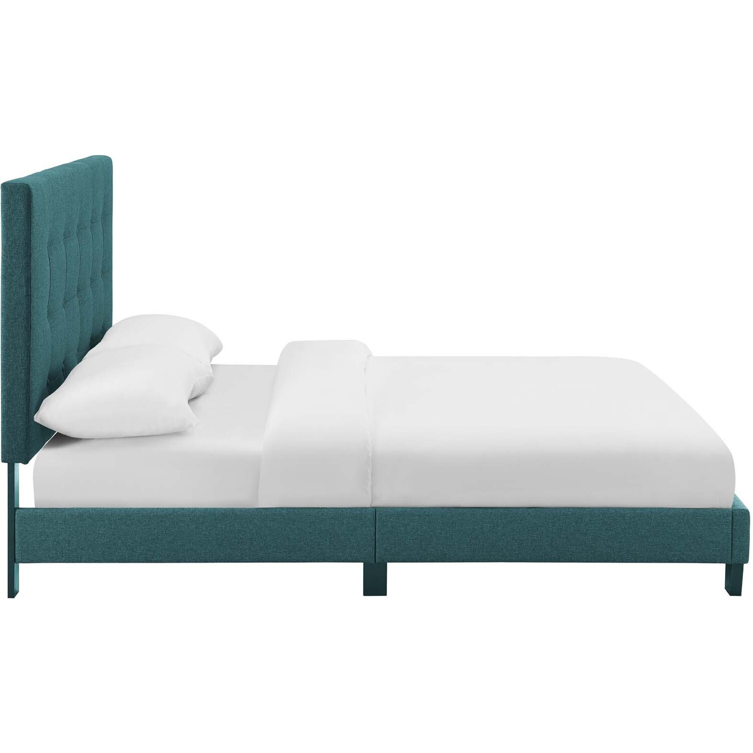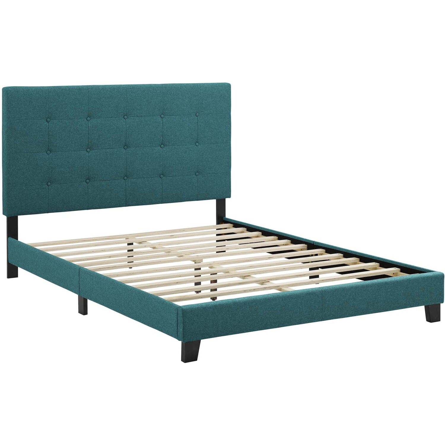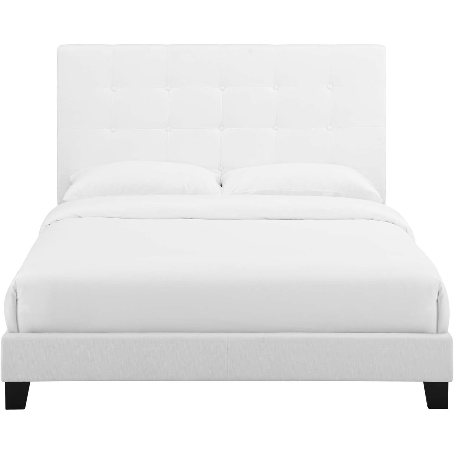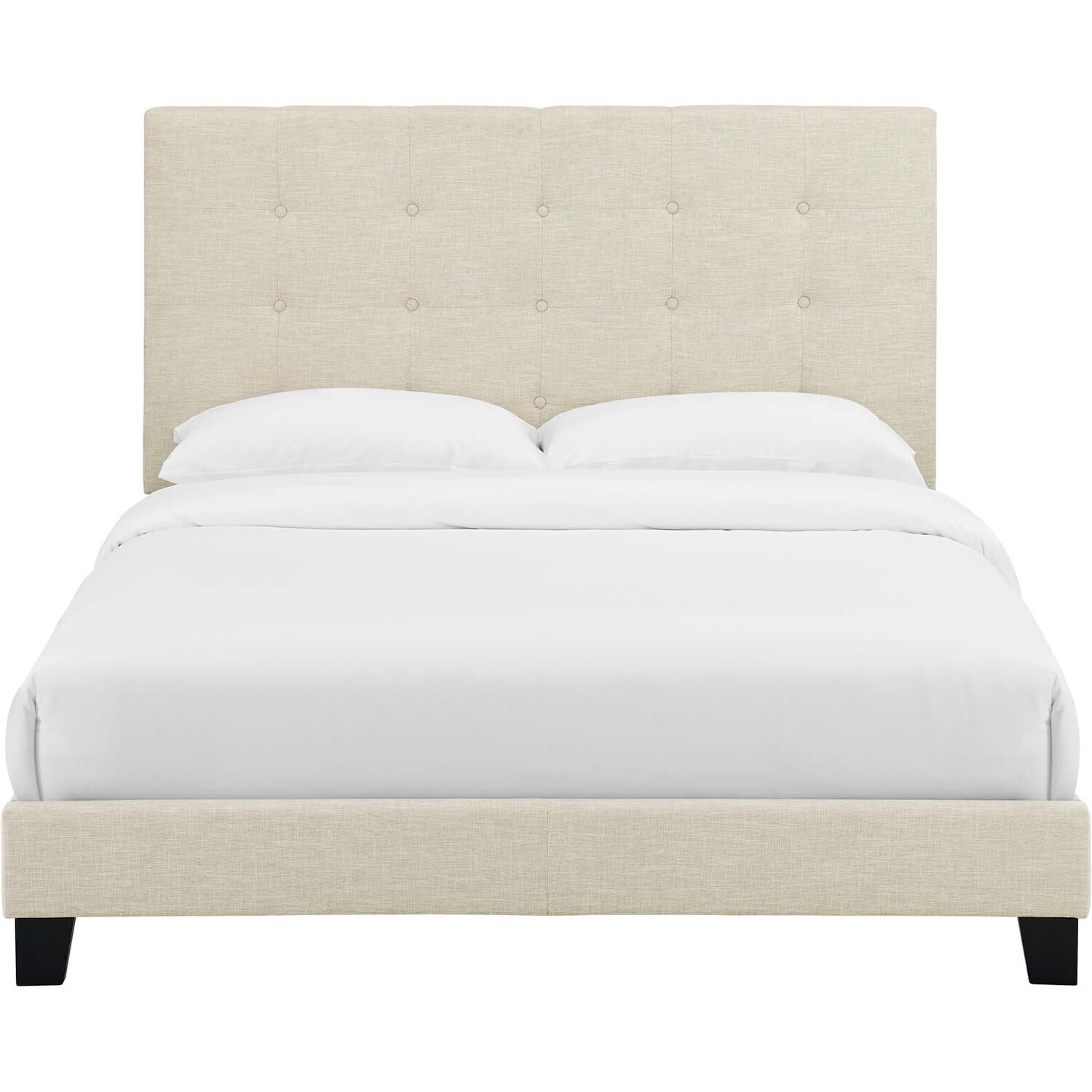Clean lines, a straightforward profile, and classic button tufting define the Melanie Queen Platform Bed. Designed with chic elegance and contemporary style, Melanie's base and headboard come upholstered in soft polyester fabric, while the sturdy wood frame and legs offer lasting durability. Eliminating the need for a box spring, this platform bed is complete with a wood slat support system and reinforced center beam creating the perfect mattress foundation for memory foam, spring, latex, and hybrid mattresses. A sleek and sophisticated centerpiece to a master suite or guest room, effortlessly transform bedroom decor with the luxe look of this modern platform bed. Includes non-marking foot caps. Bed Weight Capacity: 800 lbs.Platform Bed Frame With Headboard