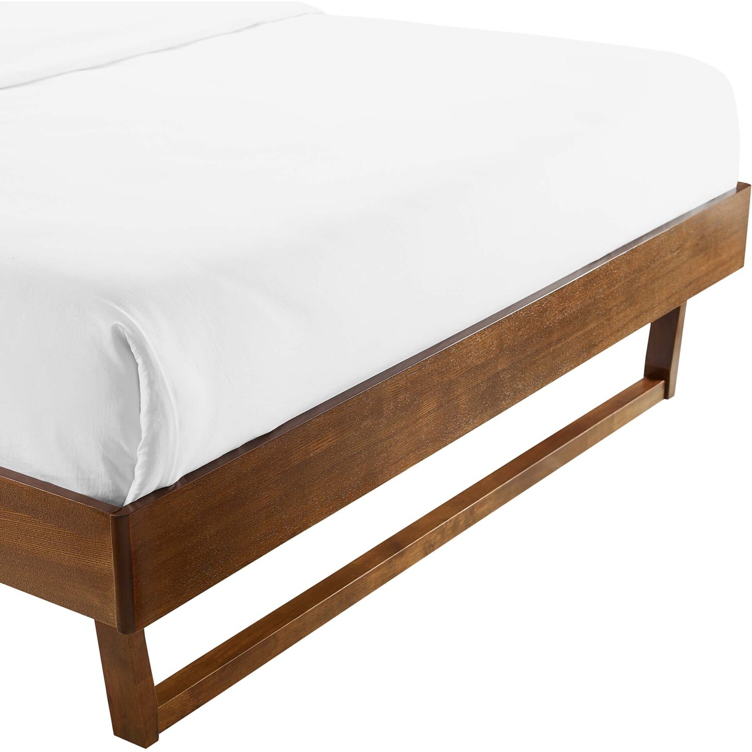 Set the stage for modern style and comfortable sleep with the Billie King Platform Bed. Inspired by mid-century design, this king size bed frame boasts retro detail with contemporary accents and organic aesthetics to bring trending modernity to your master bedroom or guest room. Adapting to any decor theme with the option of interchangeable headboards, this bed frame is compatible with the Robbie, Draper, Archie, and Collins headboard collections. This platform bed frame is a sturdy addition to the bedroom with a durable wood, MDF, and veneer construction and angular rubberwood legs. Eliminating the need for a box spring, this king bed is complete with a wood slat support system, reinforced center beam, and supporting legs that make it a lasting mattress foundation for memory foam, latex, innerspring, and hybrid mattresses. Assembly required. King Bed Frame Weight Capacity: 601 lbs.King Platform Bed Frame