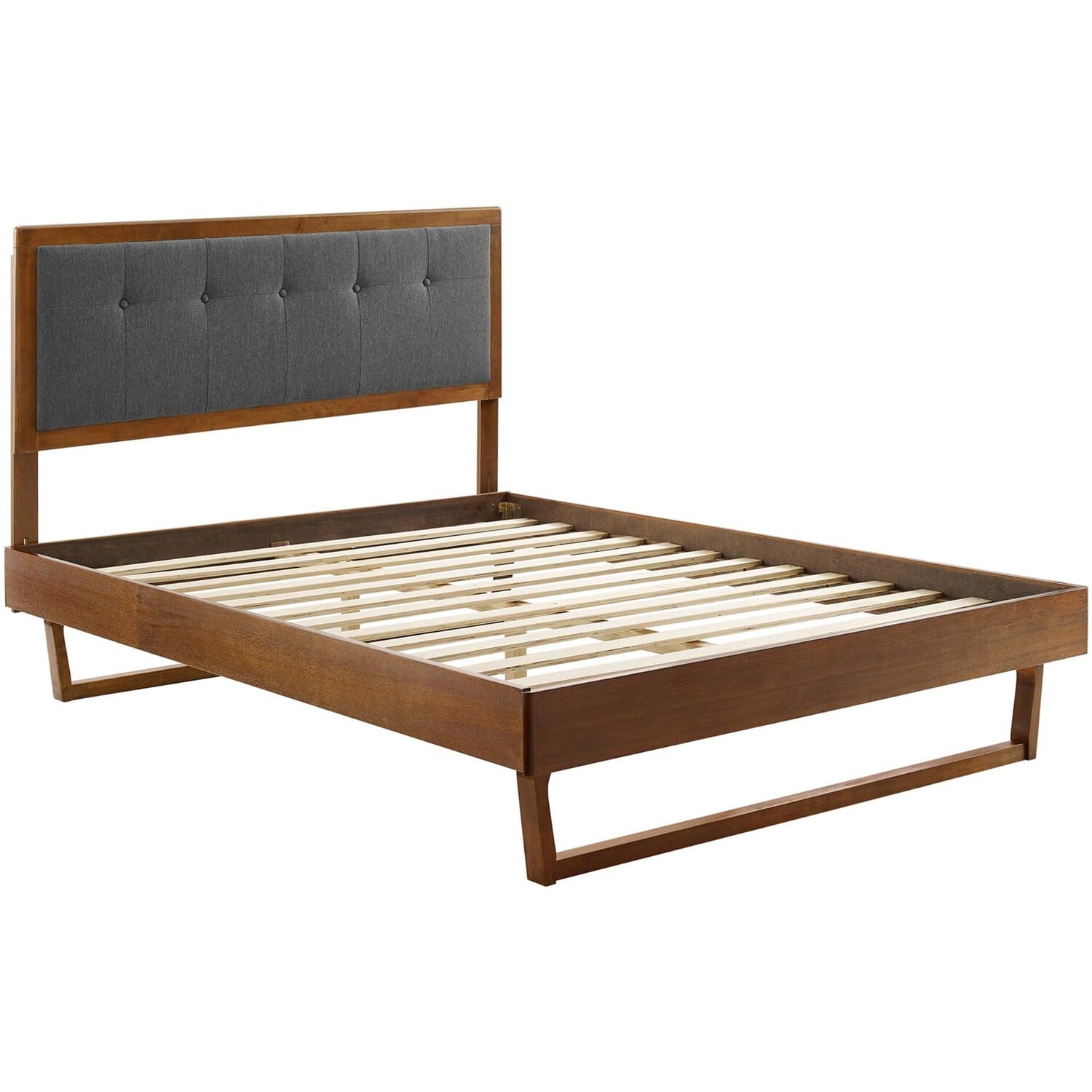 Refresh your master bedroom or guest room with the modern style, retro detail, and organic aesthetics of the Willow Tufted Wood Queen Platform Bed. Inspired by mid-century style, the upholstered headboard of this queen bed frame features a beautiful wood frame that encases a button tufted design. This platform bed frame is a sturdy addition to the bedroom with a durable wood, MDF, and veneer construction and an angular rubberwood frame. Eliminating the need for a box spring, this queen bed is complete with a wood slat support system, reinforced center beam, and supporting legs that make it a lasting mattress foundation for memory foam, latex, innerspring, and hybrid mattresses. Assembly required. Queen Bed Frame Weight Capacity: 601 lbs.Queen Platform Bed Frame
