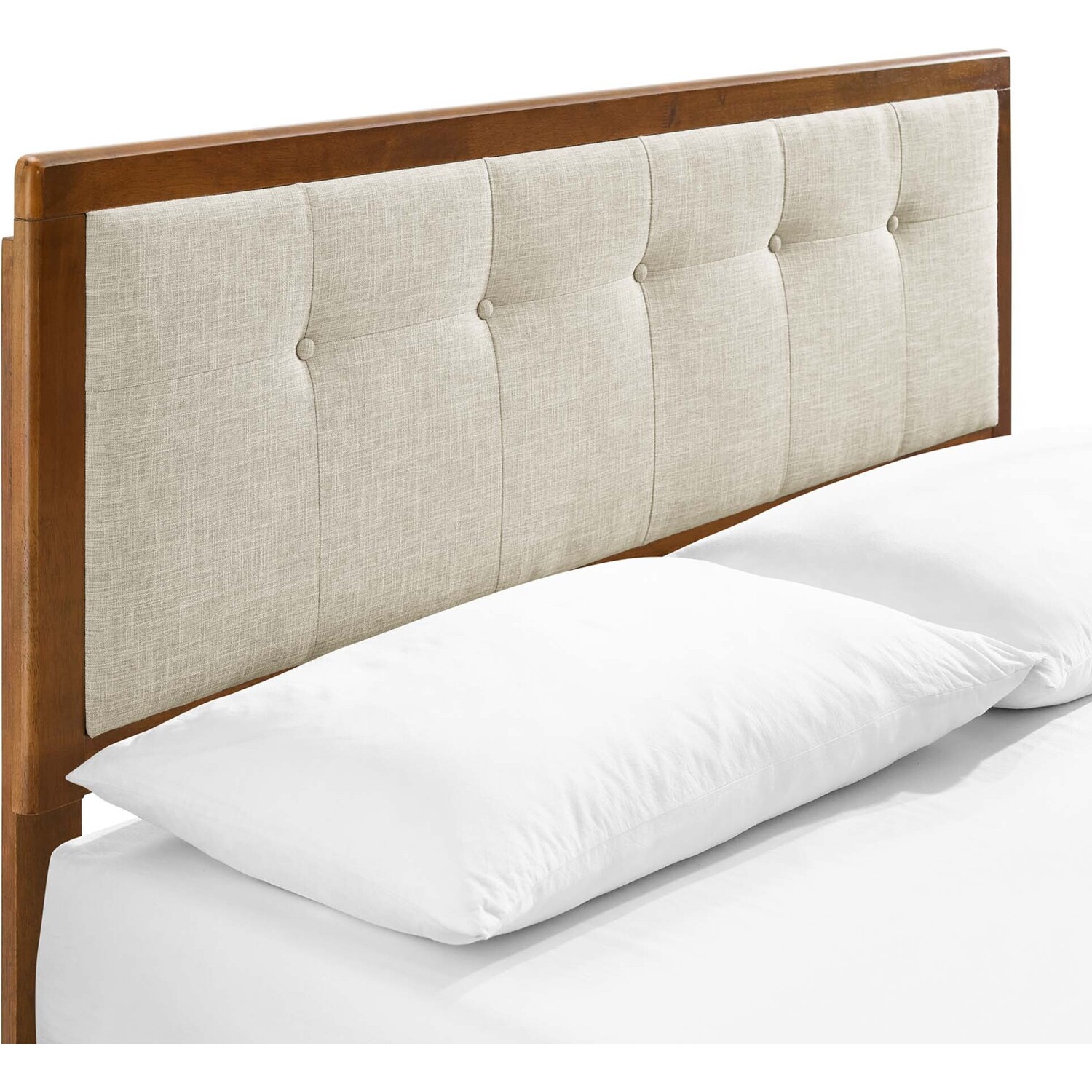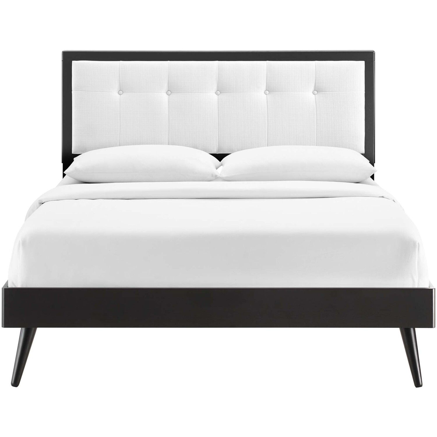 Refresh your master bedroom or guest room with the modern style, retro detail, and organic aesthetics of the Willow Tufted Wood Queen Platform Bed. Inspired by mid-century style, the upholstered headboard of this queen bed frame features a beautiful wood frame that encases a button tufted design. This platform bed frame is a sturdy addition to the bedroom with a durable wood, MDF, and veneer construction and splayed rubberwood legs. Eliminating the need for a box spring, this queen bed is complete with a wood slat support system, reinforced center beam, and supporting legs that make it a lasting mattress foundation for memory foam, latex, innerspring, and hybrid mattresses. Assembly required. Queen Bed Frame Weight Capacity: 601 lbs.Queen Platform Bed Frame