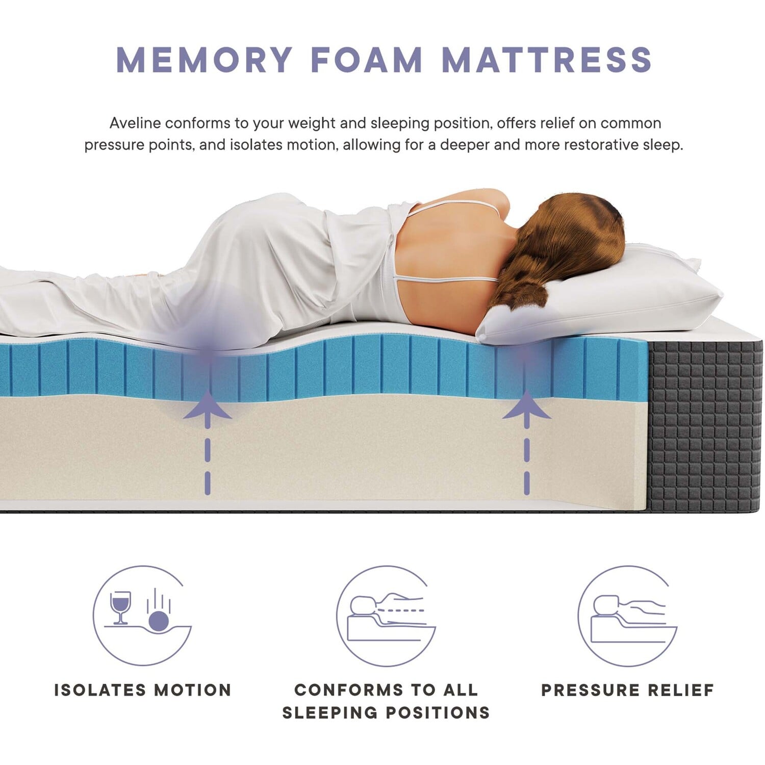 Indulge in deeper, more restorative sleep with the Aveline 14” Full Mattress. Topped with breathable gel-infused memory foam to keep your body climate steady and cool, this mattress dissipates body heat with abundant ventilation while quickly conforming to your weight and position for ultimate comfort. Sleep peacefully with an open-cell memory foam mattress that relieves pressure points and delivers welcome relief from the aches and pains of traditional mattresses. Reducing bounce between two sleepers, this cooling memory foam mattress is an ideal mattress for couples. Aveline is CertiPUR-US® certified by accredited independent testing laboratories, so you can be confident that the memory foam is made without fiberglass, formaldehyde, ozone depleters, mercury, and other heavy metals including PBDEs, TDCPP or TCEP ("Tris") flame retardants, and is low on VOC. The mattress ships directly to your doorstep. It takes 2 to 4 hours for the mattress to expand most of the way and a day to expand fully. Includes a removable stretch knit diamond patterned cover. Box spring or foundation is optional. Slatted bases should be less than 3" apart.5" Cooling Gel-Infused Memory Foam