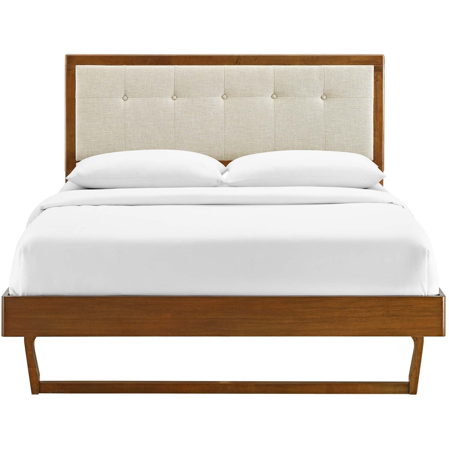 Refresh your master bedroom or guest room with the modern style, retro detail, and organic aesthetics of the Willow Tufted Wood King Platform Bed. Inspired by mid-century style, the upholstered headboard of this king bed frame features a beautiful wood frame that encases a button tufted design. This platform bed frame is a sturdy addition to the bedroom with a durable wood, MDF, and veneer construction and an angular rubberwood frame. Eliminating the need for a box spring, this king bed is complete with a wood slat support system, reinforced center beam, and supporting legs that make it a lasting mattress foundation for memory foam, latex, innerspring, and hybrid mattresses. Assembly required. King Bed Frame Weight Capacity: 601 lbs.King Platform Bed Frame