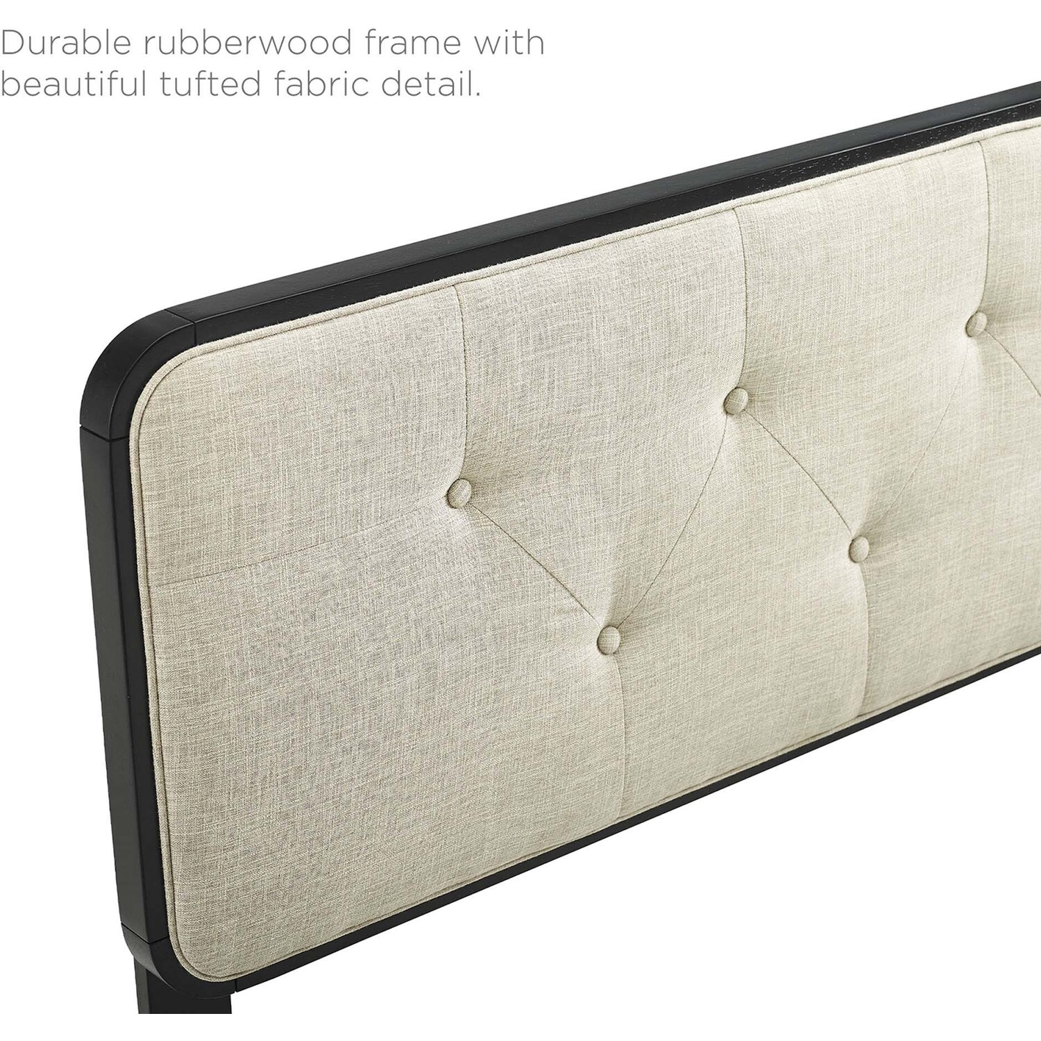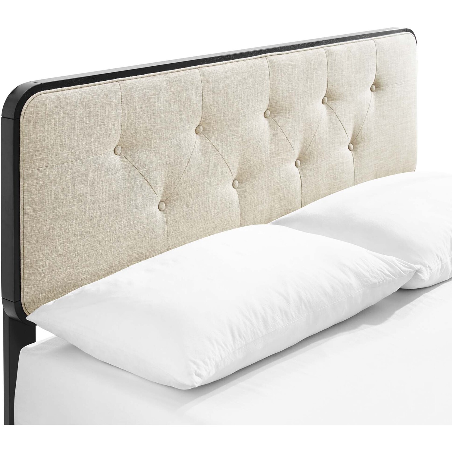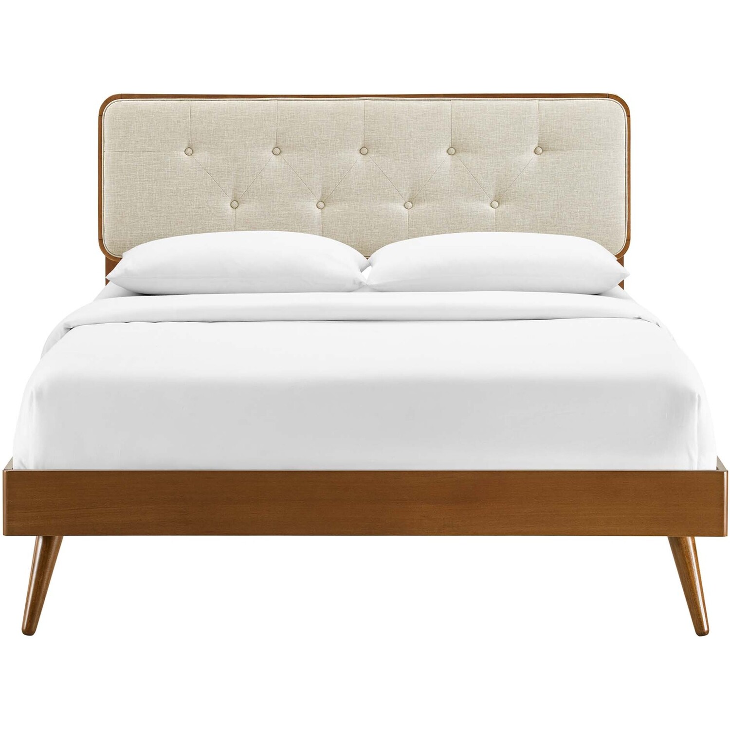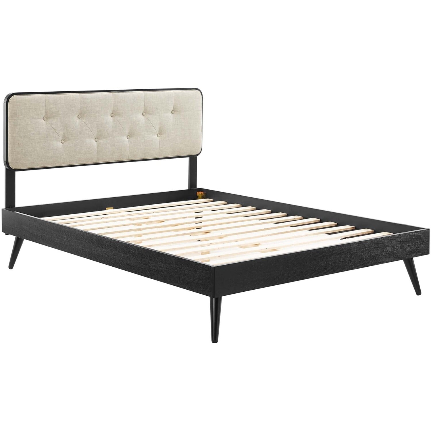 Infuse modern style into your master bedroom or guest room decor with the retro detail and organic aesthetics of the Bridgette Tufted Wood Full Platform Bed. Inspired by mid-century style, the upholstered headboard on this full bed frame features a classic button tufted design framed in rich wood grain. This platform bed frame is a sturdy addition to the bedroom with a durable wood, MDF, and veneer construction and splayed rubberwood legs. Eliminating the need for a box spring, this full bed is complete with a wood slat support system, reinforced center beam, and supporting legs that make it a lasting mattress foundation for memory foam, latex, innerspring, and hybrid mattresses. Assembly required. Full Bed Frame Weight Capacity: 601 lbs.Full Platform Bed Frame