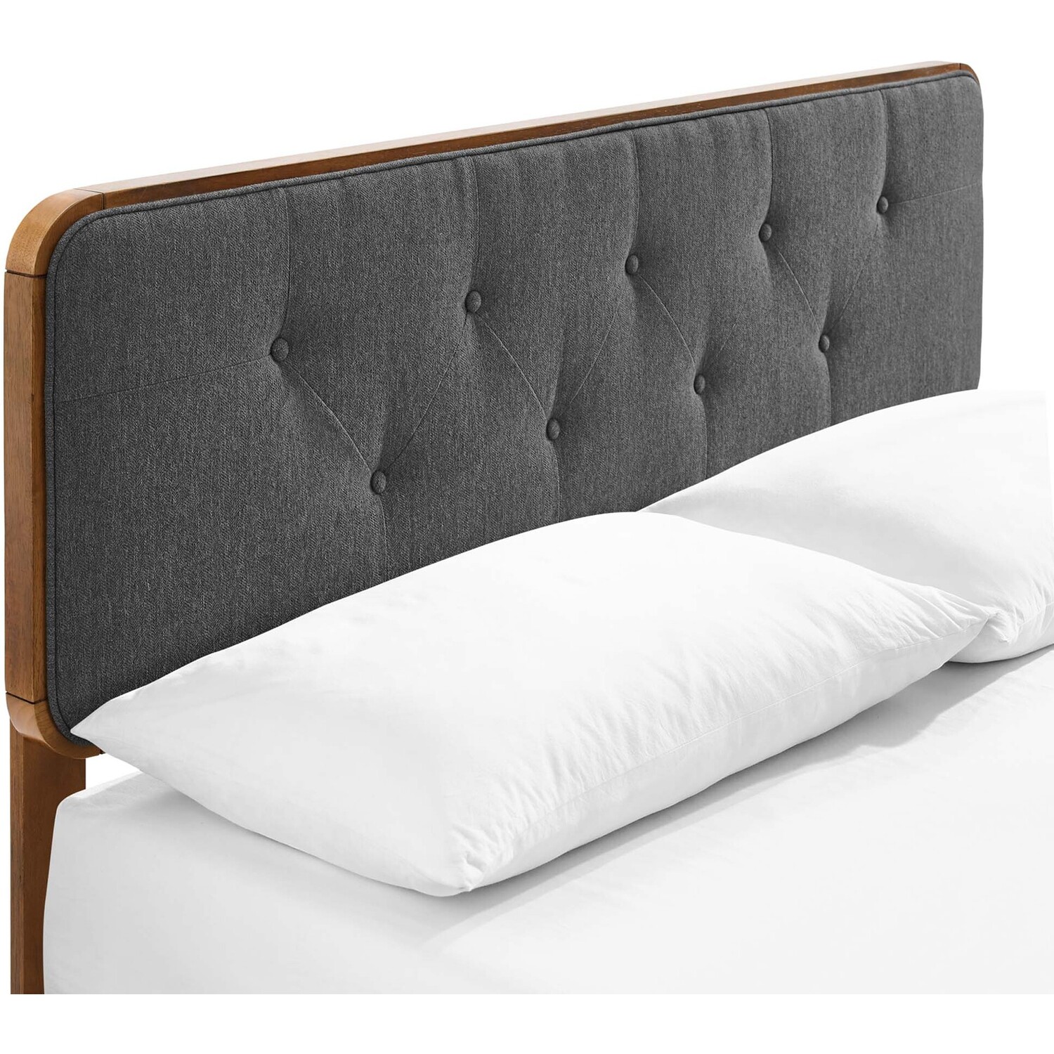 Infuse modern style into your master bedroom or guest room decor with the retro detail and organic aesthetics of the Bridgette Tufted Wood King Platform Bed. Inspired by mid-century style, the upholstered headboard on this king bed frame features a classic button tufted design framed in rich wood grain. This platform bed frame is a sturdy addition to the bedroom with a durable wood, MDF, and veneer construction and splayed rubberwood legs. Eliminating the need for a box spring, this king bed is complete with a wood slat support system, reinforced center beam, and supporting legs that make it a lasting mattress foundation for memory foam, latex, innerspring, and hybrid mattresses. Assembly required. King Bed Frame Weight Capacity: 601 lbs.King Platform Bed Frame