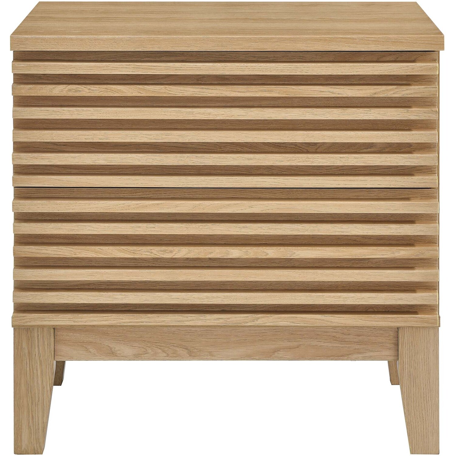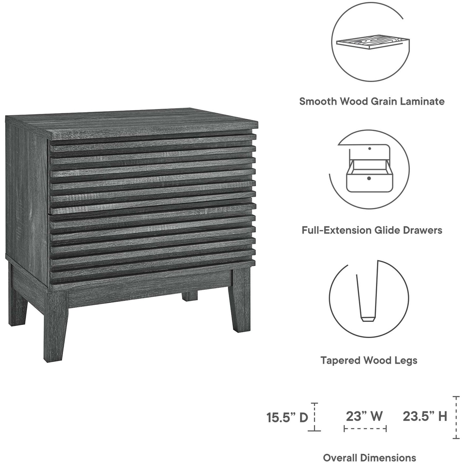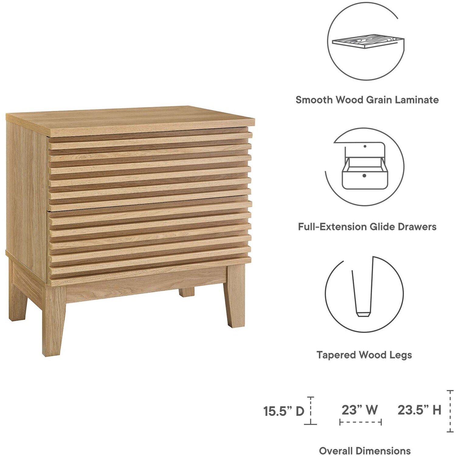 Tap into mid-century aesthetics with the Render Nightstand. With dual usage as an end table in the living room, this nightstand features a durable particleboard frame with a smooth wood grain laminate, four tapered wood legs, and full-extension glide drawers. Boasting a mid-century modern style this accent table features a solid construction with a pleasing look and practical functionality that's perfect for the bedroom. Two full-extension drawers offer ample storage space to keep your bedside essentials neat and organized.Mid-Century Bedside Table