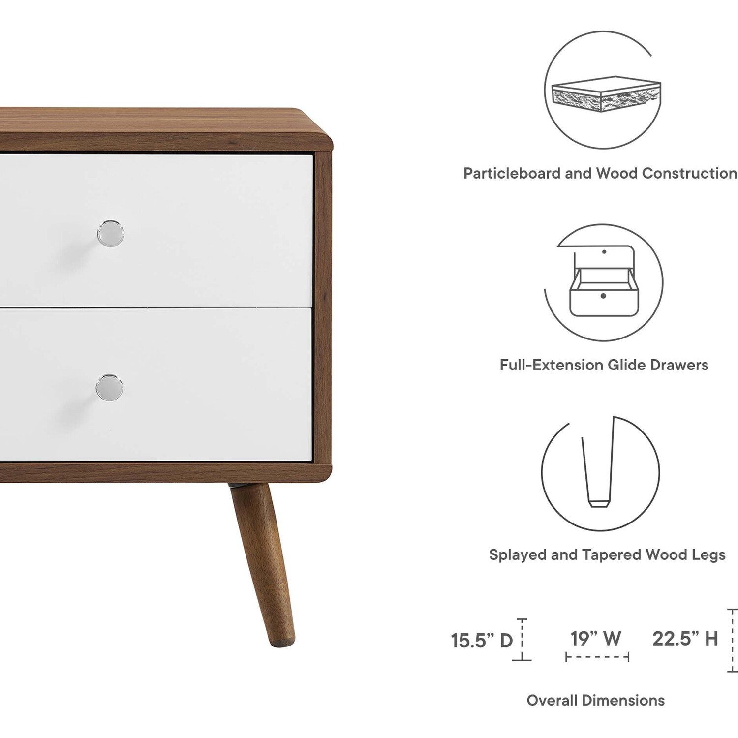 Harness the iconic energy of mid-century style in your master bedroom or guest room with the Transmit 2-Drawer Nightstand. Featuring two full-extension white lacquer drawers with chrome metal pulls, Transmit is crafted with solid wood and particleboard, smooth walnut grain laminate, and four wood tapered legs. Display a bedside table lamp, book, journal, or alarm clock on this contemporary nightstand while concealing bedside essentials in the spacious drawers. This nightstand also serves as a stylish accent side table in the living room. Assembly required.Mid-Century Style Nightstand