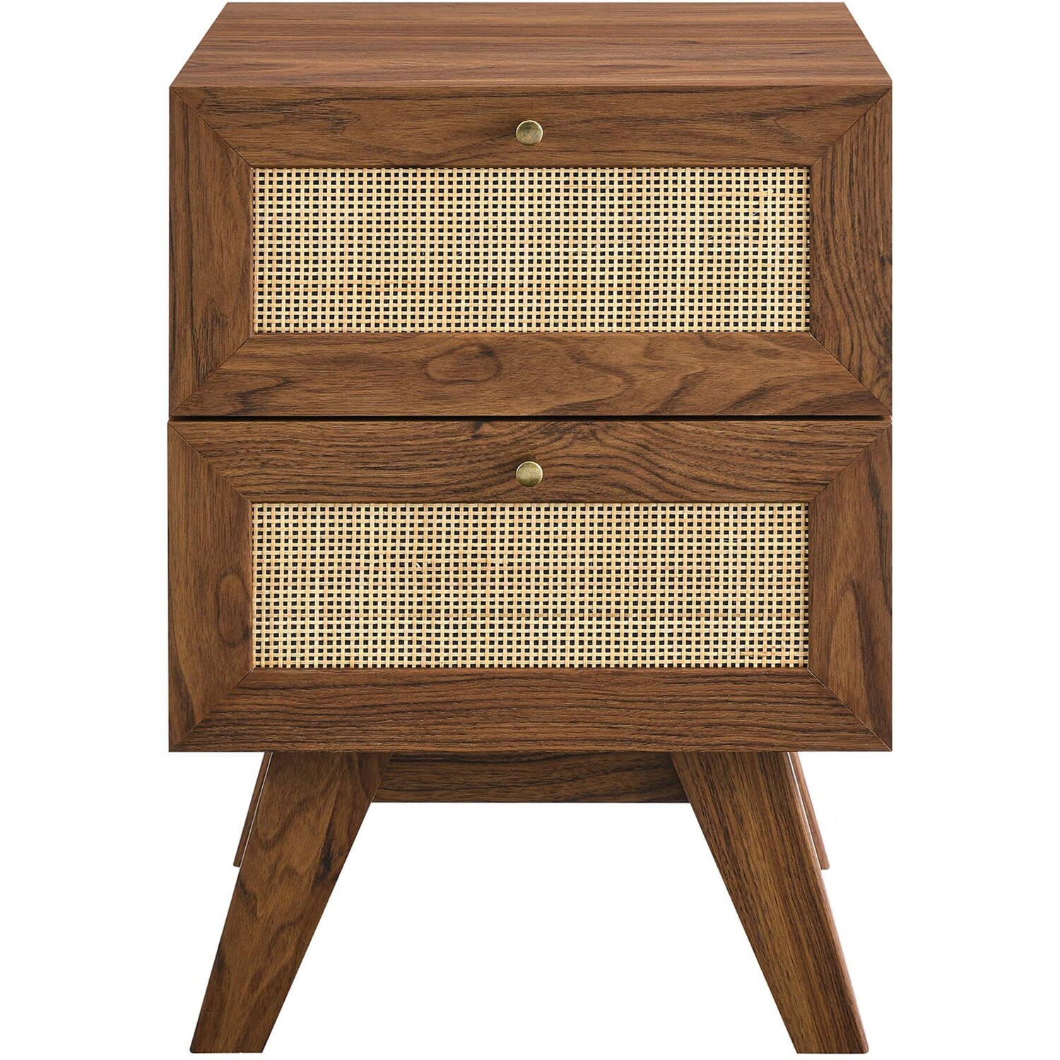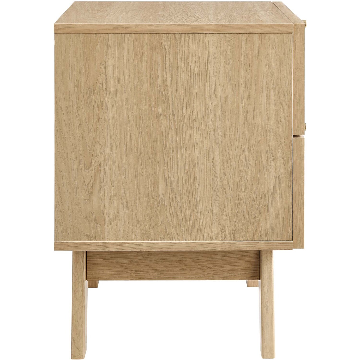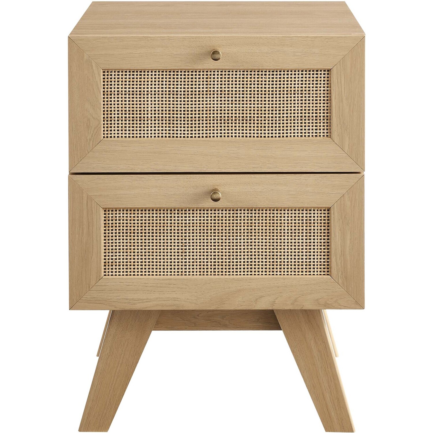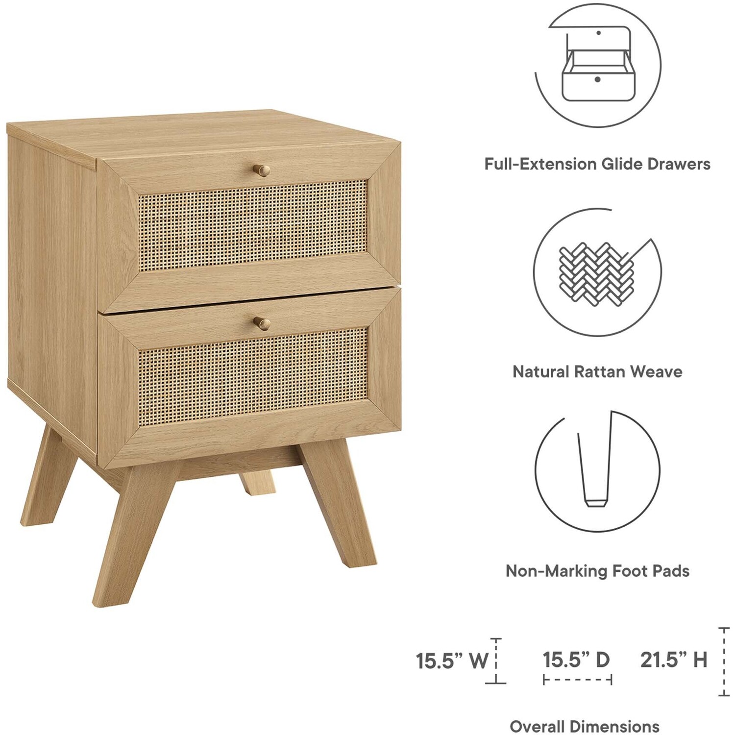 Introduce refreshing style to a primary or guest bedroom with the Soma 2-Drawer Nightstand. Showcasing a beautiful rattan weave on the squared drawer fronts, this nightstand brings organic aesthetics and modern functionality to a bedroom space or living area when used as a side table. This accent table is crafted from durable MDF and particleboard with a natural wood grain finish. This bedside table is complete with two full-extension glide drawers to help conceal bedside essentials. Resting on splayed legs, Soma includes non-marking foot pads to protect flooring. Assembly required.Modern 2-Drawer Nightstand