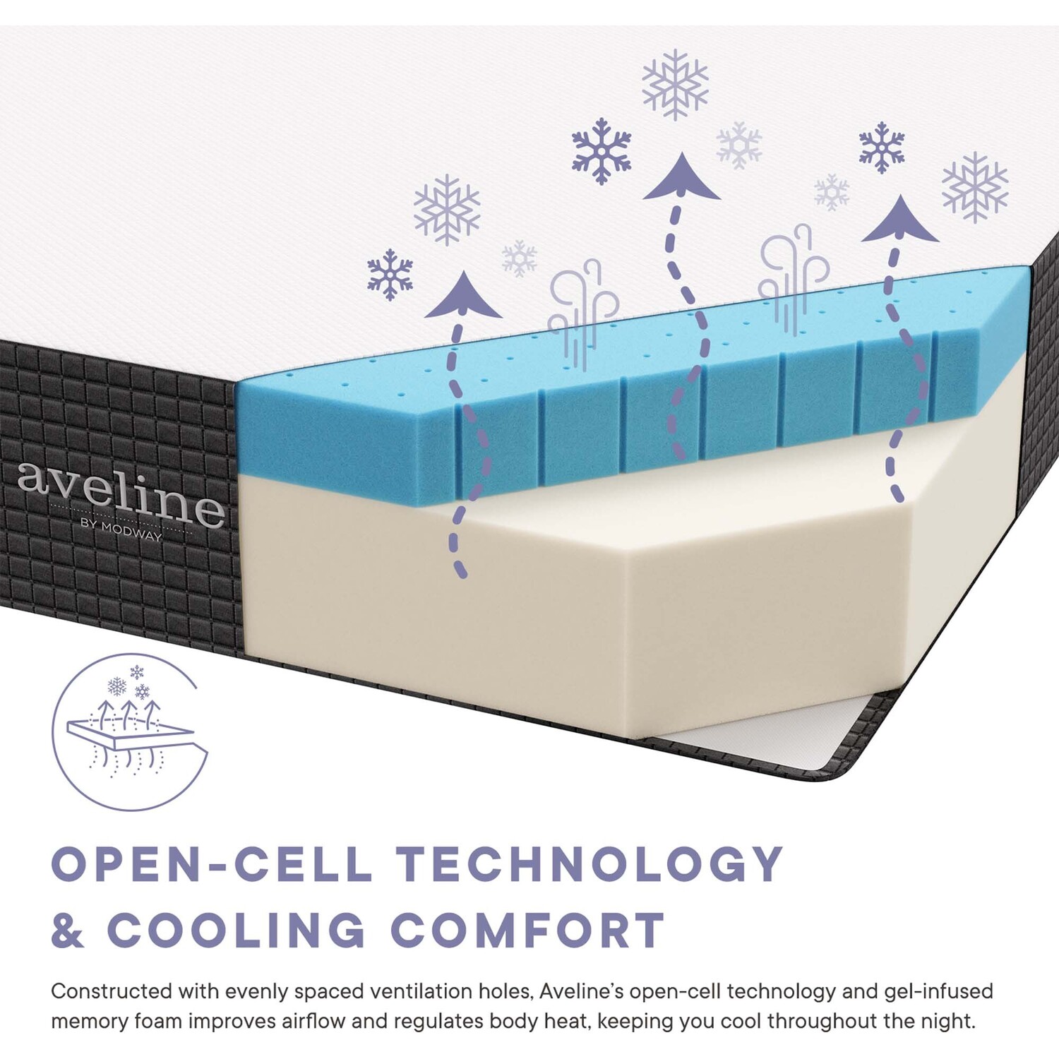 Dive into a more rejuvenating sleep with the Aveline 12” California King Mattress. Its top layer of breathable gel-infused memory foam ensures a steady, cool body climate by efficiently dispersing body heat. This mattress rapidly adjusts to your weight and posture, offering unparalleled comfort. Minimizing motion transfer between sleepers, Aveline is perfect for couples seeking undisturbed rest. Enjoy the benefits of this foam mattress to ease pressure points, giving relief from traditional mattress discomforts. Proudly CertiPUR-US® certified, Aveline's memory foam has been verified by independent labs to be free from fiberglass, formaldehyde, ozone depleters, mercury, and other heavy metals. This mattress ships compressed and rolled in a box, directly to your doorstep. It takes 2 to 4 hours for the mattress to expand most of the way and a day to expand fully. Includes a removable stretch knit diamond patterned cover. Box spring or foundation is optional. Slatted bases should be less than 3" apart.4" Cooling Gel-Infused Memory Foam