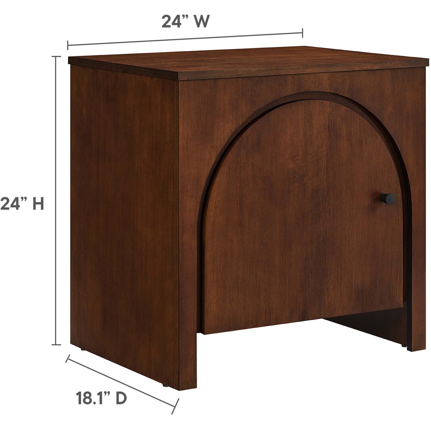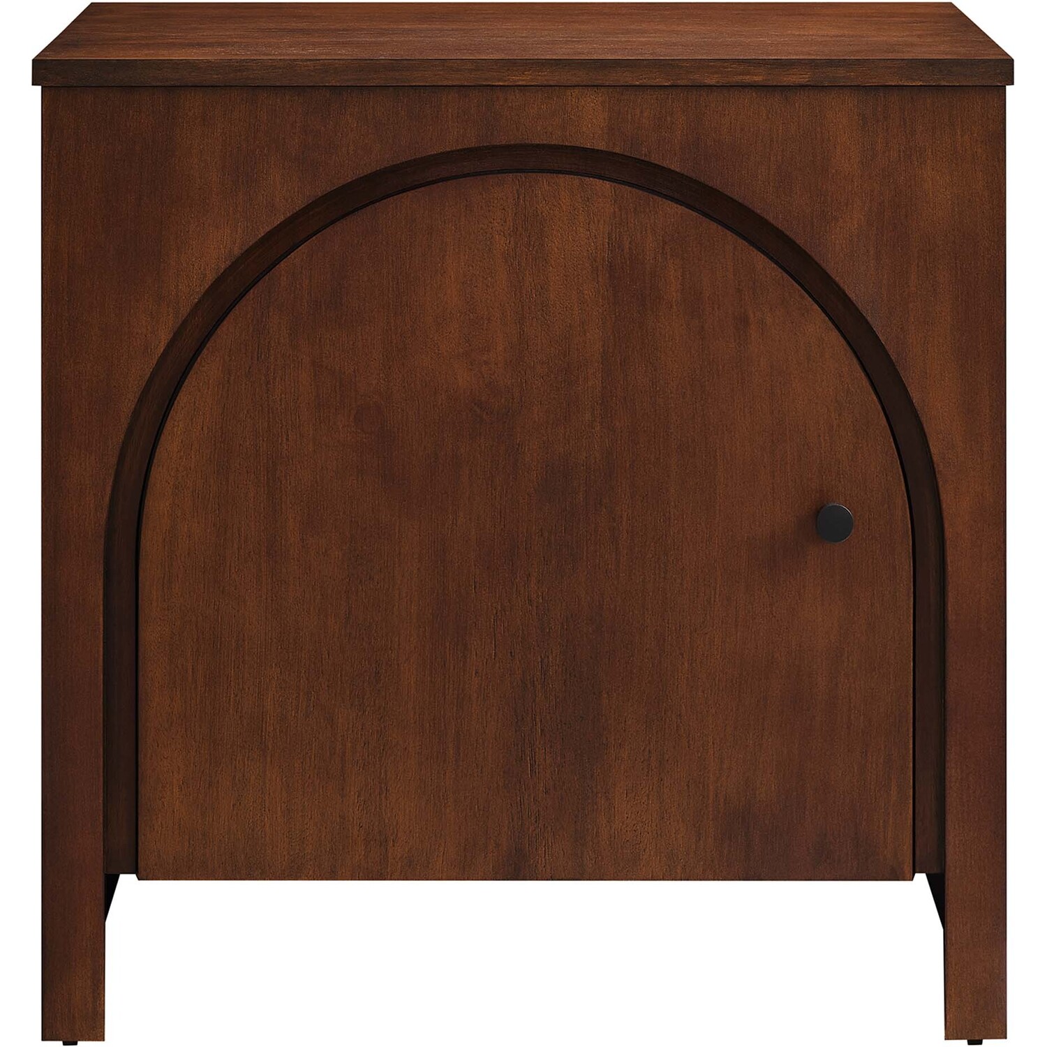 Elevate your bedroom with the Appia Arched Door Nightstand, a blend of modern design and timeless functionality. Crafted from durable MDF and adorned with a mango wood veneer, this small nightstand features a mid-century wood grain that brings organic warmth to any bedroom setting. The nightstand's arched door, an ode to contemporary elegance, opens to reveal a spacious open cabinet, offering convenient storage for bedside essentials. This versatile 1 door nightstand transcends its role as merely a bedside table, effortlessly serving as a modern accent table, or even a stylish side or end table in the living room or lounge area. Boasting non-marking adjustable levelers, the Appia Nightstand grants stability and floor protection. Suitable for various spaces, from bedrooms to living areas, this wood nightstand is designed to complement an elevated decor style. Enhance your bedroom furniture with this arched nightstand designed for everyday use. Assembly Required. Tabletop Weight Capacity: 150 lbs.Mango Wood Veneer