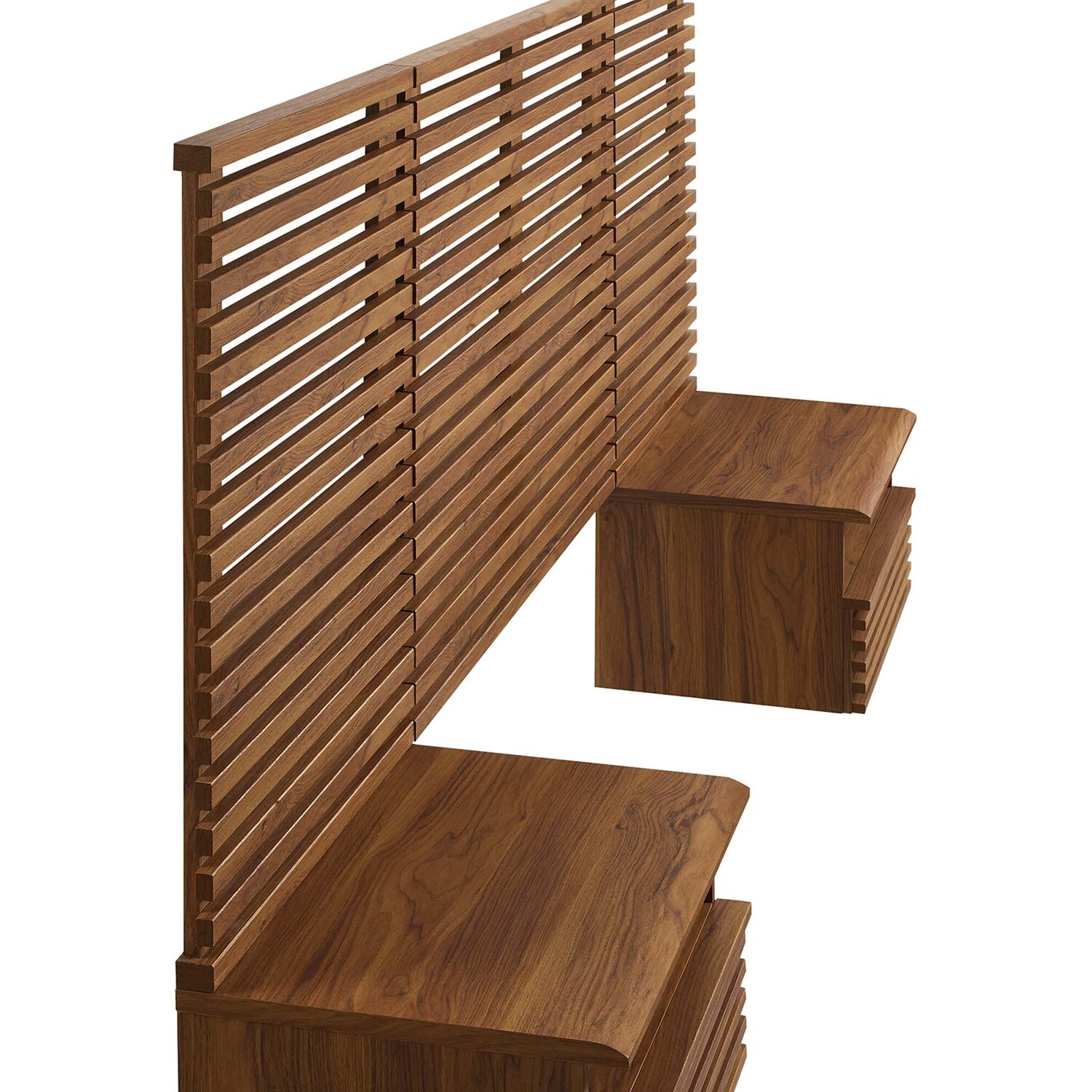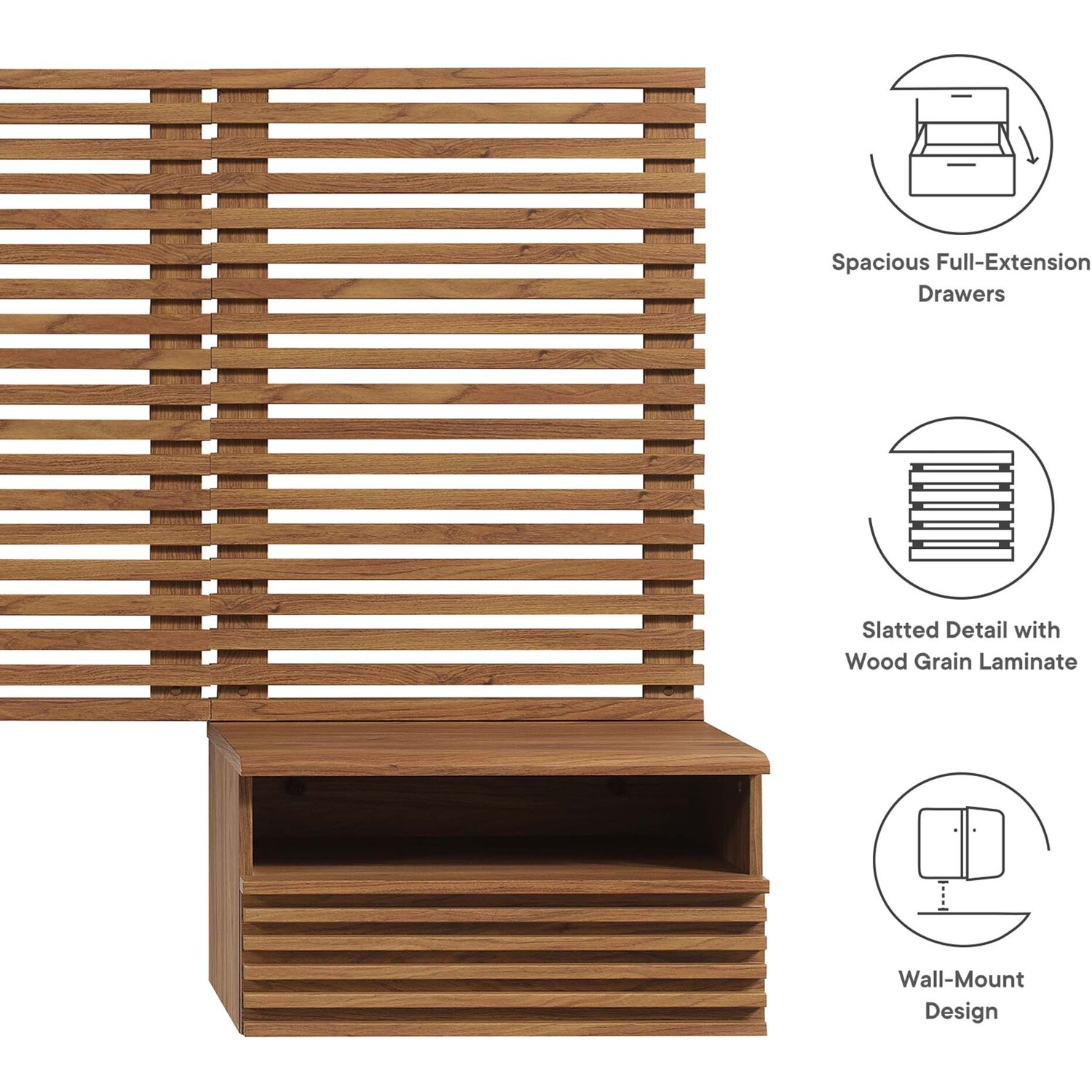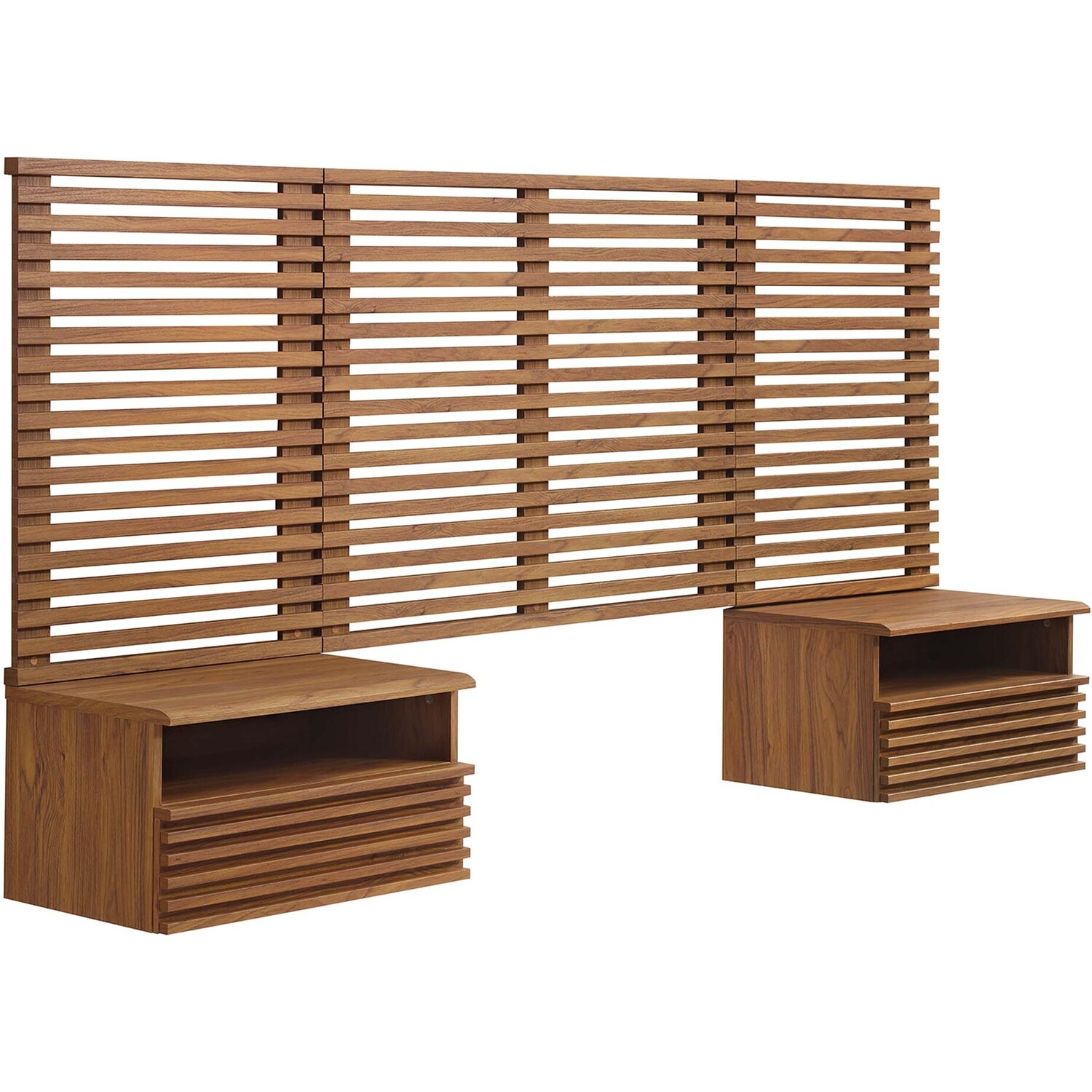 Tap into mid-century aesthetics with the Render Wall-Mount Twin Headboard and Nightstands Set. With slatted detail commanding a presence in a kid's bedroom or guest bedroom, this twin size headboard is a collection of panels that feature durable particleboard frames with smooth wood grain laminate. The full-extension glide drawers and open shelves on the nightstands offer ample storage space to keep bedside essentials neat and organized. Both the headboard and the 1-drawer nightstands mount directly to the wall at your desired height to create an eye-catching backdrop in the bedroom.Headboard and Nightstands Set