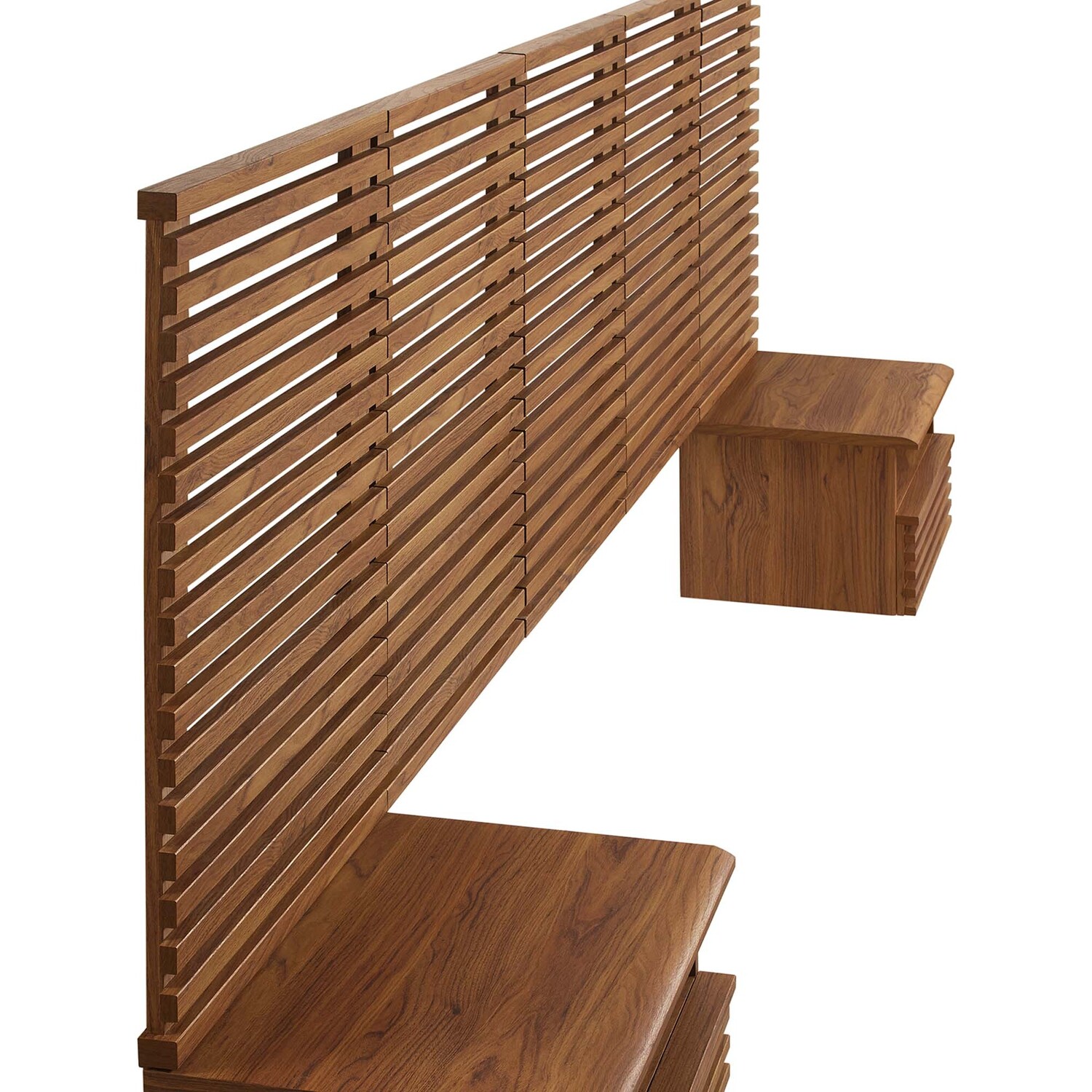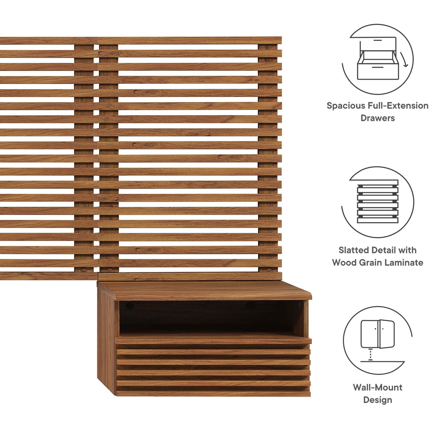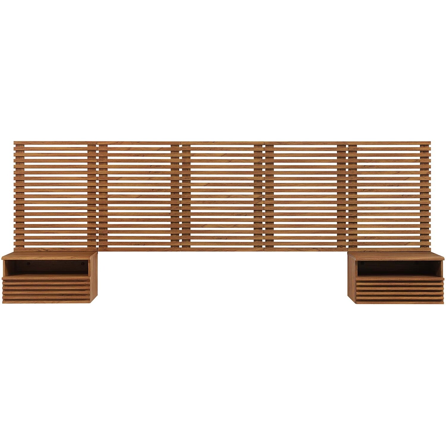 Tap into mid-century aesthetics with the Render Wall-Mount Queen Headboard and Nightstands Set. With slatted detail commanding a presence in a primary bedroom or guest bedroom, this queen size headboard is a collection of panels that feature durable particleboard frames with smooth wood grain laminate. The full-extension glide drawers and open shelves on the nightstands offer ample storage space to keep bedside essentials neat and organized. Both the headboard and the 1-drawer nightstands mount directly to the wall at your desired height to create an eye-catching backdrop in the bedroom.Headboard and Nightstands Set