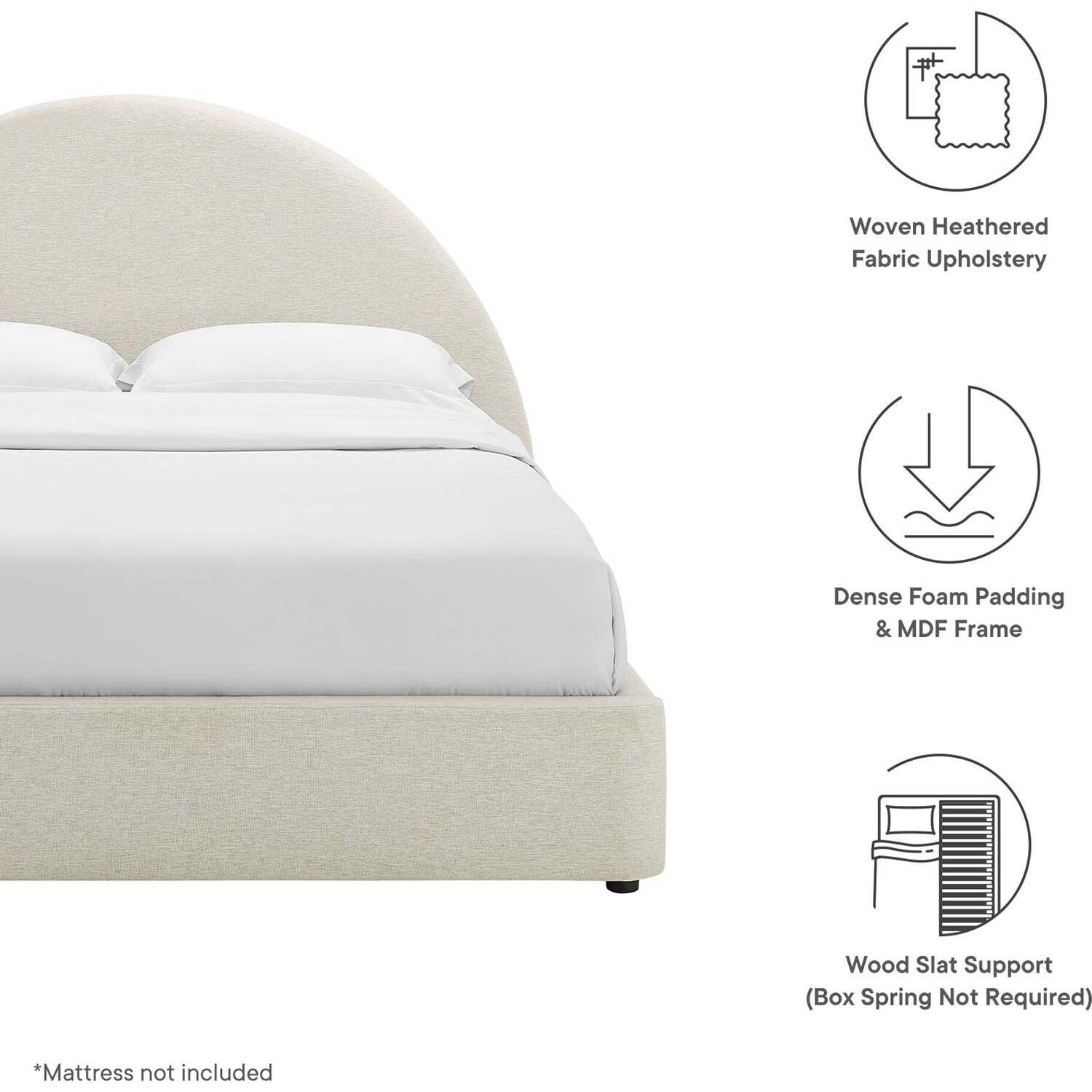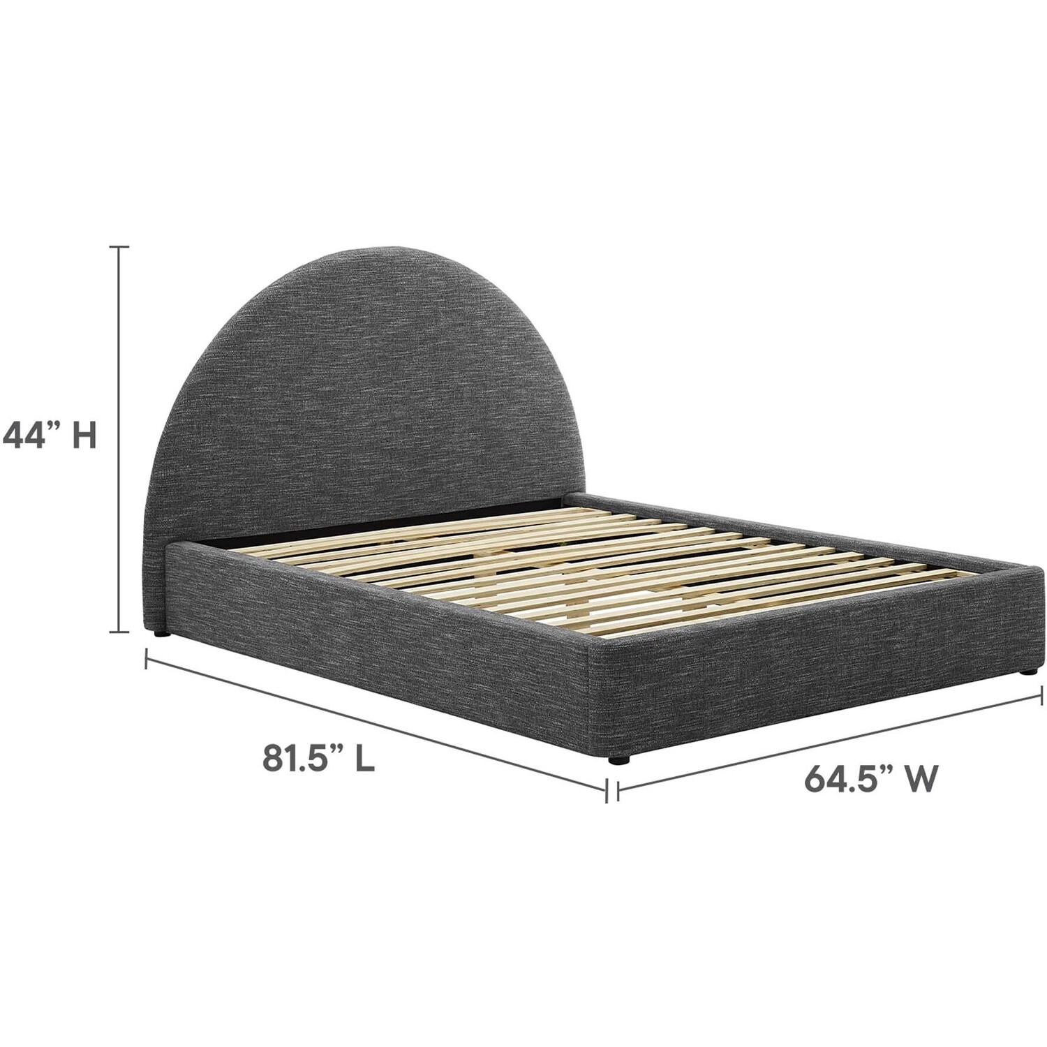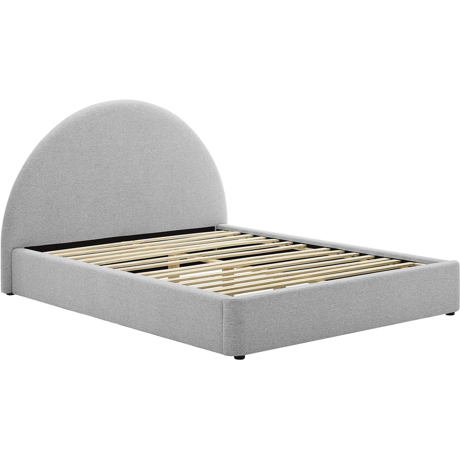 Step into a world of cozy elegance with the Resort full size platform bed. This full bed features a unique arched headboard that brings a fresh perspective to a guest suite or spare room. Upholstered in woven heathered fabric and cushioned with dense foam, this platform bed frame fits various decor styles and offers the luxurious comfort characteristic of a cloud bed. The MDF frame of this full size bed, equipped with a wood slat support system, removes the necessity for a box spring. Its solid double bed frame makes the Resort arch shaped round bed great for memory foam, innerspring, latex, and hybrid mattresses. Outfitted with sturdy LVL legs, each double bed frame comes with non-marking caps to safeguard your floors, blending strength with a sleek, contemporary appearance. Mattress not included. Assembly required. Full Size Bed Frame Weight Capacity: 800 lbs.Full Size Platform Bed