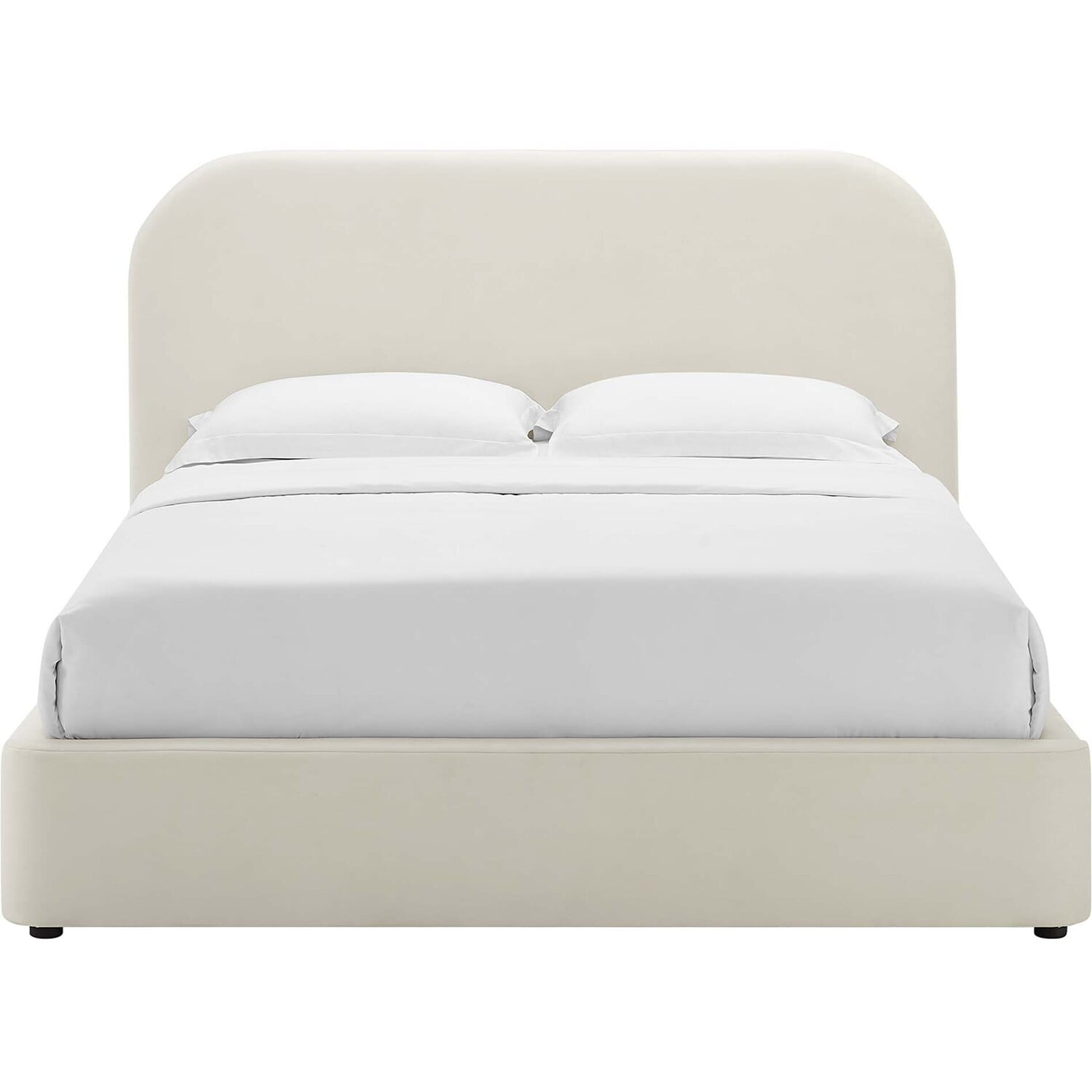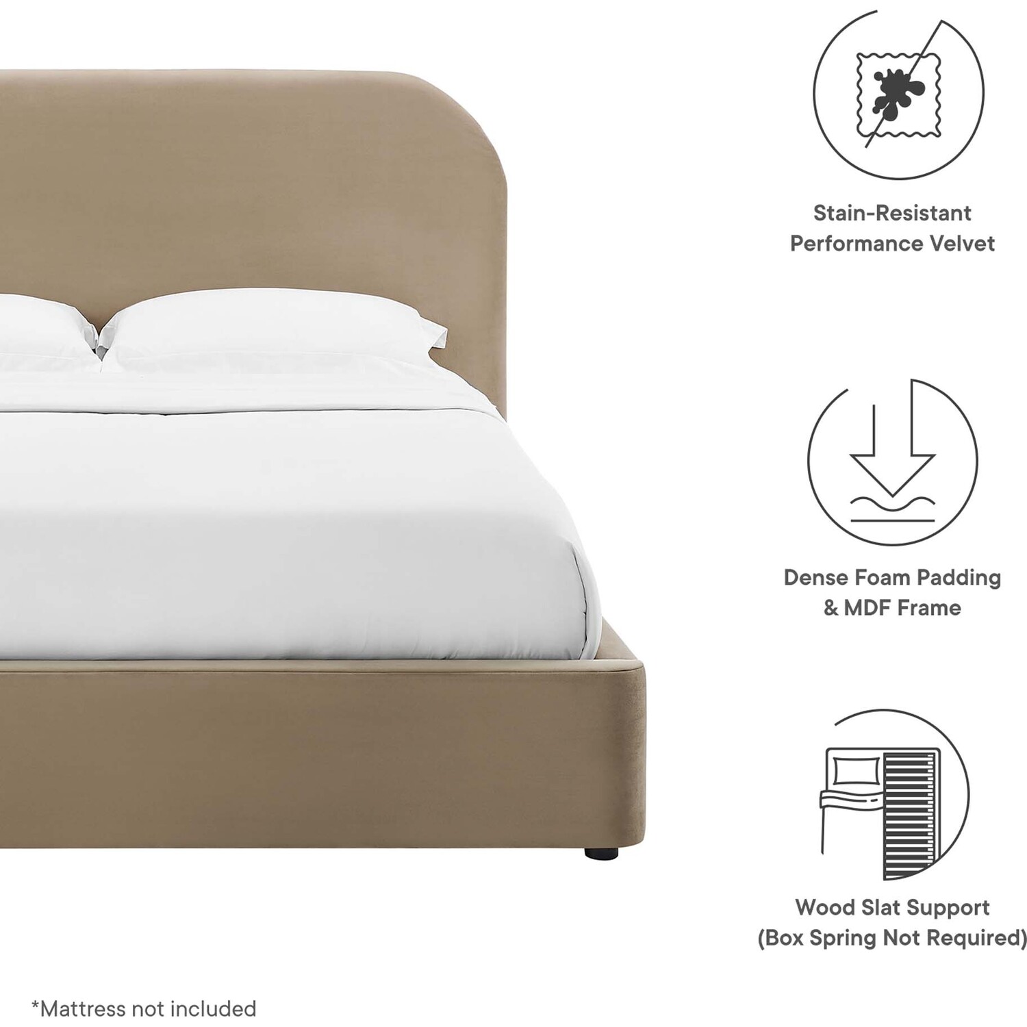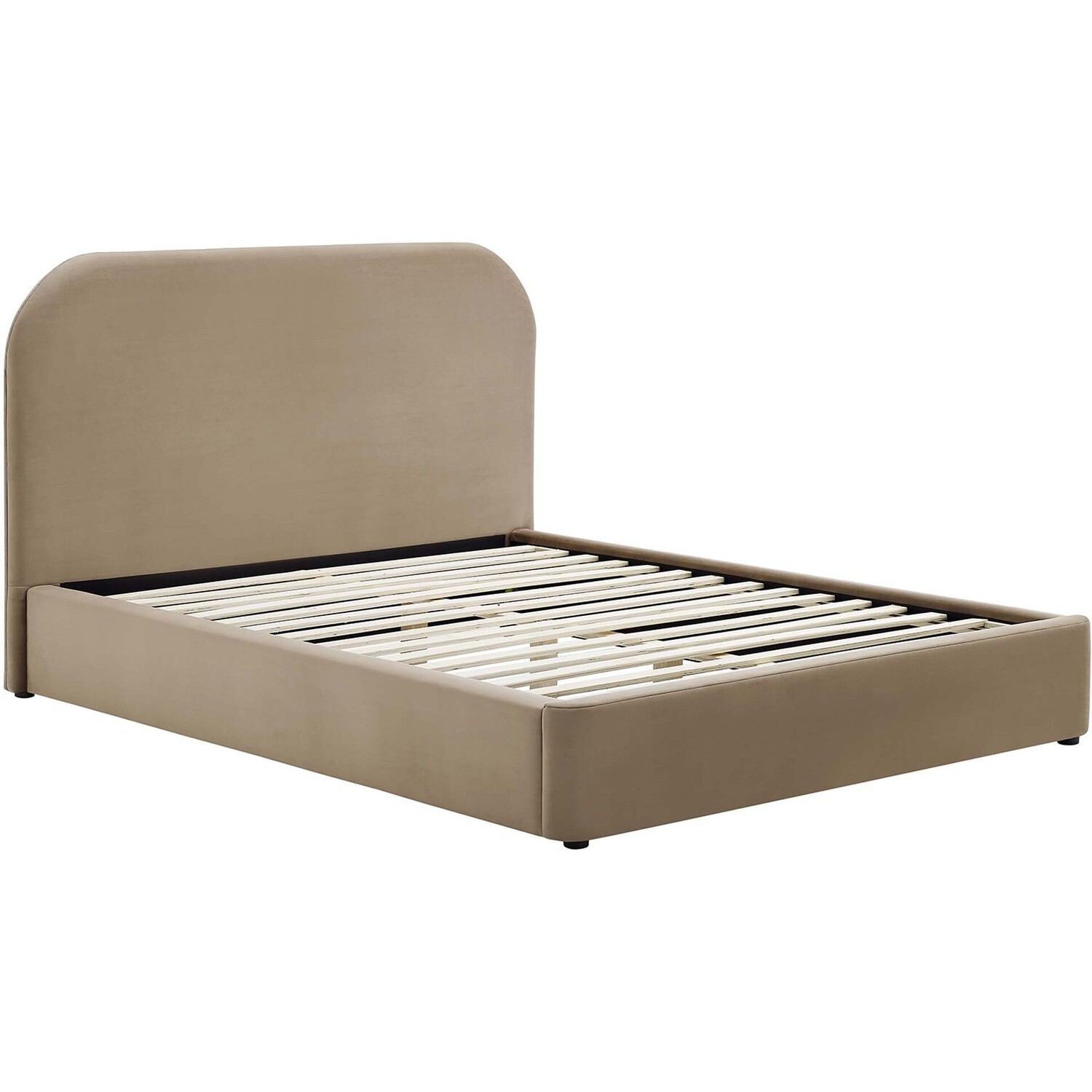 Delight in the upscale serenity of the Keynote king size bed frame. Cloaked in a stain-resistant performance velvet and filled with dense foam, this velvet upholstered bed frame adapts to various decorative themes, making it an excellent choice as a spacious primary bedroom bed or luxury guest bed. Boasting a gently curve shaped headboard, it features a cloud bed frame design that subtly extends beyond the mattress's edge. The robust MDF construction and wooden slat base of the Keynote velvet king bed makes the use of a traditional box spring redundant, making it compatible with all types of mattresses, such as memory foam, innerspring, latex, and hybrid. Each king velvet bed frame stands on practical and durable LVL legs, equipped with non-marking caps to protect floors. The soft king bed frame of the Keynote platform bed, complete with an elegantly upholstered headboard, offers a modern and contemporary upgrade to any bedroom setting. Mattress not included. Assembly required. King Size Bed Frame Weight Capacity: 800 lbs.King Size Platform Bed