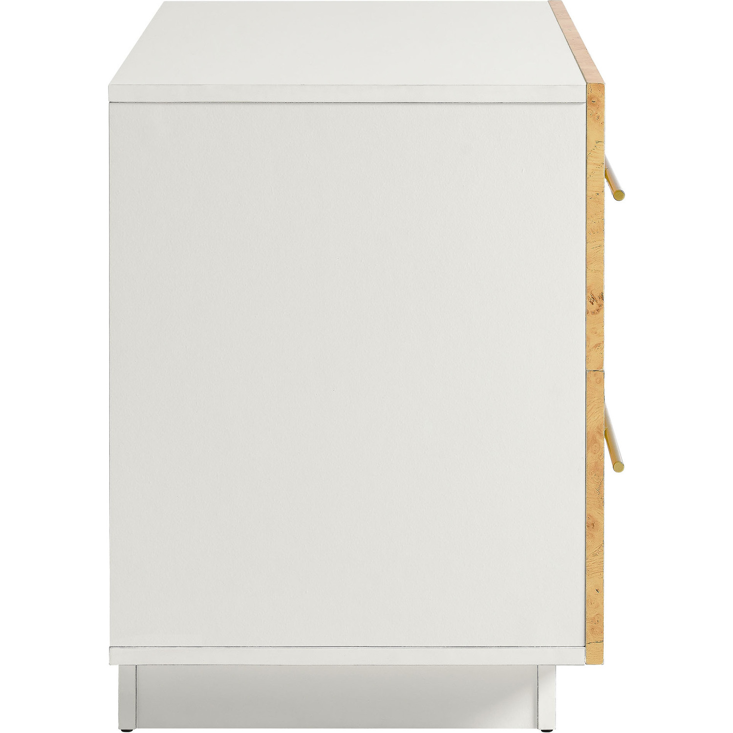 Add a stylish bedroom accent table to your home with the eye-catching Abel Burl Wood Nightstand. A perfect blend of mid-century modern design and practical storage, this bedside table with drawers is crafted from durable particleboard and MDF. Featuring beautifully textured burl wood laminate drawer fronts and elegant gold-tone metal handle pulls, this 2-drawer nightstand is ideal for both modern and farmhouse-inspired interiors. Whether you’re refreshing your bedroom bedside table or updating your living room with a small modern end table, the Abel square side table has you covered with style and storage wherever you need it. While its burl wood laminate adds a timeless, contemporary design, the spacious drawers of this wood bedside table ensure your essentials are always within reach. Assembly required. Weight Capacity: 33 lbs.Particleboard and MDF