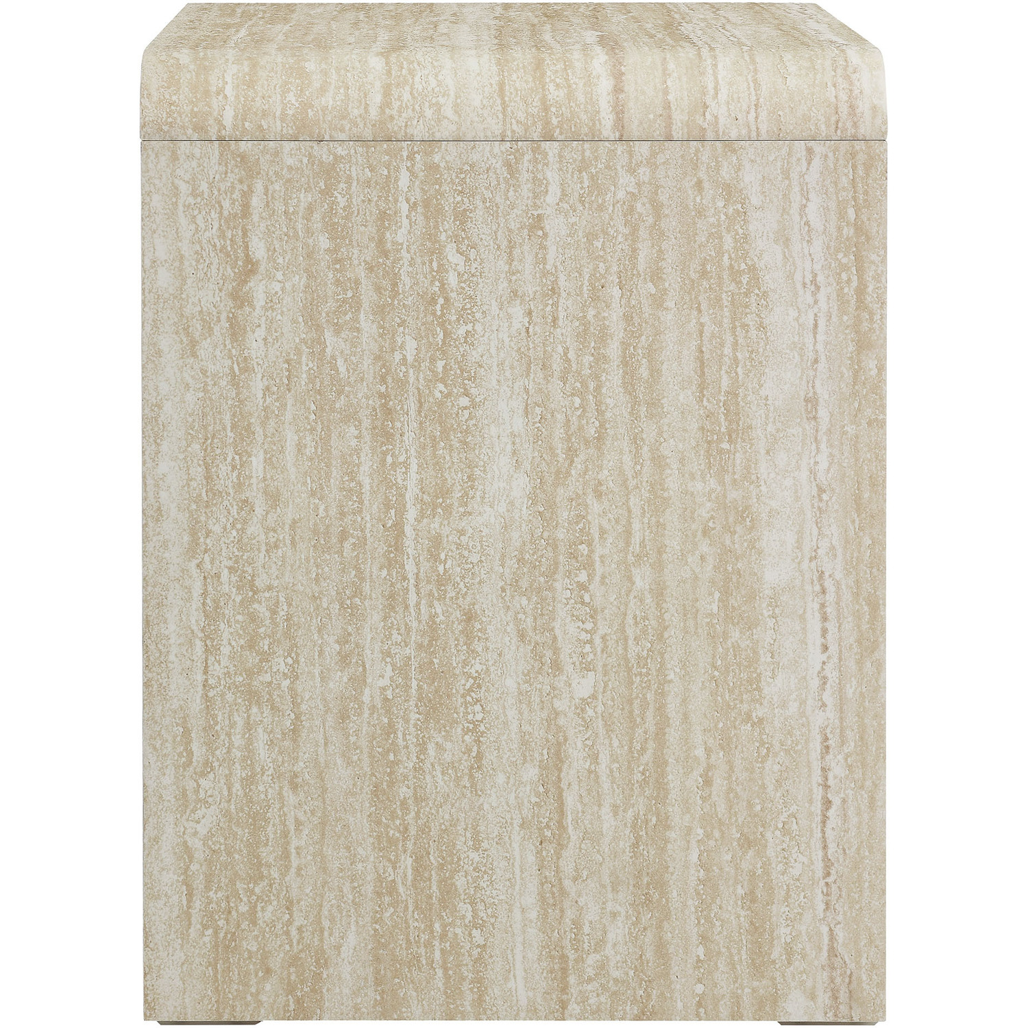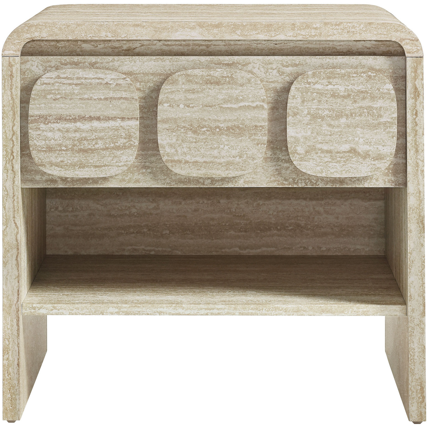Elevate your living or sleeping space with the Toscana 1-Drawer Nightstand featuring rounded corners and a circular pattern motif across the face of the drawer. This elegant nightstand boasts a durable paper laminate for a sleek, contemporary look. Perfect for the bedroom, living room, or office, this modern nightstand combines style and functionality. The full-glide drawer offers smooth operation, and the open shelf below provides additional storage space. Non-marking floor glides keep floors pristine. Whether you use it as a bedside table or an end table for the living room, its versatile design makes this accent table with storage an excellent choice for any setting. Transform your space with this side table with drawer that brings a touch of mid-century elegance to your home. Assembly required.Versatile End Table With Storage