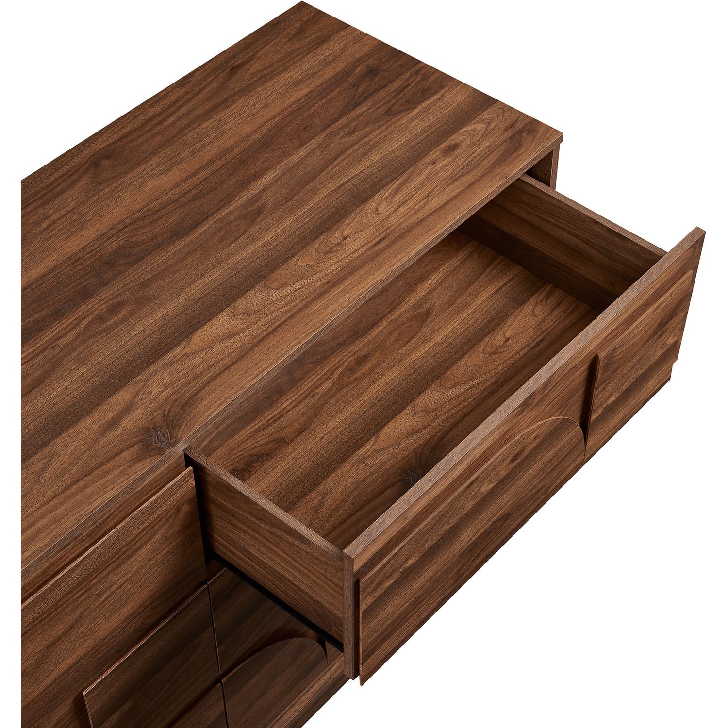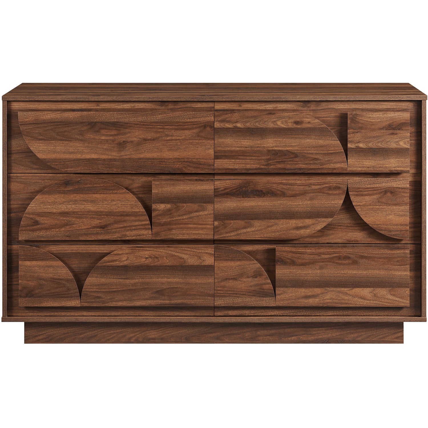 The Bulwark 6-Drawer Dresser combines modern brutalist design elements with ample storage, making it a standout chest cabinet in any space. Featuring a unique geometric design on the drawer fronts, this 6 dresser drawer showcases a striking raised shape pattern motif that adds a touch of artistic flair to a primary bedroom or guest bedroom. The plinth base and framed edges enhance its structured look, while the wood grain laminate finish offers a warm, natural appeal. Crafted from durable particleboard, the Bulwark 57" wide dresser is designed for longevity, with full-glide drawers providing smooth and easy access. Versatile in use, it serves as a perfect modern dresser for the bedroom or a geometric accent cabinet the living room. Whether you’re searching for a double dresser or a storage cabinet for your living space, the Bulwark large dresser with geometric drawer fronts seamlessly combines style and functionality. Assembly required.6-Drawer Dresser
