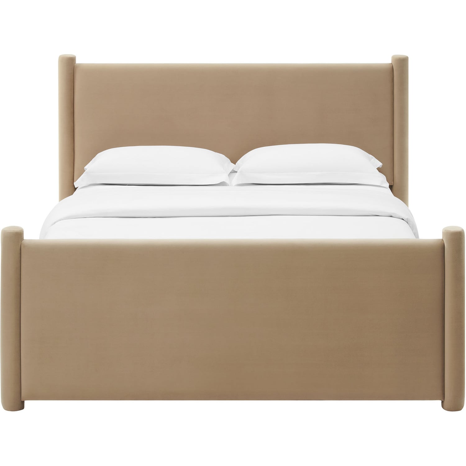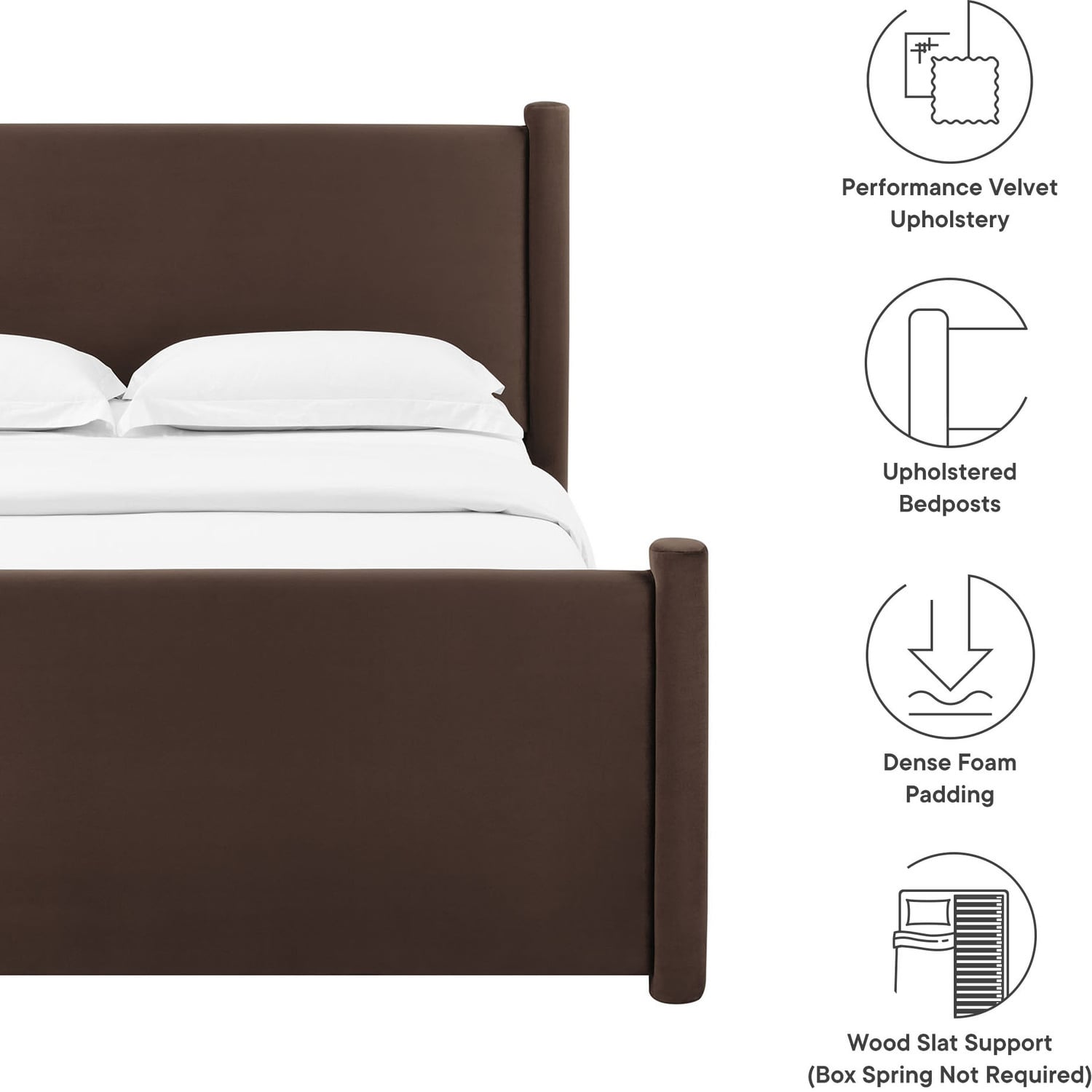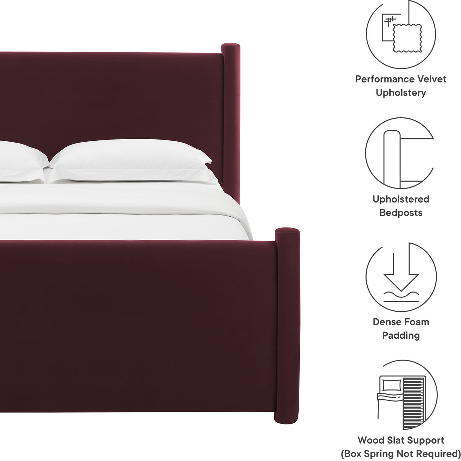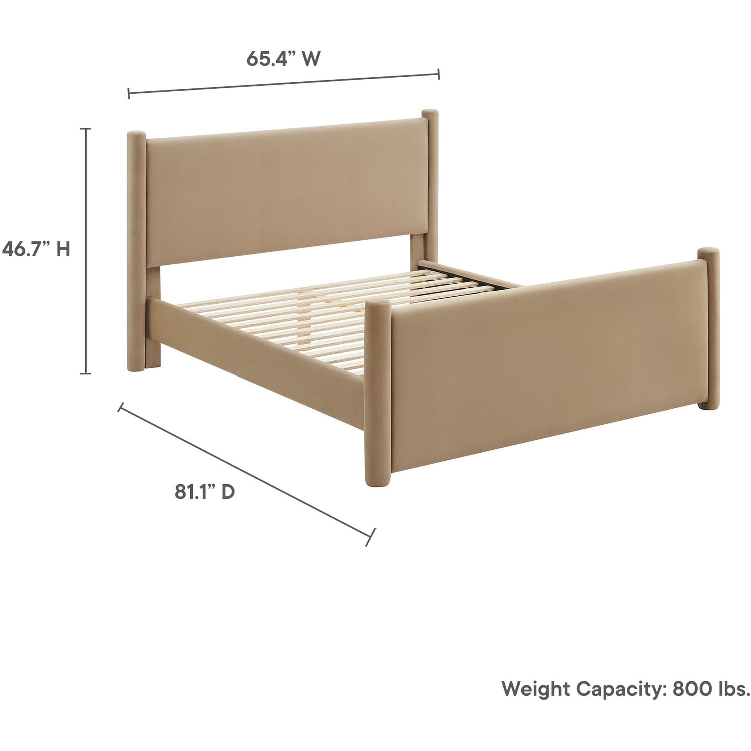 Elevate a small guest bedroom or teen’s room with the modern elegance of the Rael Full Platform Bed Frame. Upholstered in soft, stain-resistant performance velvet, this full upholstered bed features a padded headboard and footboard for a plush, inviting feel. The velvet bed is framed by rounded, upholstered vertical posts that accentuate the headboard and footboard, adding a touch of unique style and dimension. Creating a cohesive, luxurious look, the modern bed frame with pillars is both stylish and functional. The Rael full platform bed includes a sturdy wood slat support system, providing a durable, well-ventilated foundation for a variety of mattress types, eliminating the need for a box spring. Whether used in a guest room or as a full size bed frame for teens, the Rael soft bed frame delivers a sleek and sophisticated upgrade to your decor. Assembly required. Weight Capacity: 800 lbs.Stain-Resistant Performance Velvet Upholstery