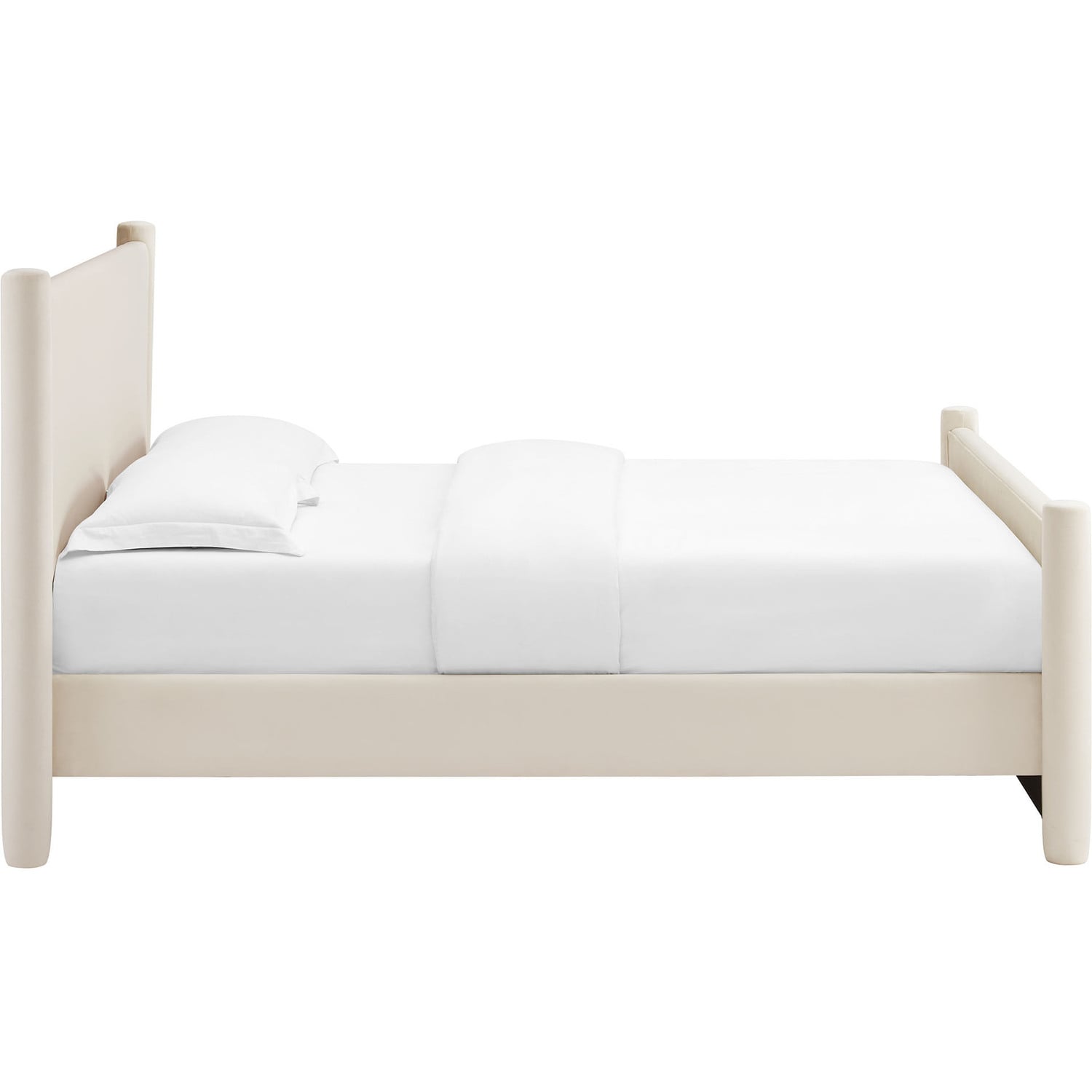 Elevate your primary bedroom or large guest room with the modern elegance of the Rael King Platform Bed Frame. Upholstered in soft, stain-resistant performance velvet, this king size bedframe and headboard features a padded headboard and footboard for a plush, inviting feel. The bed is framed by rounded, upholstered vertical posts that accentuate the king upholstered headboard, adding a touch of unique style and dimension. Creating a cohesive, luxurious look, the bed frame with pillars offers both style and function. The Rael king upholstered platform bed includes a sturdy wood slat support system, providing a durable, well-ventilated foundation for your mattress and eliminating the need for a box spring. Whether in a primary bedroom or guest suite, the Rael king size bed frame upholstered delivers a sleek and sophisticated upgrade to your decor. Assembly required. Weight Capacity: 800 lbs.Stain-Resistant Performance Velvet Upholstery