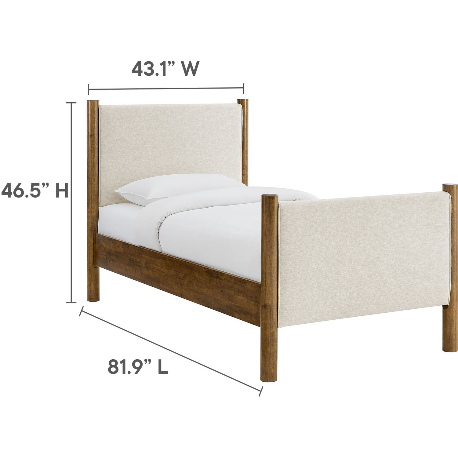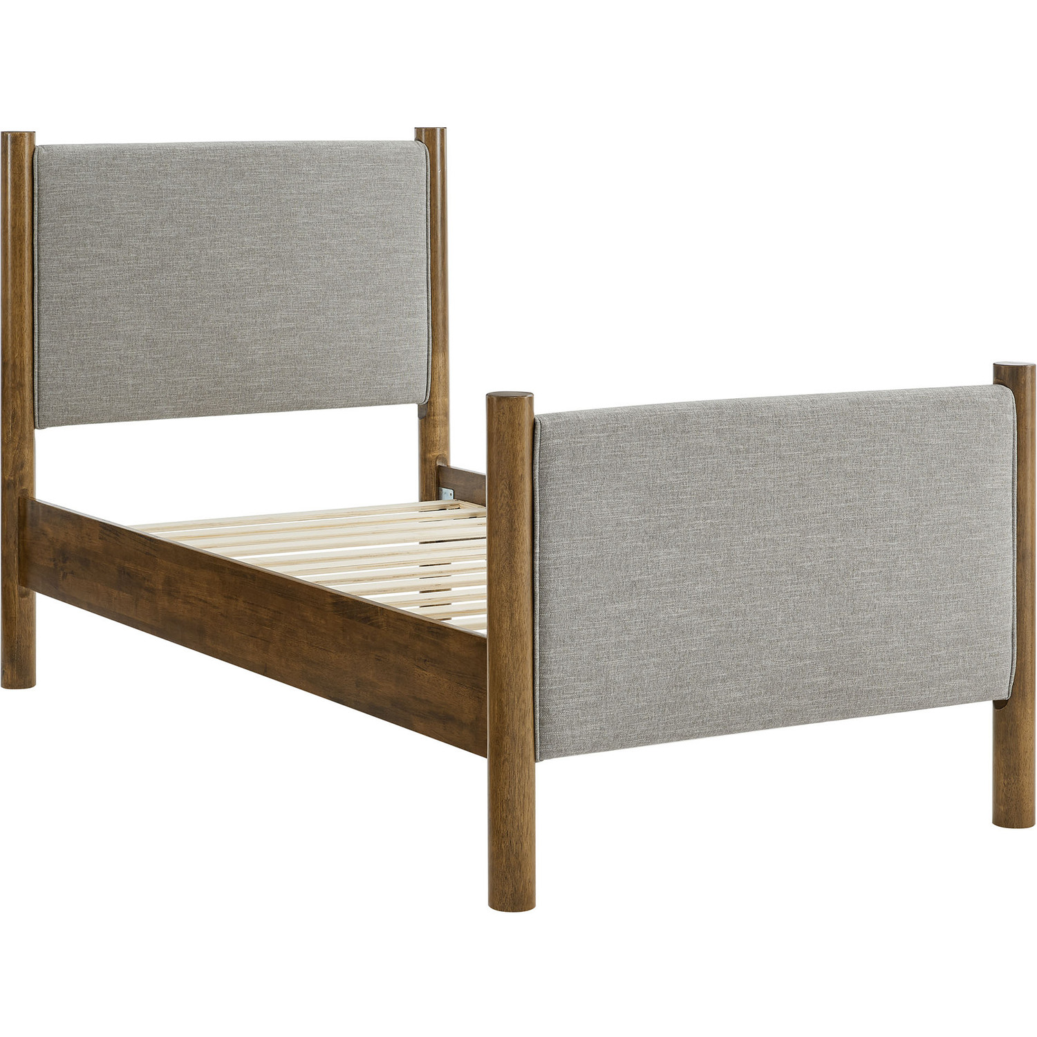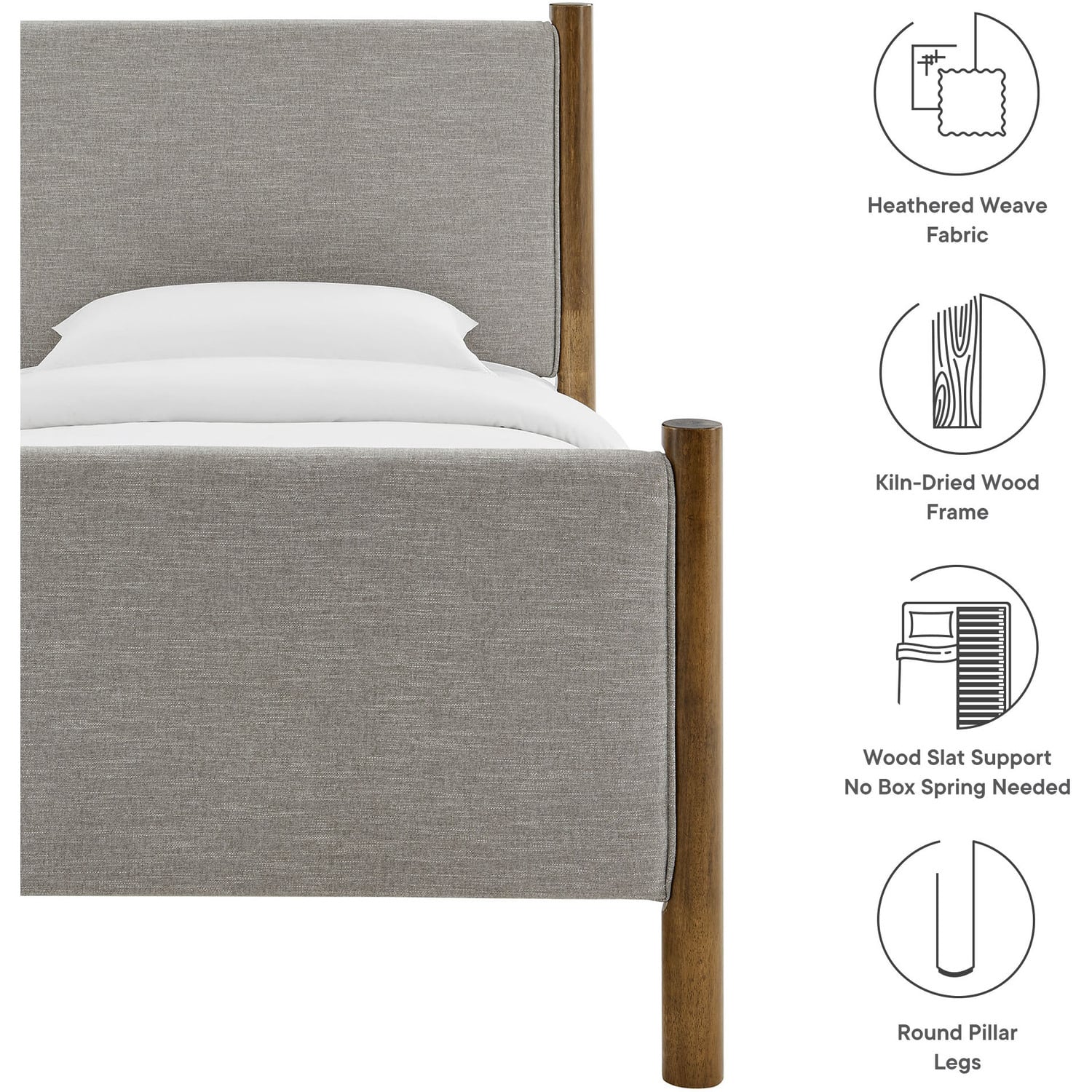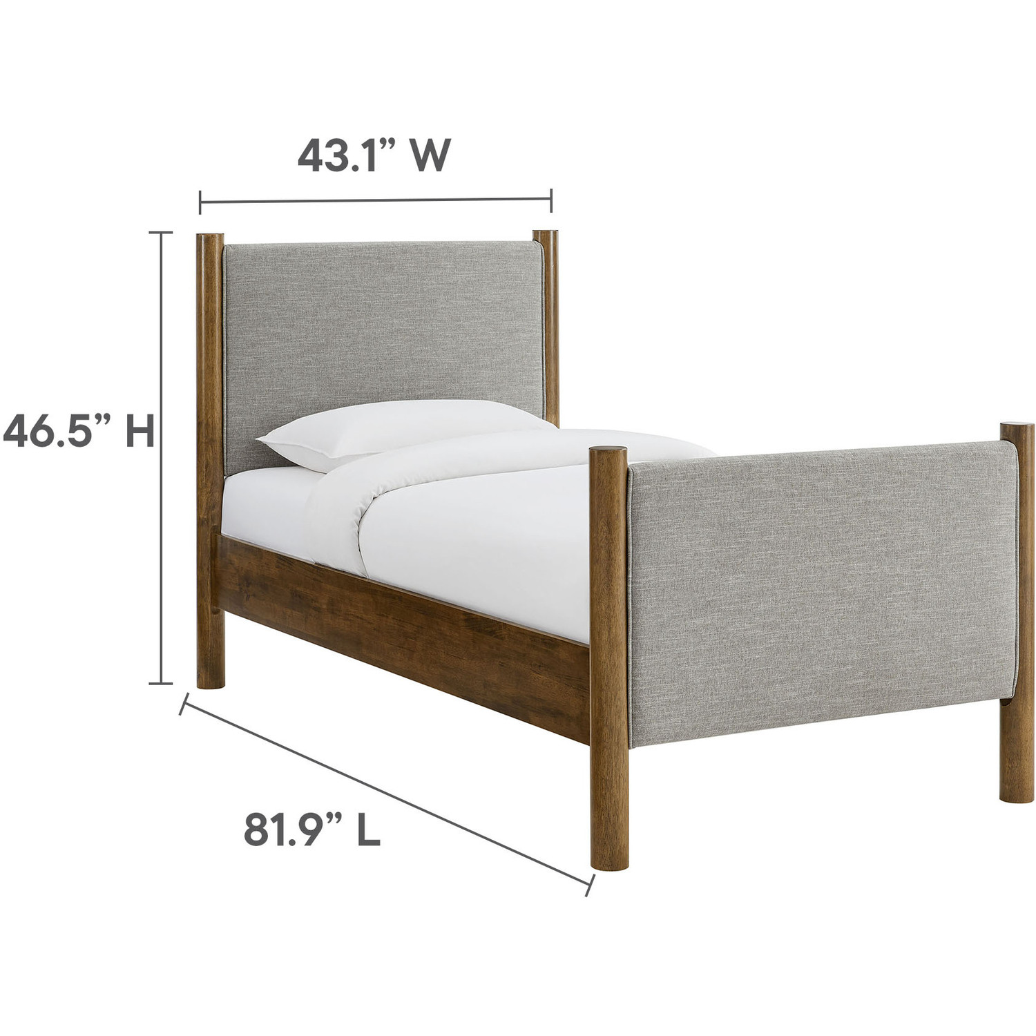 A perfect blend of comfort and craftsmanship, the Maven Twin Size Platform Bed brings a stylish focal point to any bedroom. The upholstered headboard and footboard, padded and covered in a heathered weave fabric, provide a cozy, inviting backdrop framed by robust solid wood posts for a touch of timeless elegance. Designed with wooden slats that support your mattress while promoting airflow, this platform bed eliminates the need for a box spring. Ideal for compact spaces, kids' rooms, or guest accommodations, the Maven Twin Bed combines a modern look with practical functionality, making it an excellent choice for those seeking both comfort and durability. Weight Capacity: 794 lbs.Wooden Bed Frame