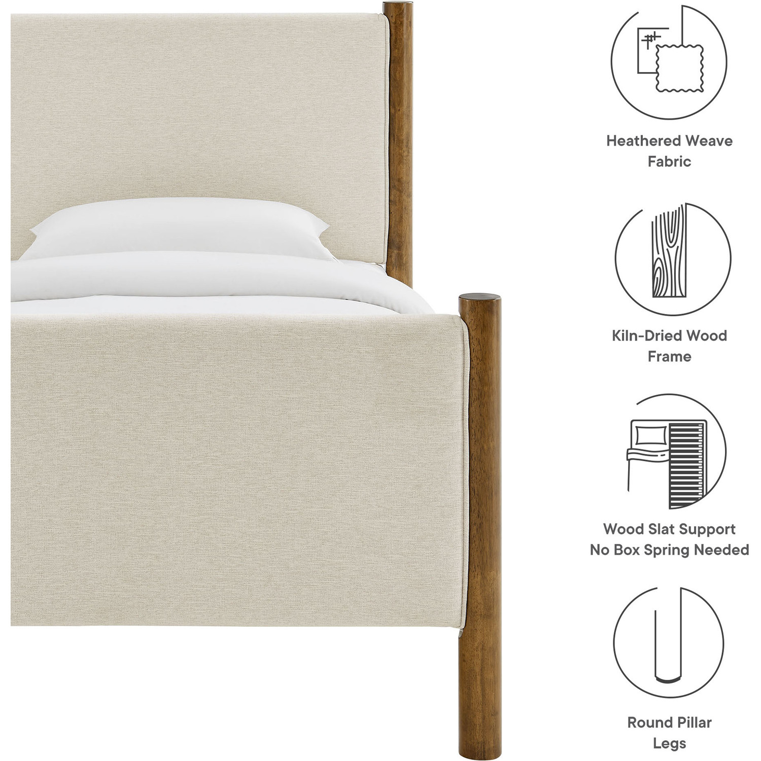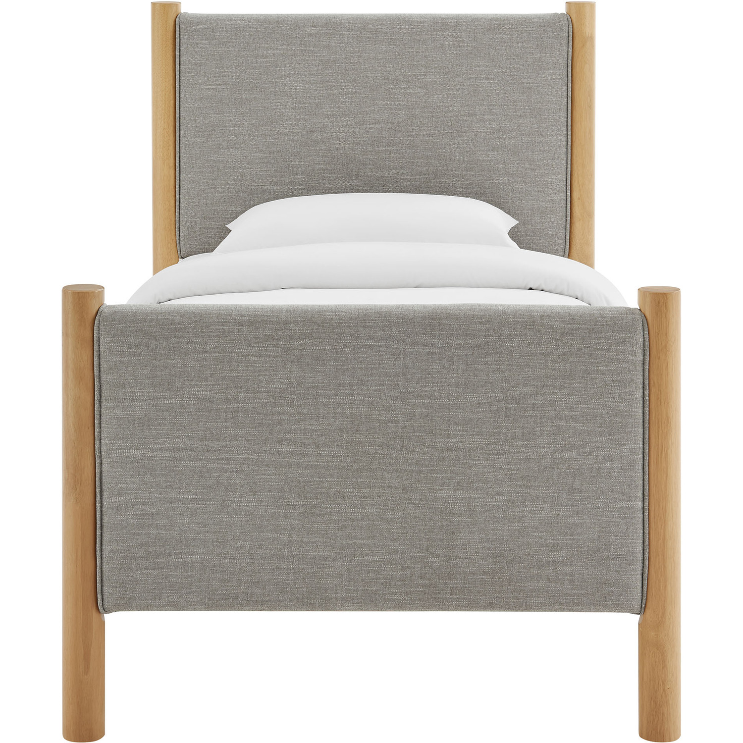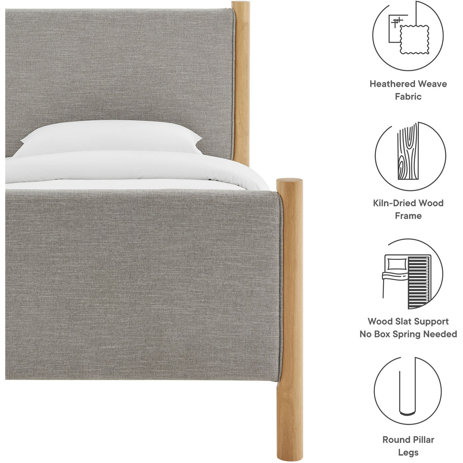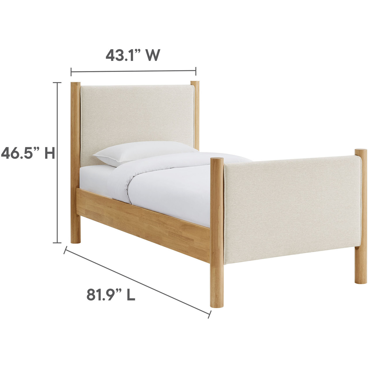 A perfect blend of comfort and craftsmanship, the Maven Twin Size Platform Bed brings a stylish focal point to any bedroom. The upholstered headboard and footboard, padded and covered in a heathered weave fabric, provide a cozy, inviting backdrop framed by robust solid wood posts for a touch of timeless elegance. Designed with wooden slats that support your mattress while promoting airflow, this platform bed eliminates the need for a box spring. Ideal for compact spaces, kids' rooms, or guest accommodations, the Maven Twin Bed combines a modern look with practical functionality, making it an excellent choice for those seeking both comfort and durability. Weight Capacity: 794 lbs.Wooden Bed Frame