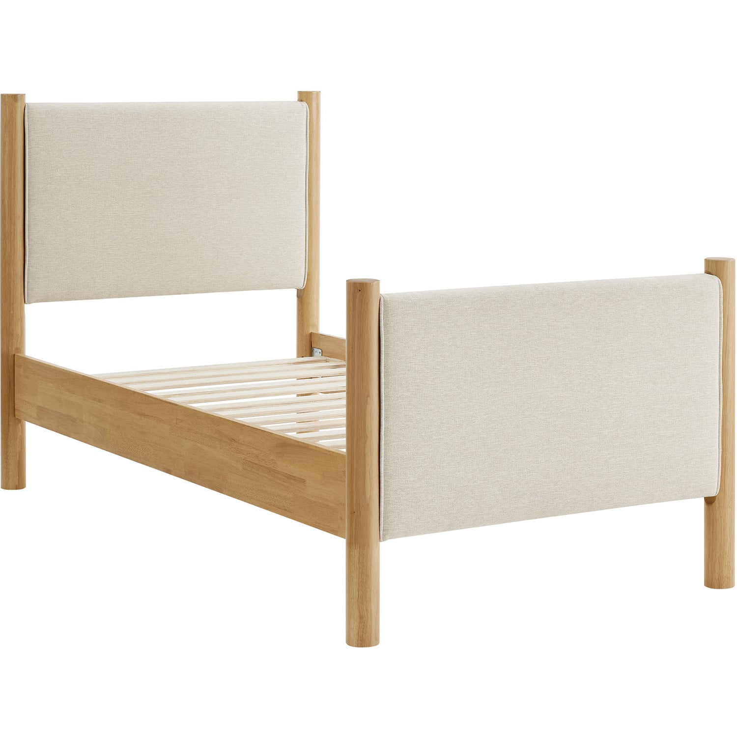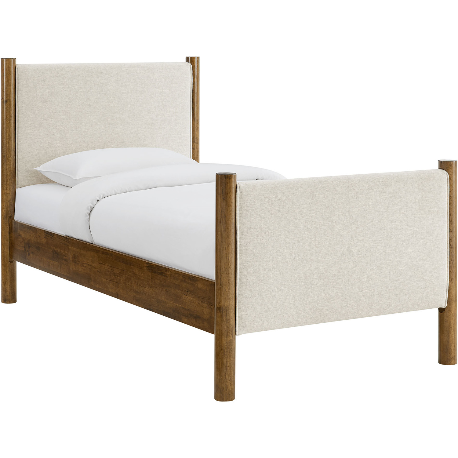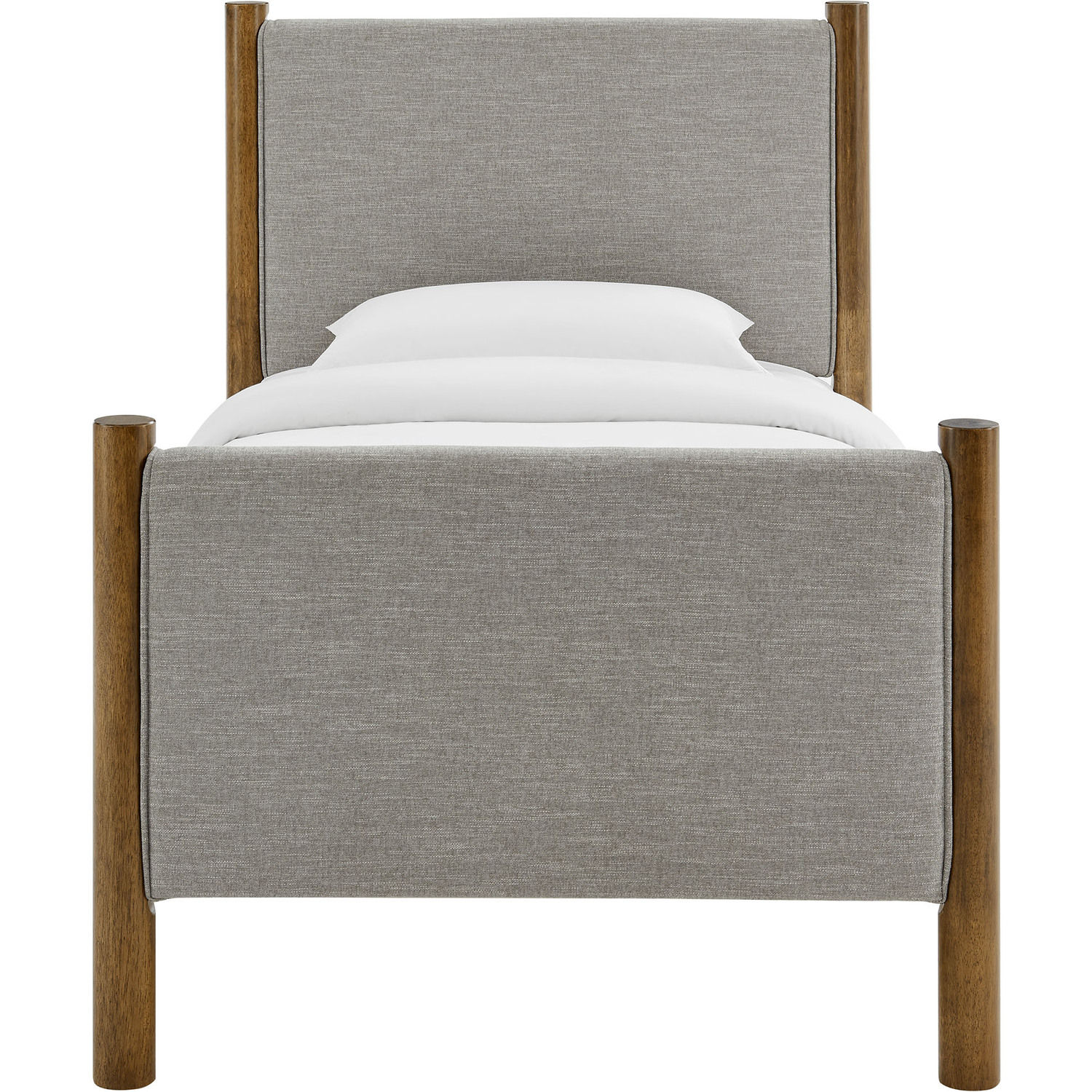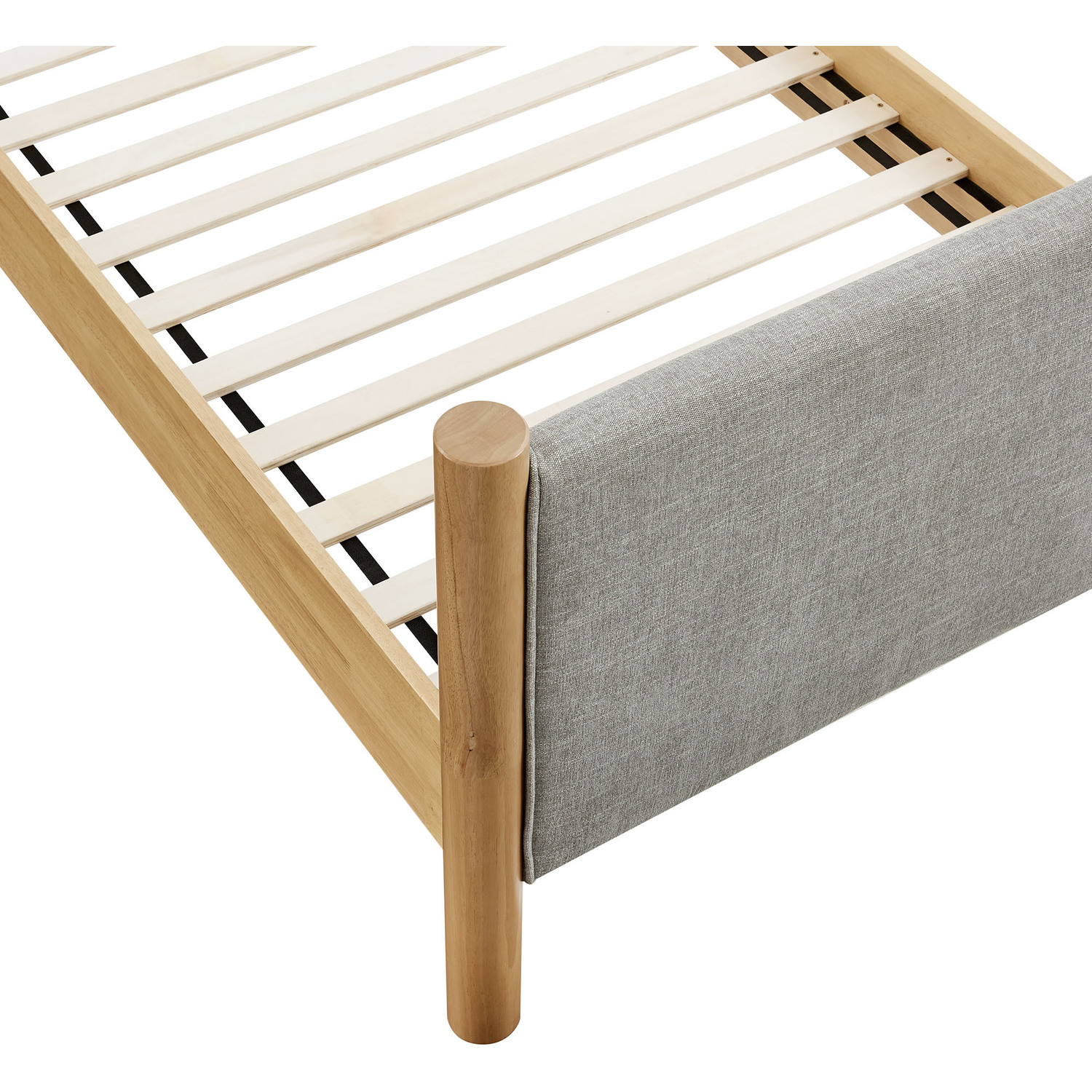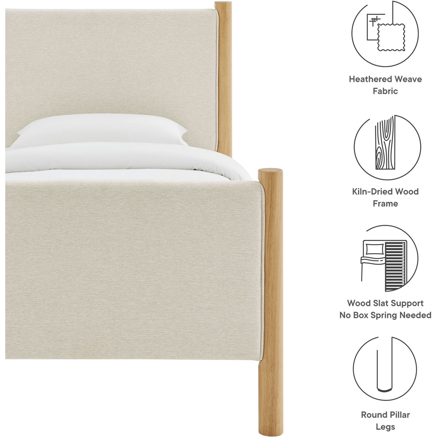 A perfect blend of comfort and craftsmanship, the Maven Twin Size Platform Bed brings a stylish focal point to any bedroom. The upholstered headboard and footboard, padded and covered in a heathered weave fabric, provide a cozy, inviting backdrop framed by robust solid wood posts for a touch of timeless elegance. Designed with wooden slats that support your mattress while promoting airflow, this platform bed eliminates the need for a box spring. Ideal for compact spaces, kids' rooms, or guest accommodations, the Maven Twin Bed combines a modern look with practical functionality, making it an excellent choice for those seeking both comfort and durability. Weight Capacity: 794 lbs.Wooden Bed Frame