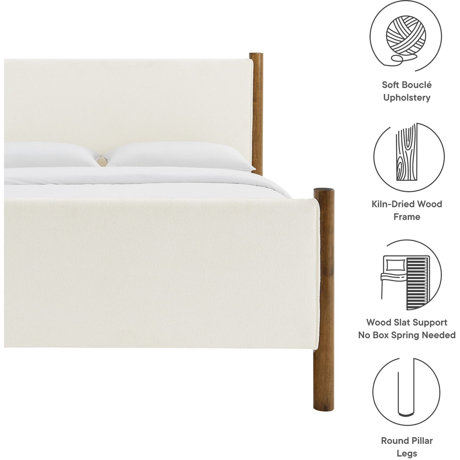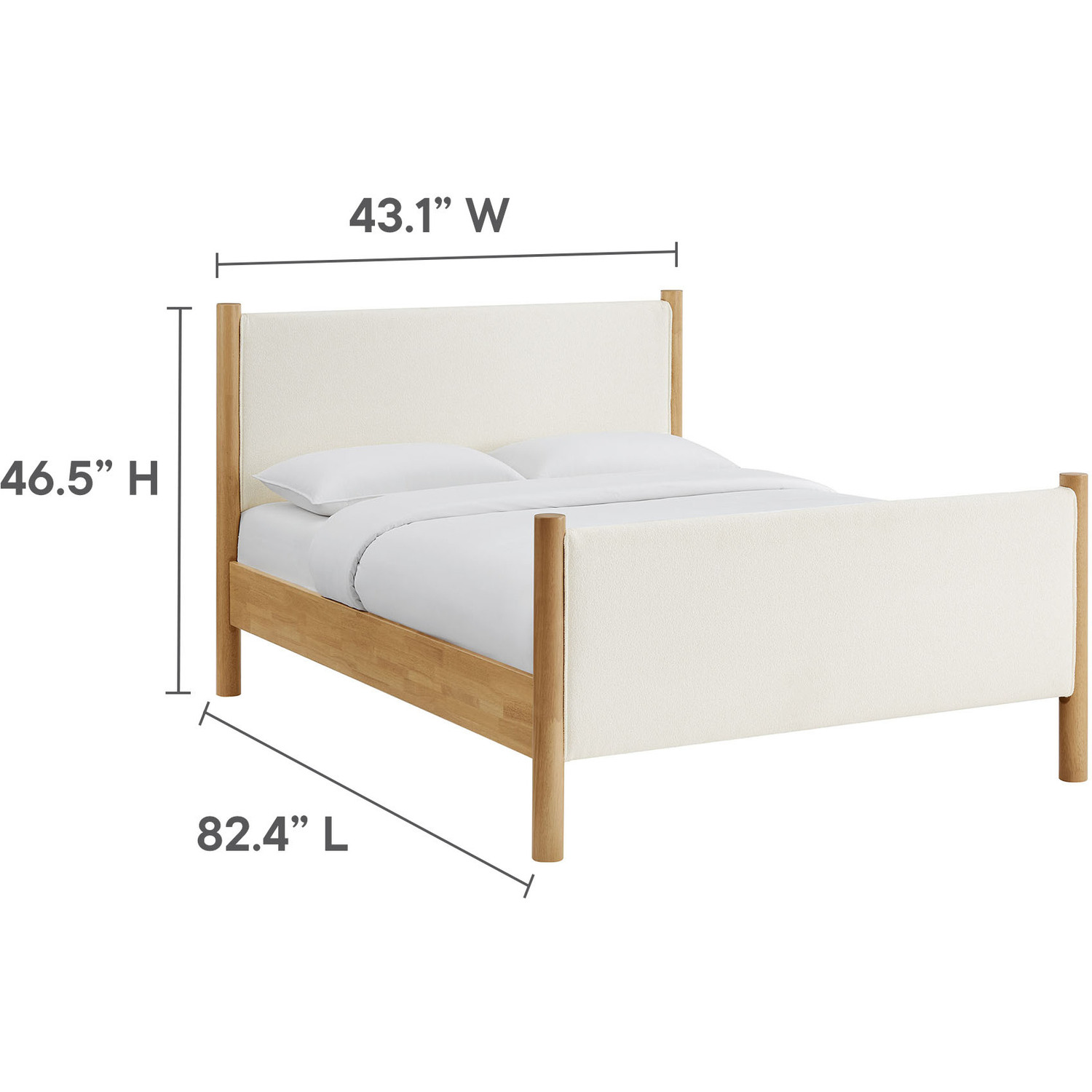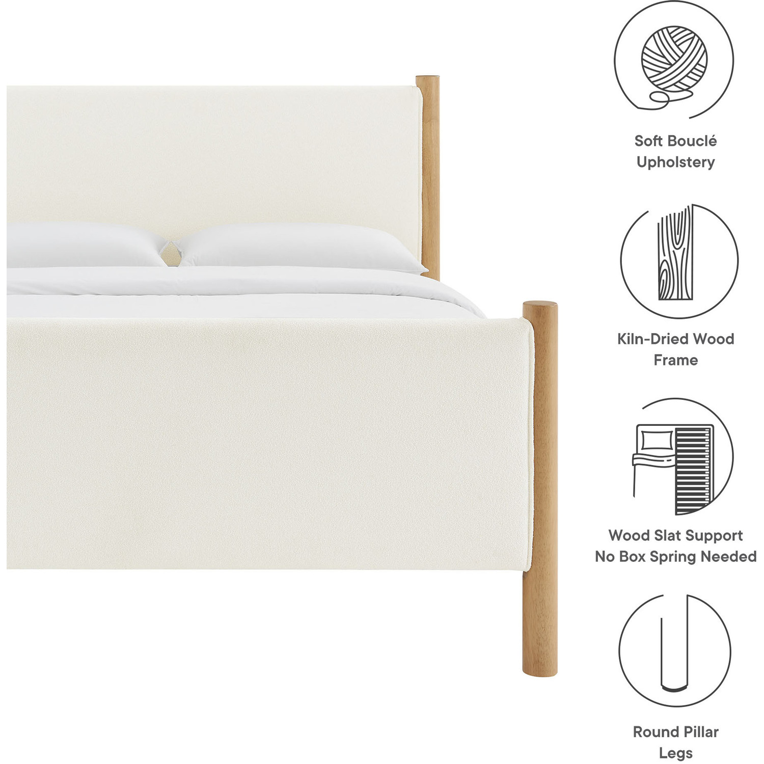 A perfect blend of cozy texture and craftsmanship, the Maven Full Size Platform Bed serves as a stylish focal point in any bedroom. The upholstered headboard and footboard, padded and covered in soft boucle fabric, create a warm and inviting atmosphere, framed by solid wood posts for a touch of timeless elegance. Designed with wooden slats that support your mattress while promoting airflow, this platform bed eliminates the need for a box spring. Ideal for guest rooms, compact spaces, or as a chic centerpiece in a teenager’s bedroom, the Maven Boucle Full Bed combines modern aesthetics with practical functionality for those seeking both comfort and durability. Weight Capacity: 794 lbs.Wooden Bed Frame