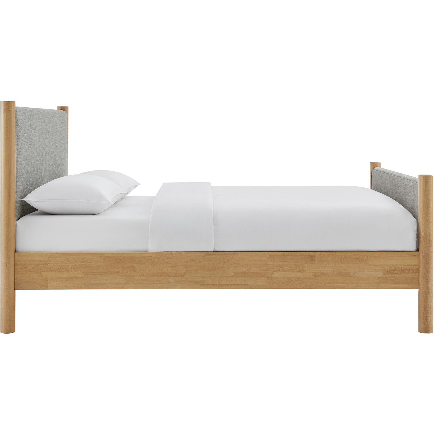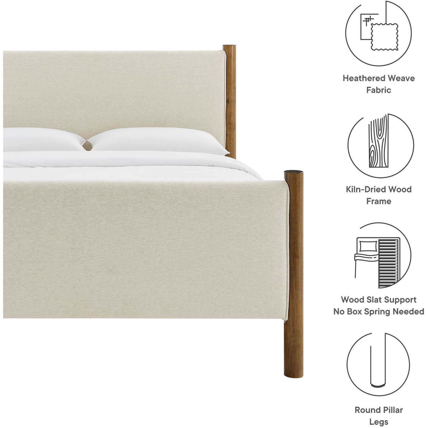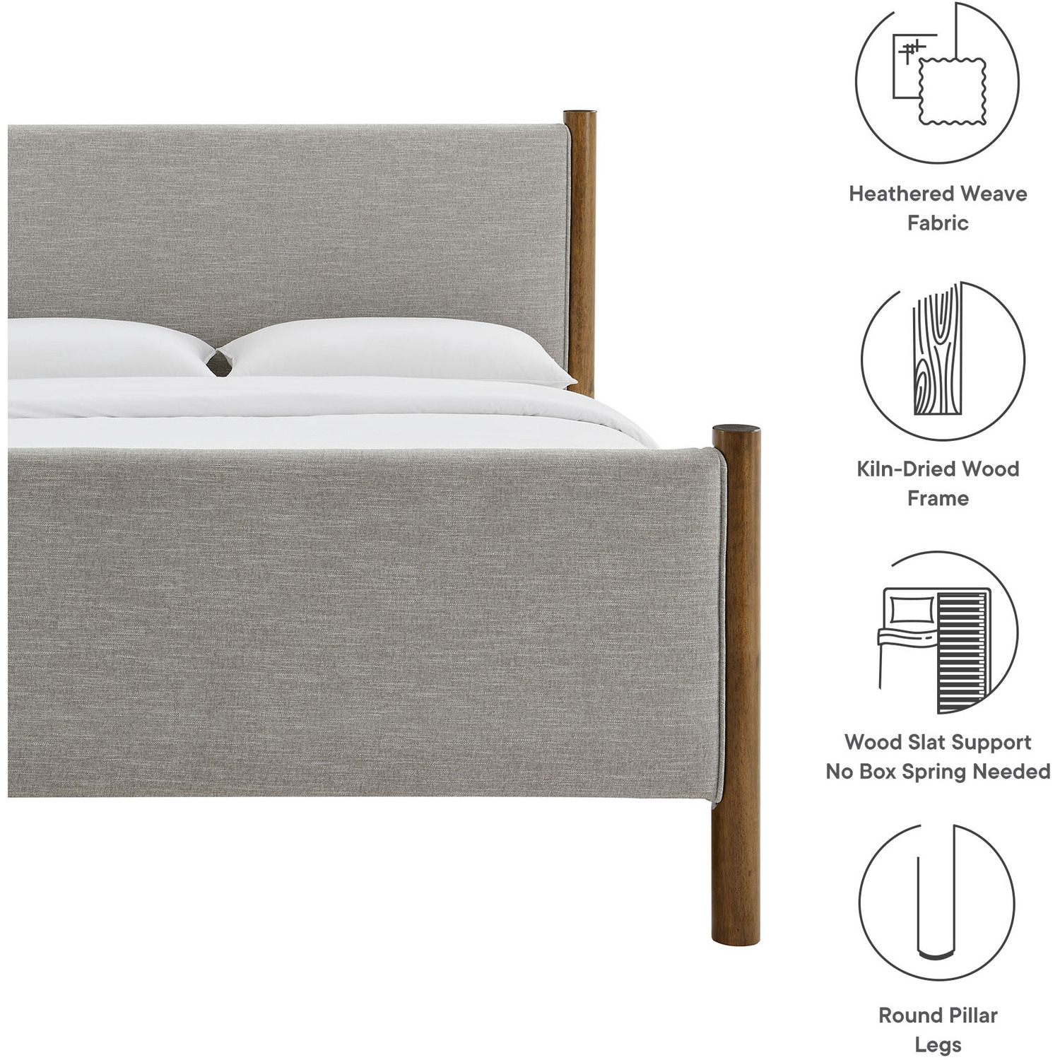 A perfect blend of comfort and craftsmanship, the Maven King Size Platform Bed brings a stylish focal point to any spacious bedroom. The upholstered headboard and footboard, padded and covered in a heathered weave fabric, provide a cozy, inviting backdrop framed by robust solid wood posts for a touch of timeless elegance. Designed with wooden slats that support your mattress while promoting airflow, this platform bed eliminates the need for a box spring. Ideal for primary bedrooms or large guest rooms, the Maven King Bed combines a modern look with practical functionality, making it an excellent choice for those seeking both comfort and durability. Weight Capacity: 794 lbs.Wooden Bed Frame