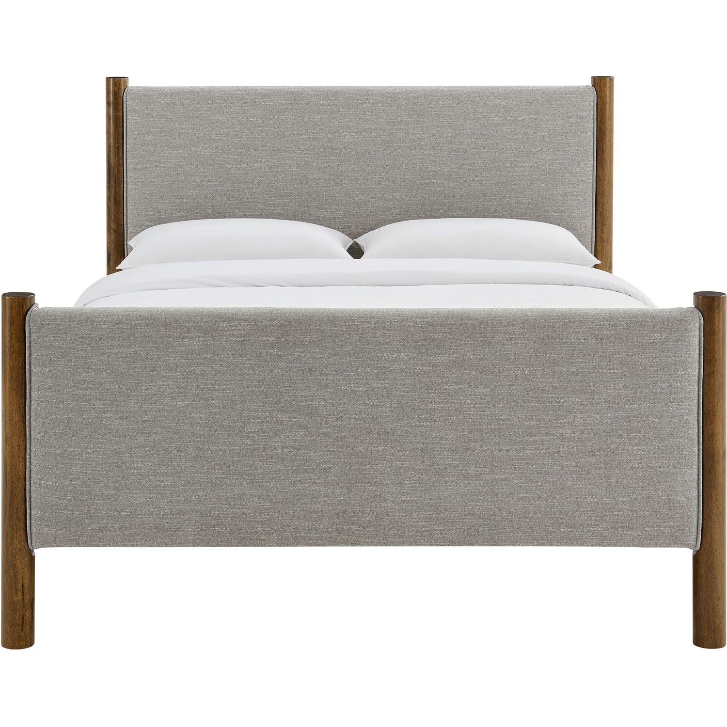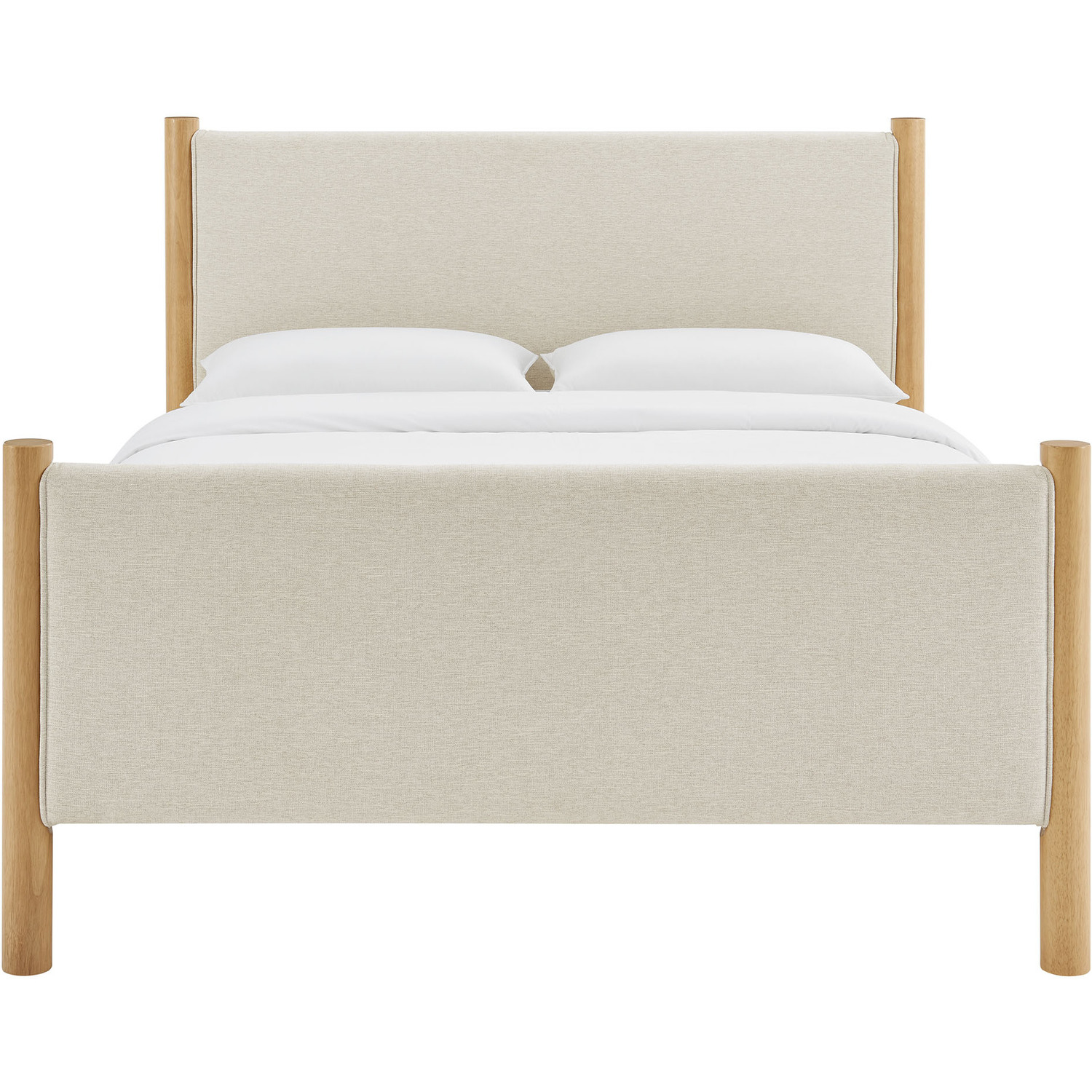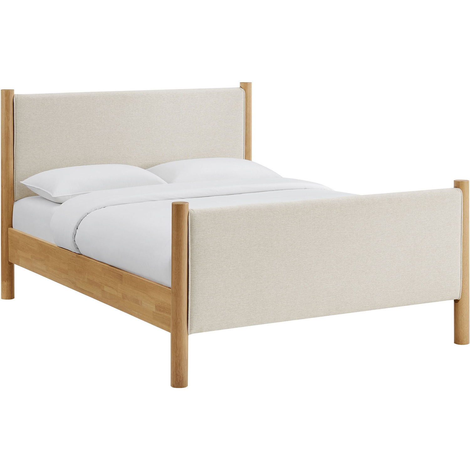 A perfect blend of comfort and craftsmanship, the Maven King Size Platform Bed brings a stylish focal point to any spacious bedroom. The upholstered headboard and footboard, padded and covered in a heathered weave fabric, provide a cozy, inviting backdrop framed by robust solid wood posts for a touch of timeless elegance. Designed with wooden slats that support your mattress while promoting airflow, this platform bed eliminates the need for a box spring. Ideal for primary bedrooms or large guest rooms, the Maven King Bed combines a modern look with practical functionality, making it an excellent choice for those seeking both comfort and durability. Weight Capacity: 794 lbs.Wooden Bed Frame