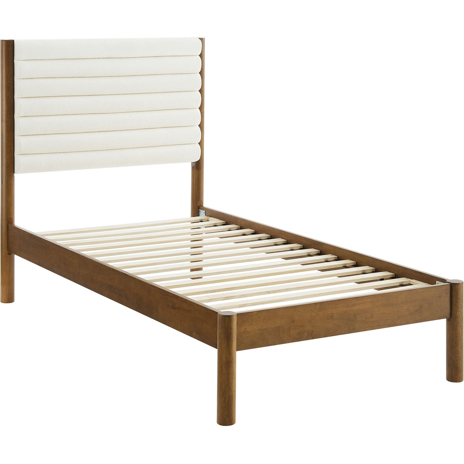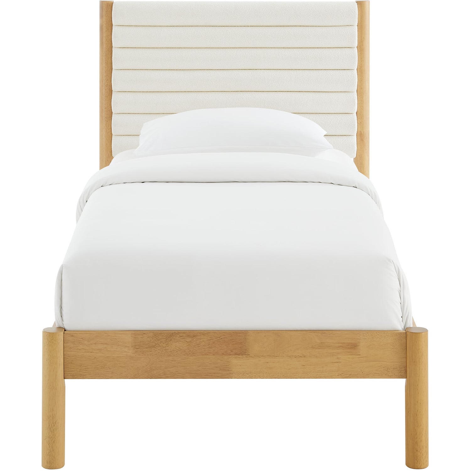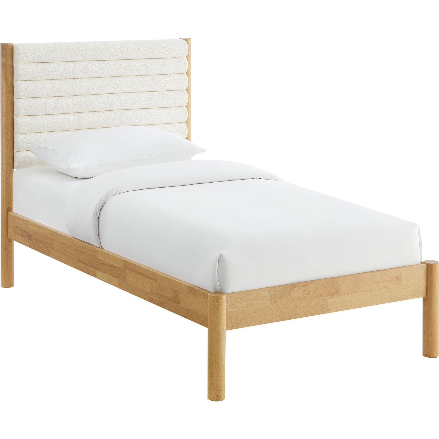 Turn your bedroom into a serene escape or design a cozy guest room with the Olea Boucle Platform Bed. Built with clean, contemporary lines, this twin size bed frame features a beautifully padded headboard wrapped in luxurious boucle upholstery, complete with elegant channel tufting that adds depth and texture to your space. The solid rubberwood frame, complemented by smooth, rounded pillar-style legs, offers a strong foundation while enhancing the bed frame and headboard with its minimalist curved design. The sturdy wood slat support system provides stability and supports memory foam, spring, latex, or hybrid mattresses up to 10"es thick, with no need for a box spring. Featuring a simple yet warm look, the Olea Twin Bed with Headboard brings a natural warmth to any bedroom, making it an ideal centerpiece for mid-century, modern, or contemporary interiors. Whether you're refreshing a small bedroom or college dorm or designing a comfortable kids' room, this wood bed frame with its upholstered headboard provides both comfort and style. Weight Capacity: 500 lbsChannel Tufted Boucle Upholstered Headboard