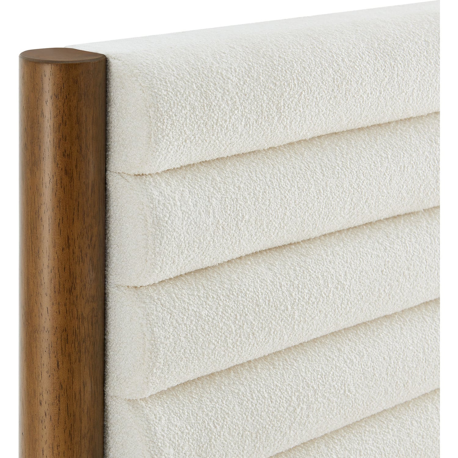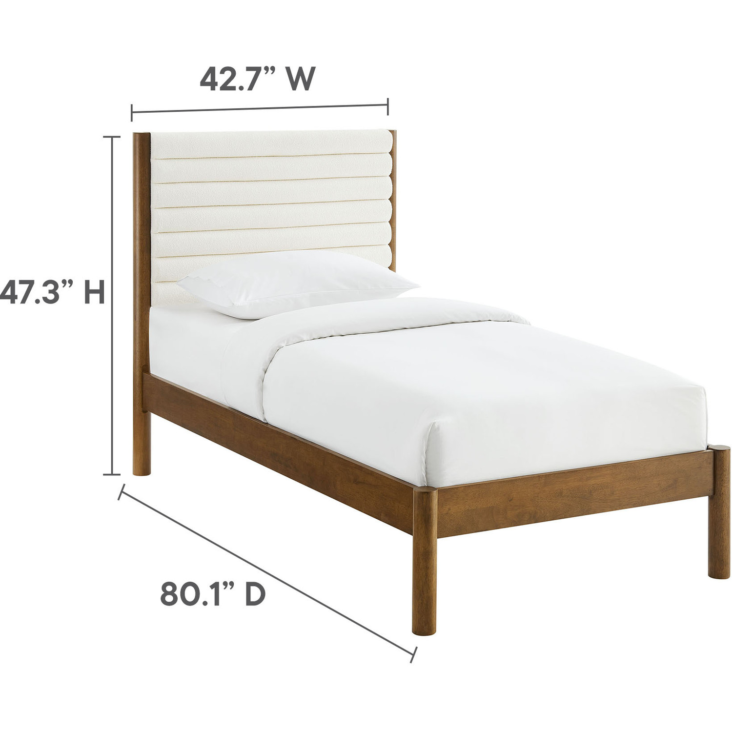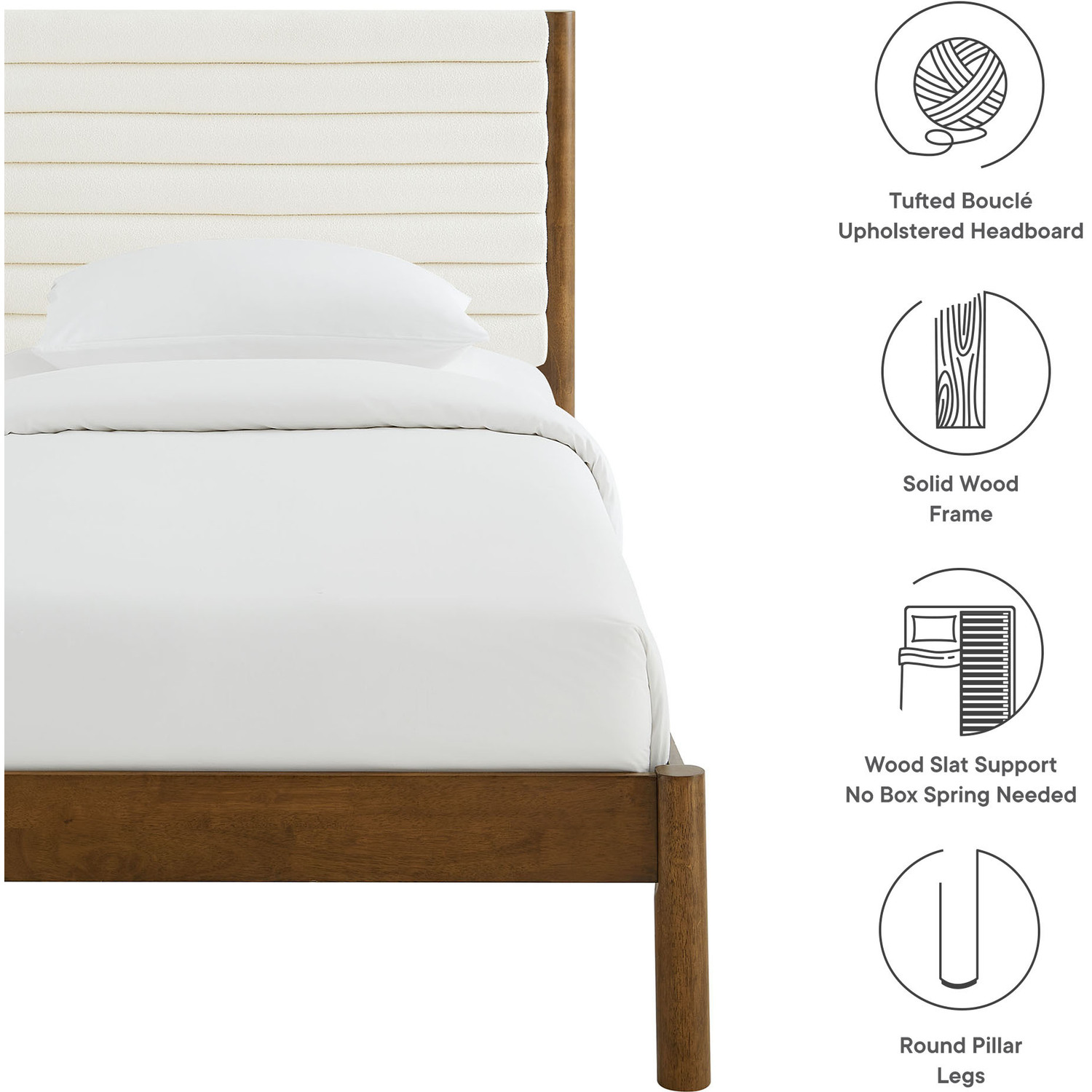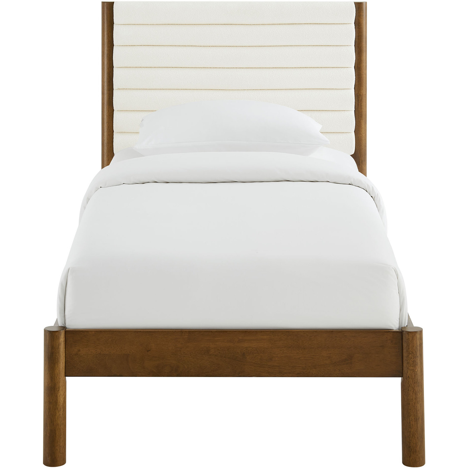 Turn your bedroom into a serene escape or design a cozy guest room with the Olea Boucle Platform Bed. Built with clean, contemporary lines, this twin size bed frame features a beautifully padded headboard wrapped in luxurious boucle upholstery, complete with elegant channel tufting that adds depth and texture to your space. The solid rubberwood frame, complemented by smooth, rounded pillar-style legs, offers a strong foundation while enhancing the bed frame and headboard with its minimalist curved design. The sturdy wood slat support system provides stability and supports memory foam, spring, latex, or hybrid mattresses up to 10"es thick, with no need for a box spring. Featuring a simple yet warm look, the Olea Twin Bed with Headboard brings a natural warmth to any bedroom, making it an ideal centerpiece for mid-century, modern, or contemporary interiors. Whether you're refreshing a small bedroom or college dorm or designing a comfortable kids' room, this wood bed frame with its upholstered headboard provides both comfort and style. Weight Capacity: 500 lbsChannel Tufted Boucle Upholstered Headboard