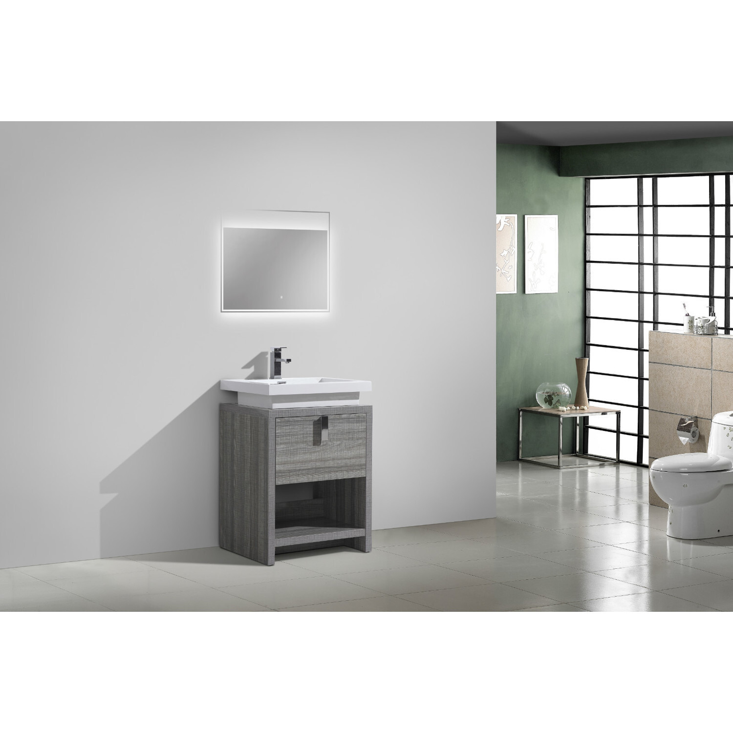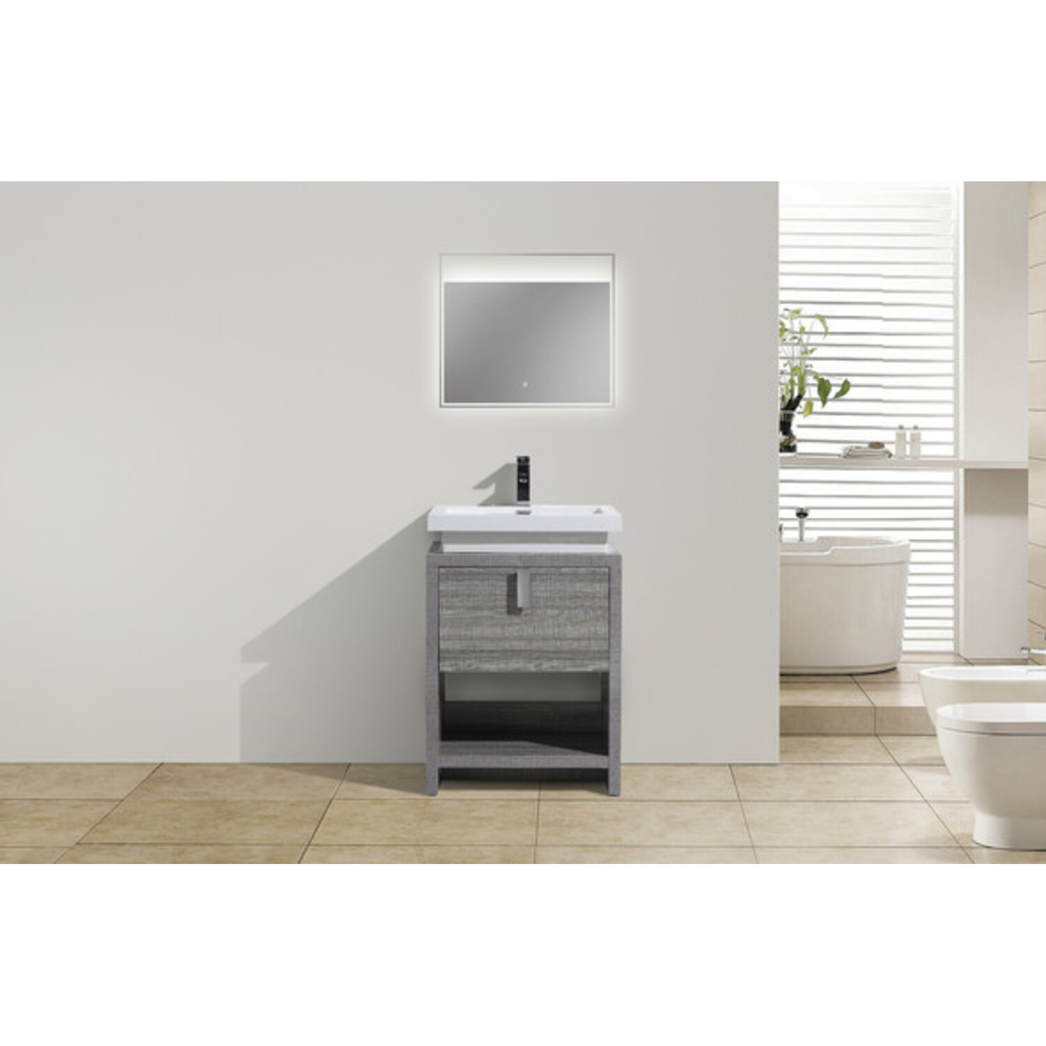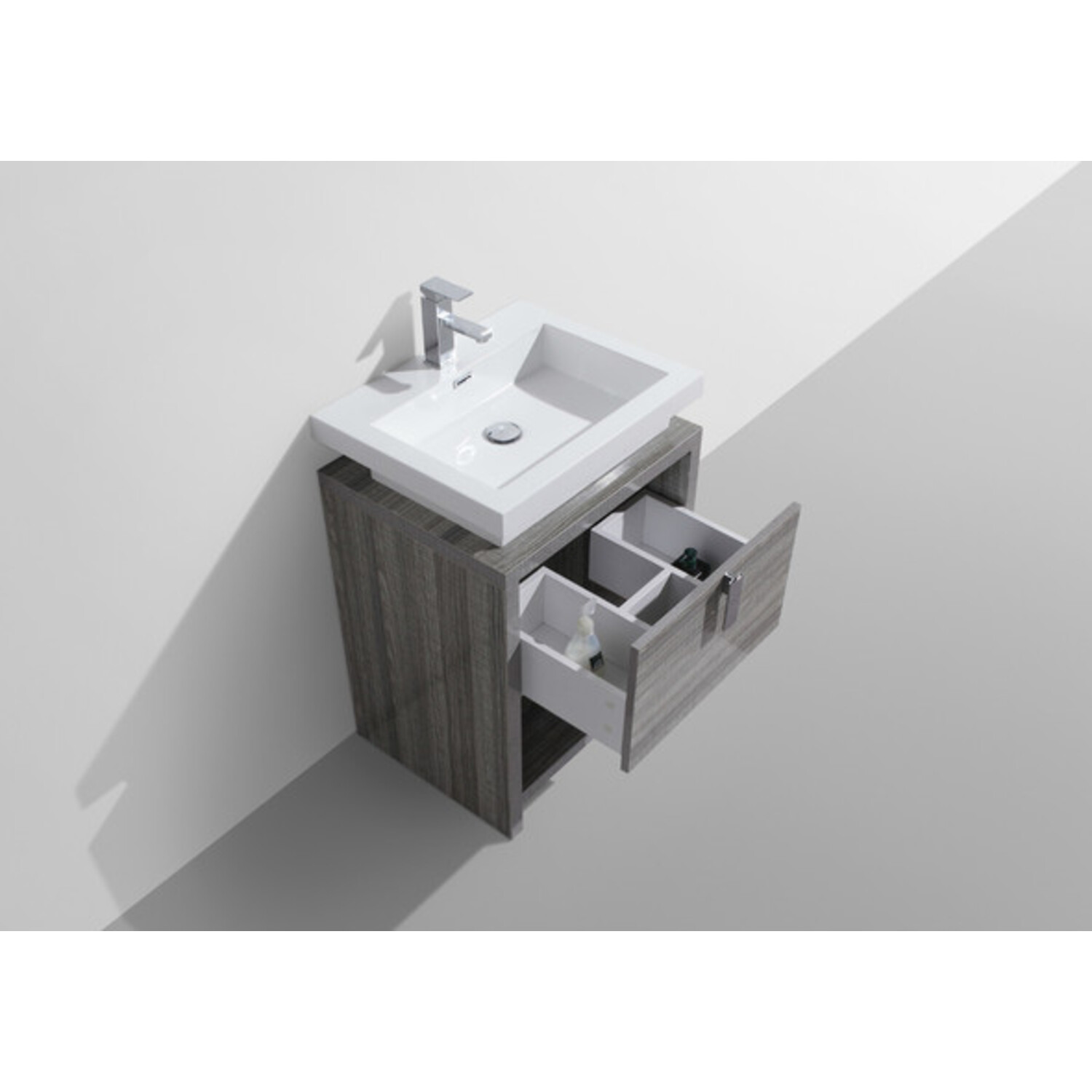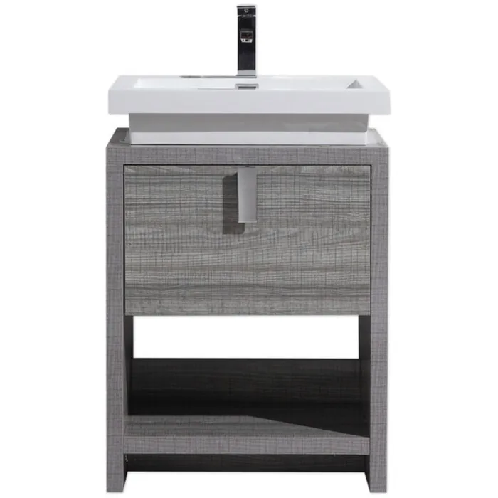 This free standing bathroom vanity features one drawer for storing bathroom essentials. The clean, contemporary lines are enhanced by a crisp white integrated sink and a high gloss ash grey durable finish.