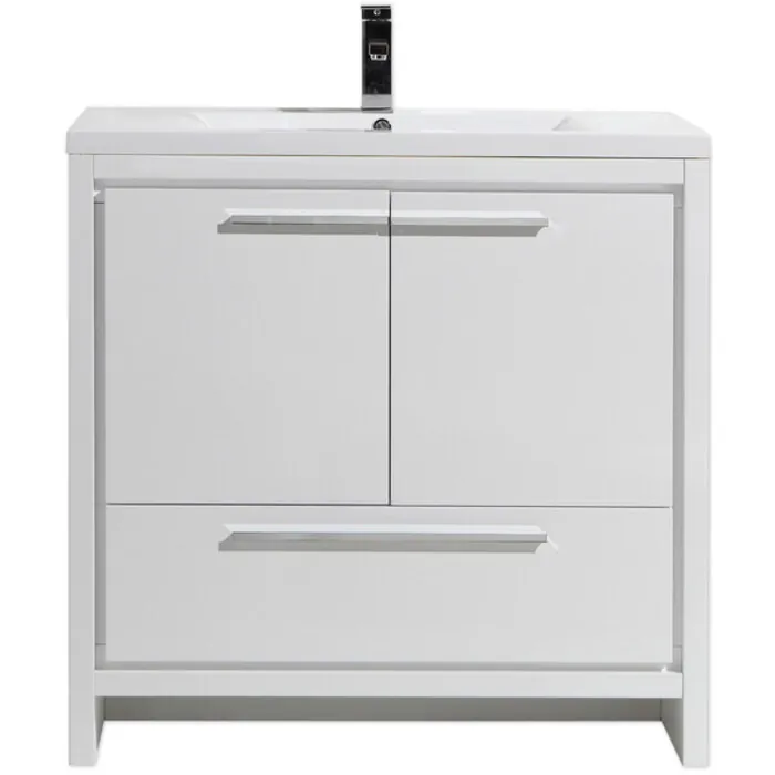The Dolce Vanity is one of the most elegant modern Bathroom Vanities around.  This 36" model comes with a durable pure white Acrylic Countertop and features two Doors and one Drawer with high quality European Hardware, that provides smooth soft-closing operation.