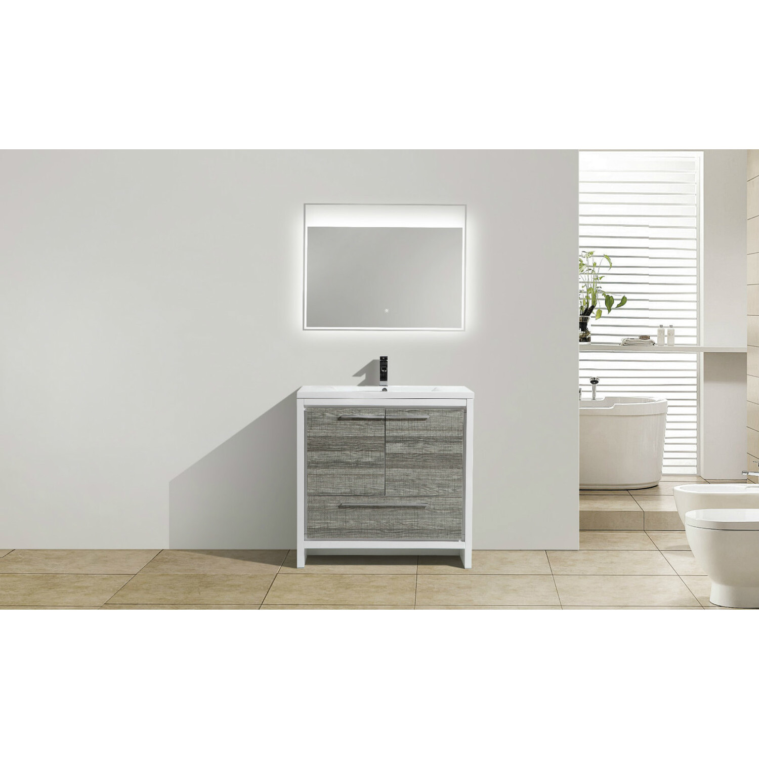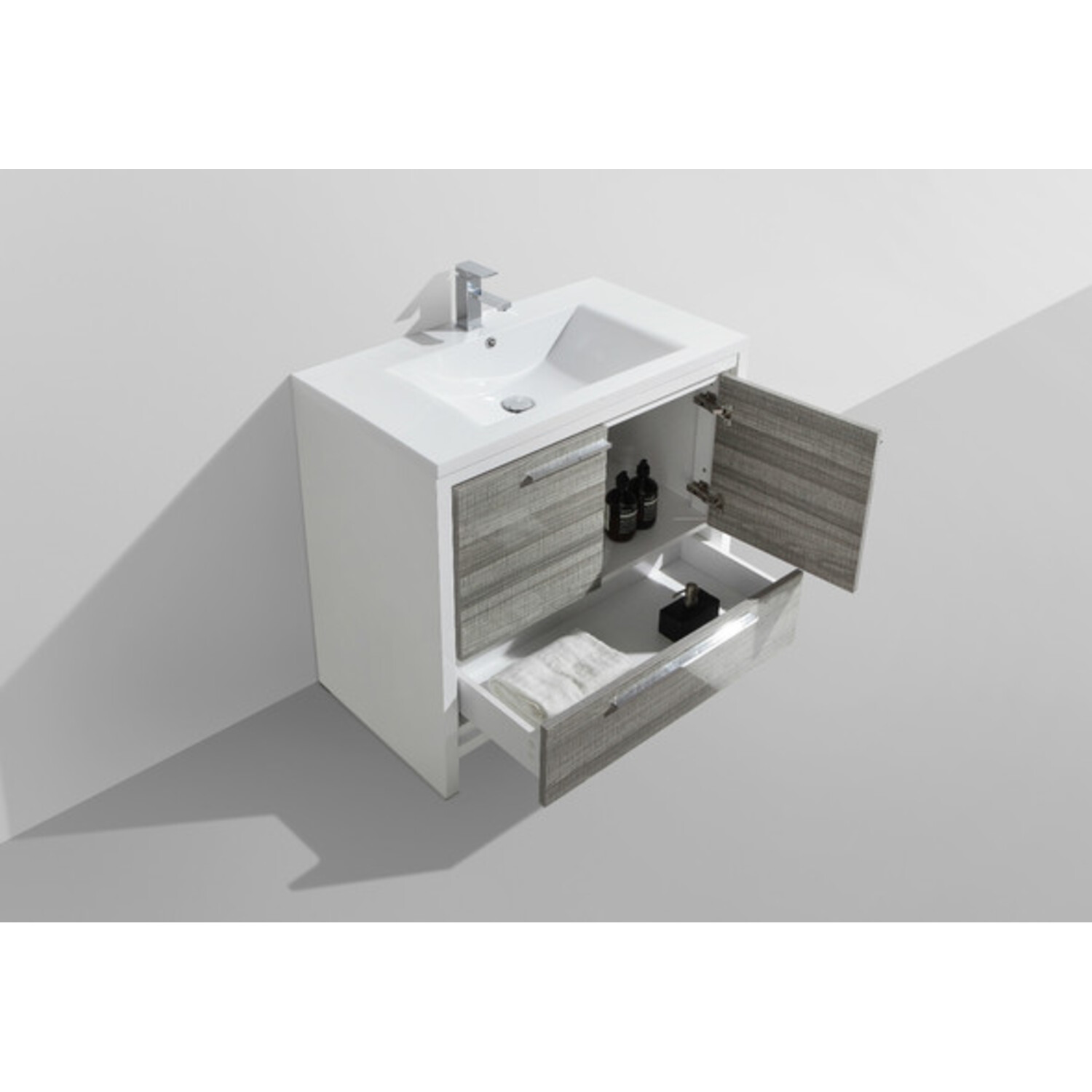 The Dolce Vanity one of the most elegant modern Bathroom Vanities around. This 48" single Sink model comes with a durable pure white Acrylic Countertop and features two Doors and three Drawers with high quality European Hardware, that provides smooth soft-closing operation. Top Drawer features push-open operation.