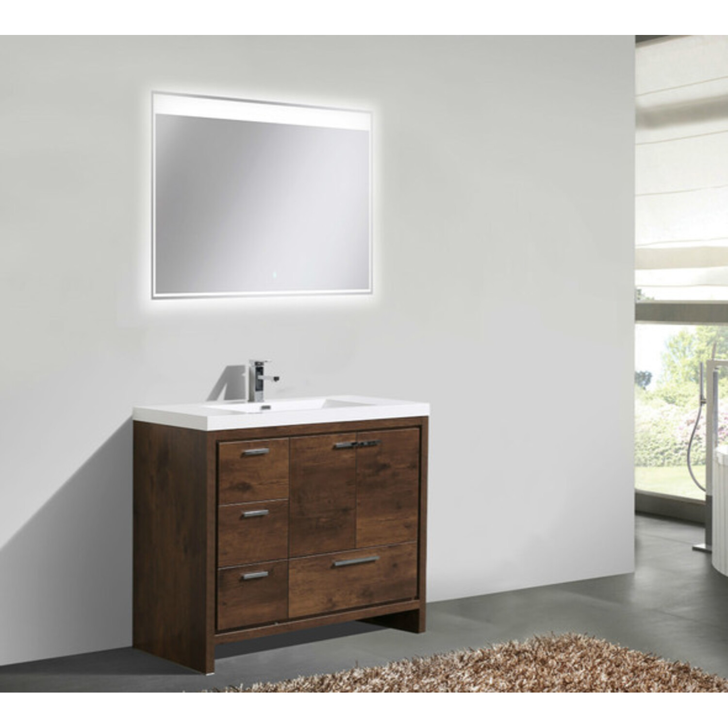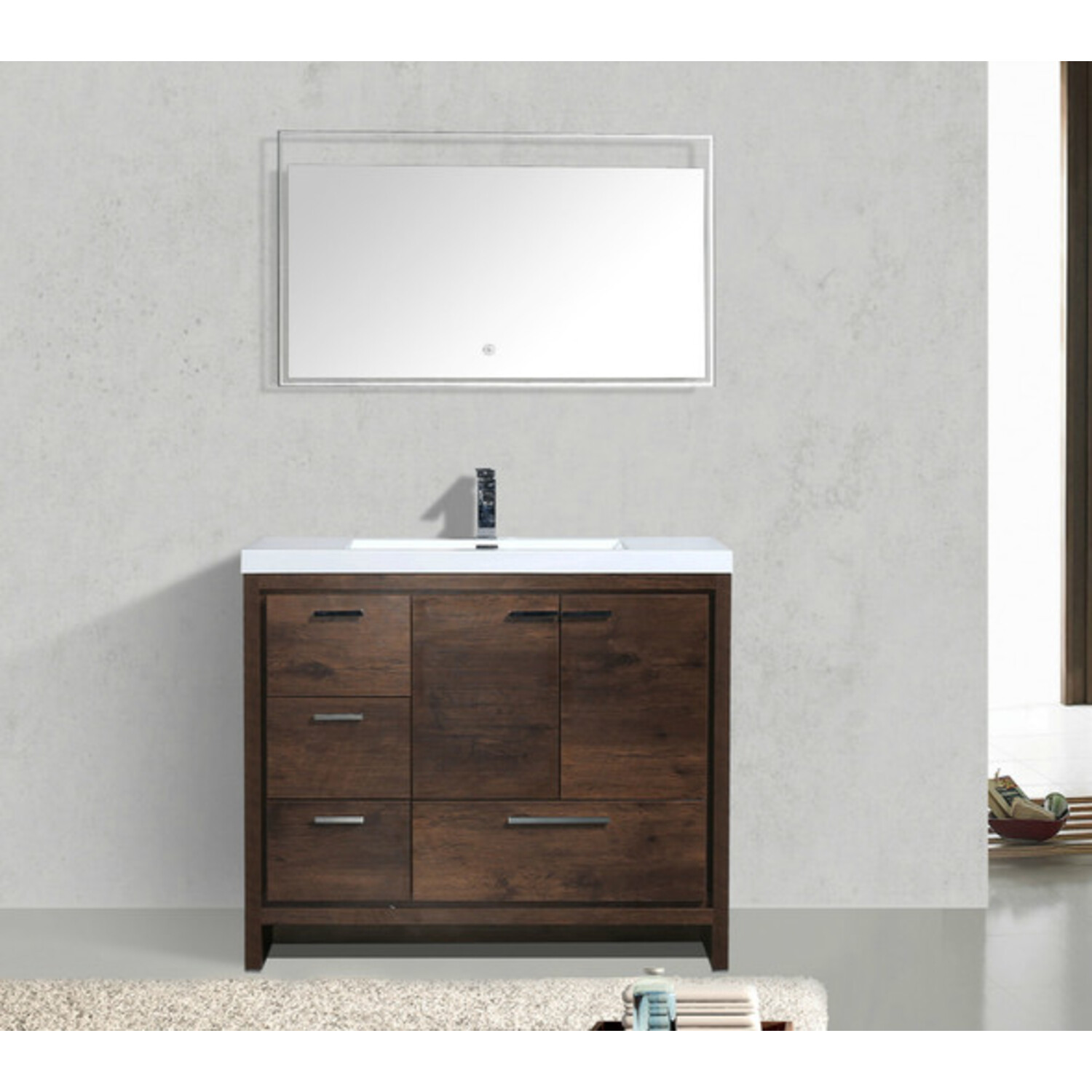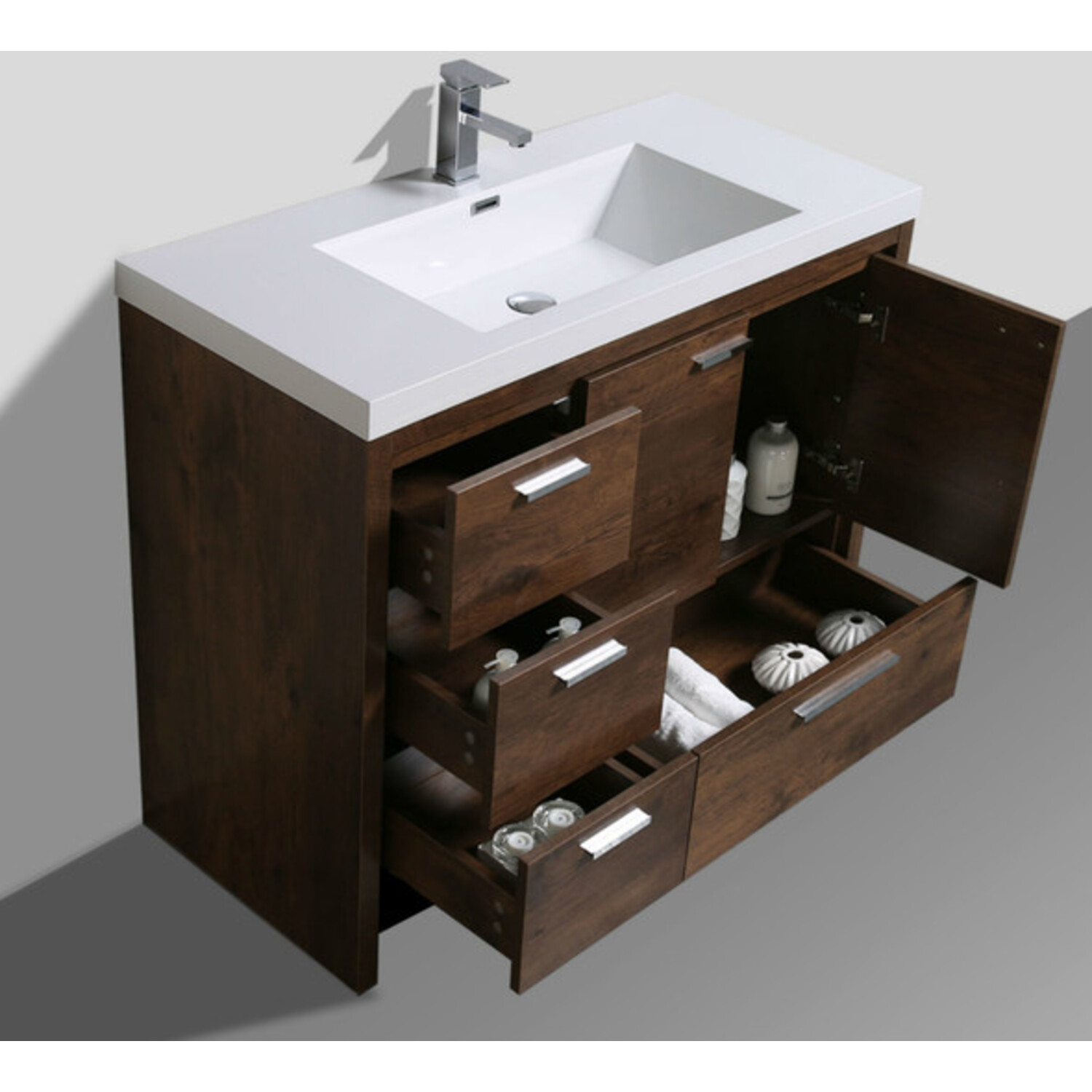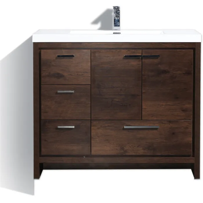 The Dolce Vanity is one of the most elegant modern Bathroom Vanities around. This 60" Single Sink model comes with a durable pure white Acrylic Countertop and features two Doors and three Drawers with high quality European Hardware, that provides smooth soft-closing operation. Top Drawer features push-open operation.