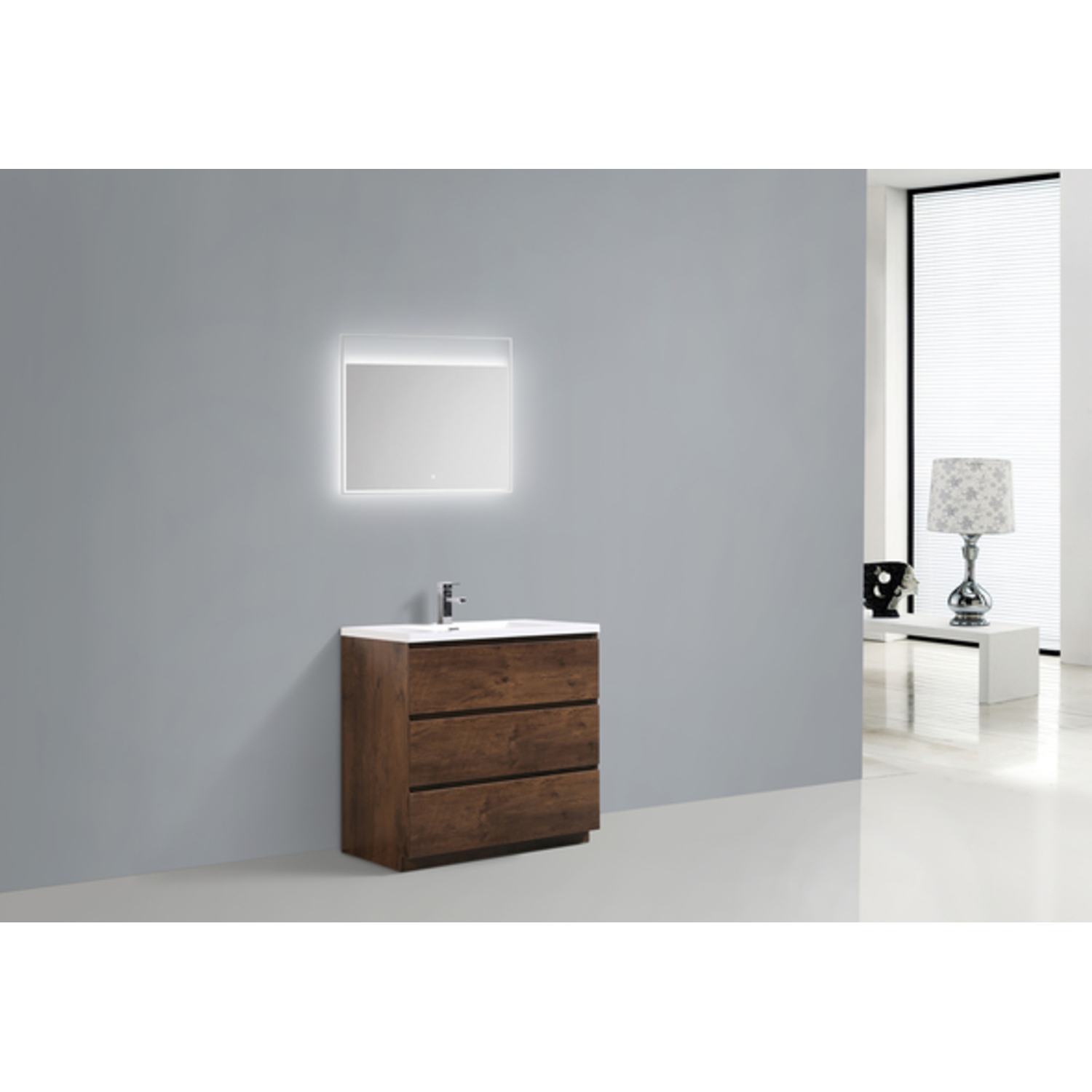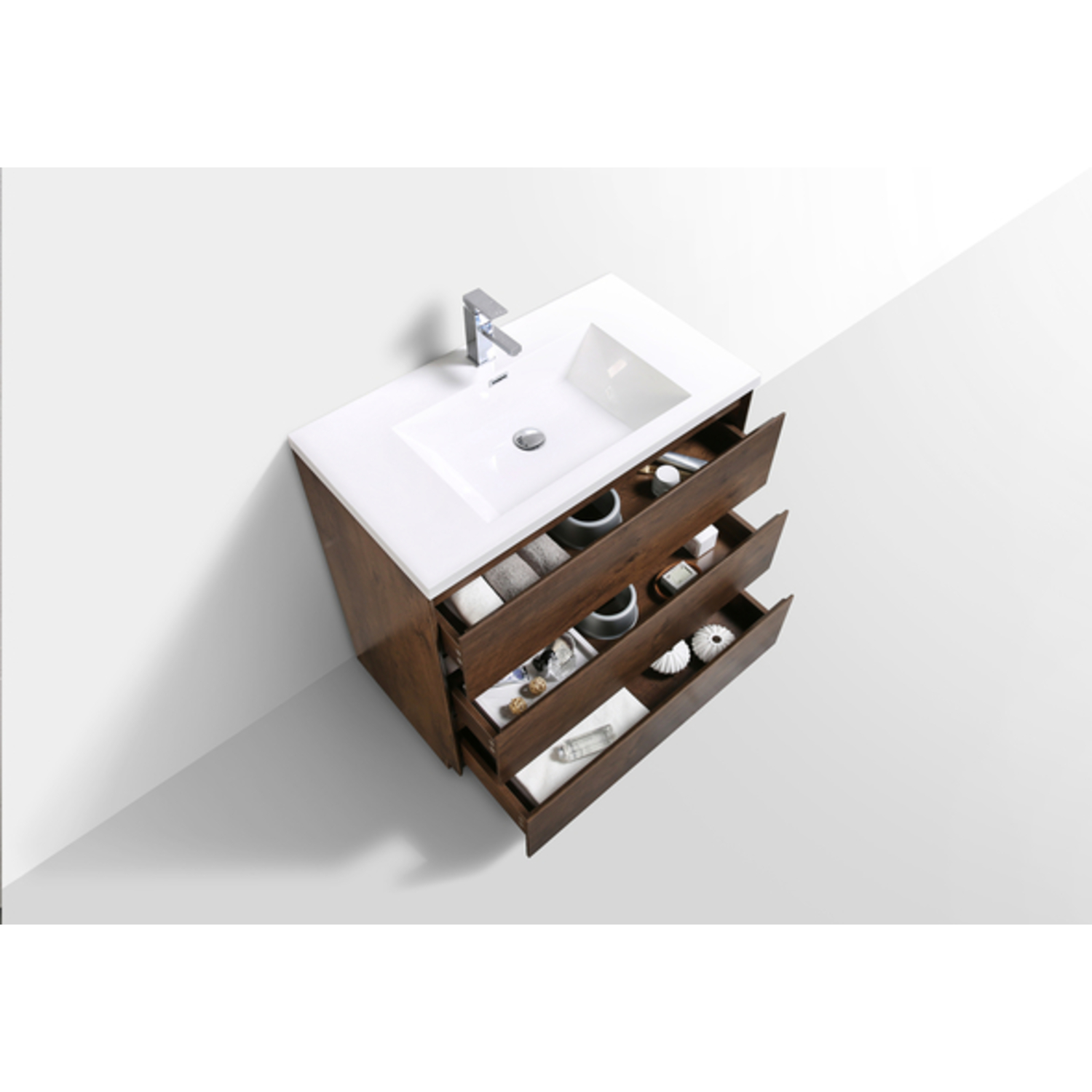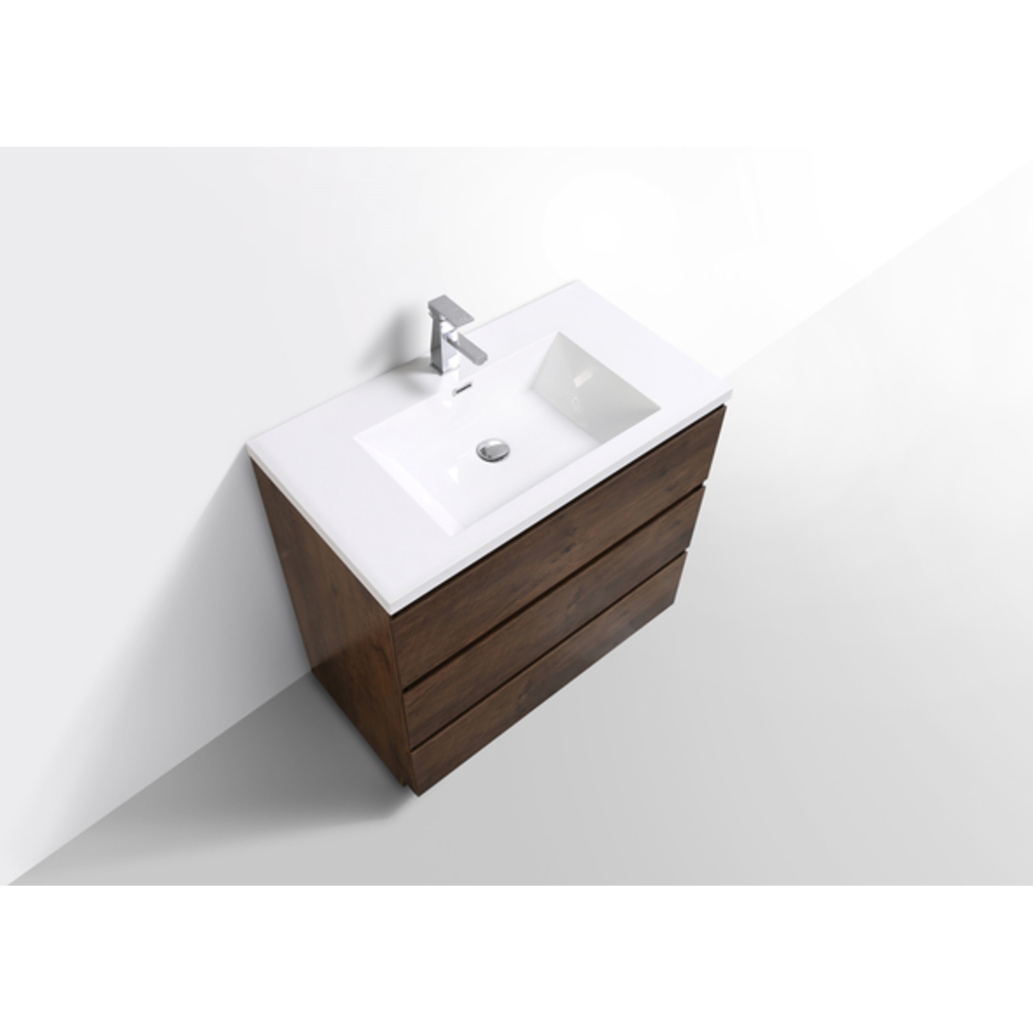 The MOA is one of the most elegant modern Bathroom Vanities around. This 36" model comes with a reinforced Acrylic sink, Marine Veneer Constructed Console that is fully moister and water proof, with high quality European DTC Hardware, that provides smooth 3 drawers.