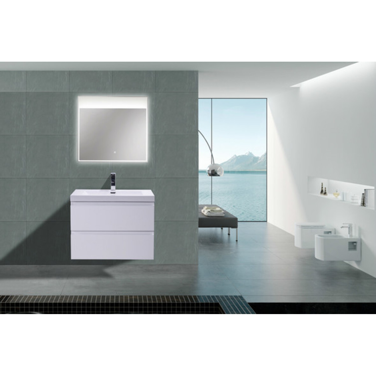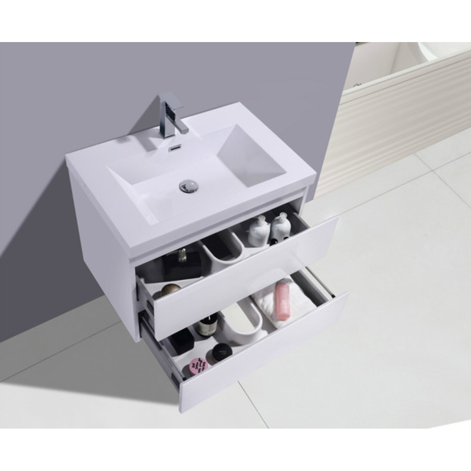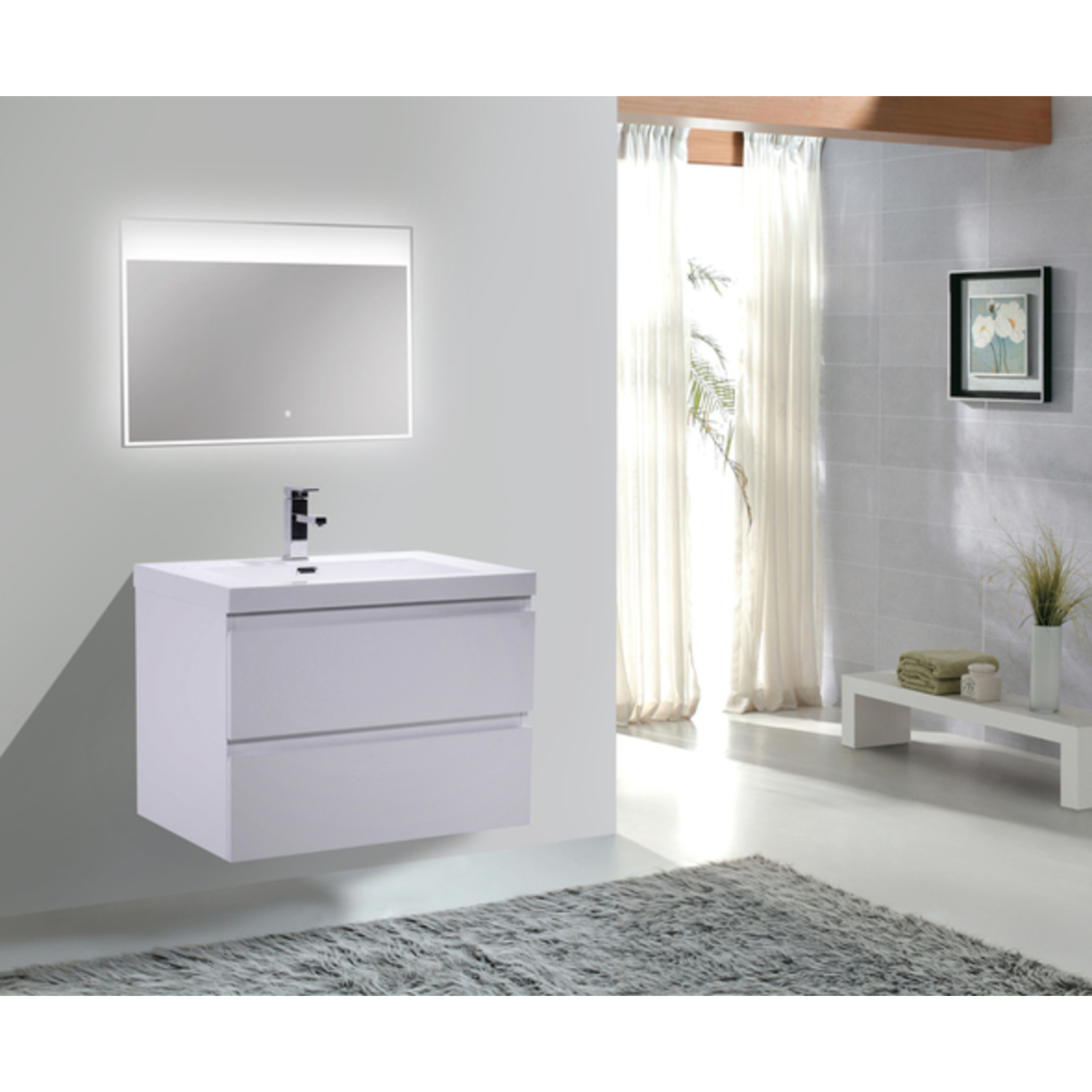 The Moreno is one of the most elegant modern Bathroom Vanities around. This 30" model comes with a reinforced Acrylic sink, Marine Veneer Constructed Console that is fully moister and water proof, with high quality European DTC Hardware, that provides smooth soft-closing operation drawers.