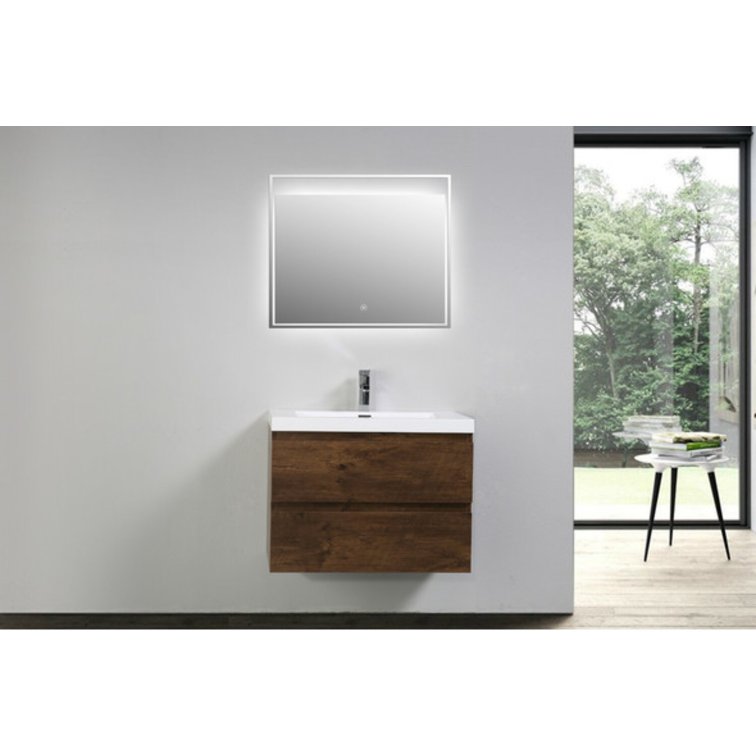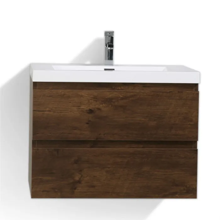 The Moreno is one of the most elegant modern Bathroom Vanities around. This 30" model comes with a reinforced Acrylic sink, Marine Veneer Constructed Console that is fully moister and water proof, with high quality European DTC Hardware, that provides smooth soft-closing operation drawers.